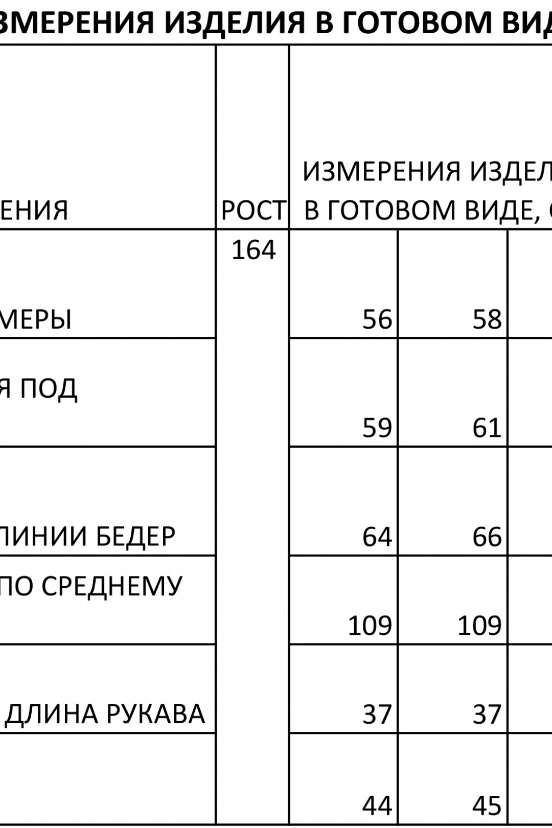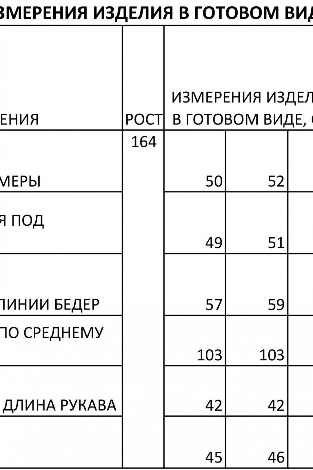 | 103 (размеры 50-54), 109 (размеры 56-60) | ширина плеча + длина рукава - 42 (размеры 50-54), 37 (размеры 56-60) |