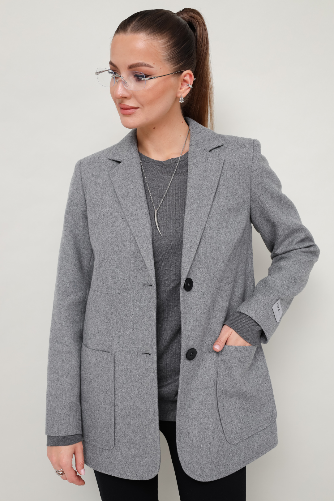 Стильный жакет полуприлегающего силуэта, выполнен из костюмной ткани. Воротник пиджачного типа с отложными лацканами. Застежка центральная на петли и пуговицы. Спереди обработаны накладные карманы, в области груди подрезы с нагрудными вытачками. Спинка с рельефами и средним швом, переходящим в шлицу. Рукава втачные двухшовные, на левом рукаве декоративная нашивка. Изделие на подкладке.