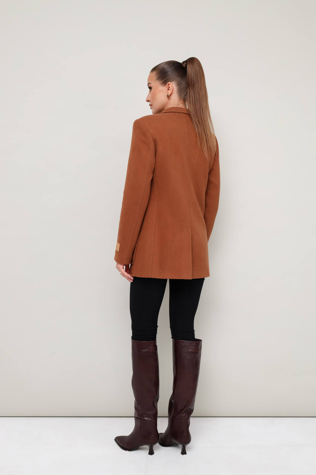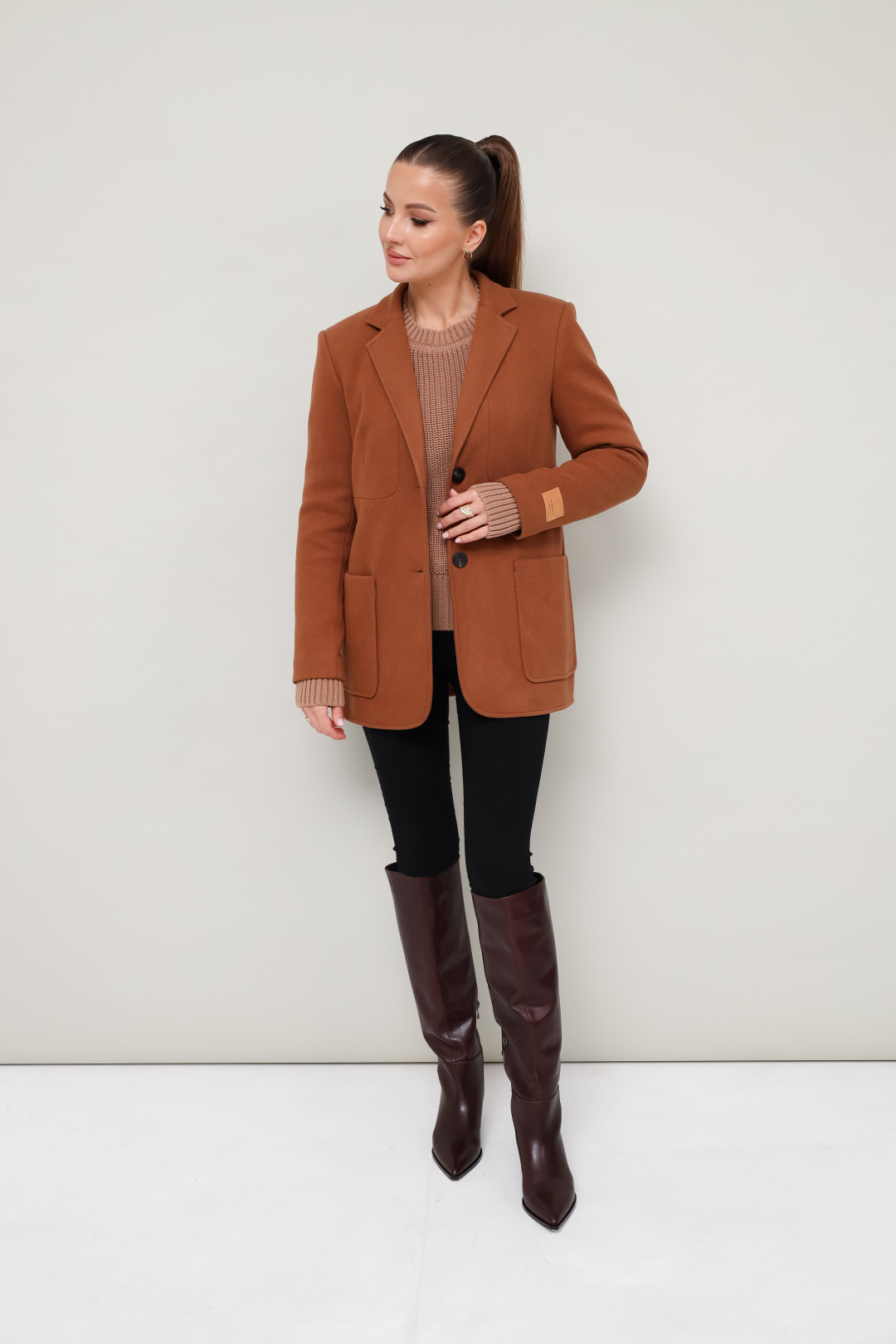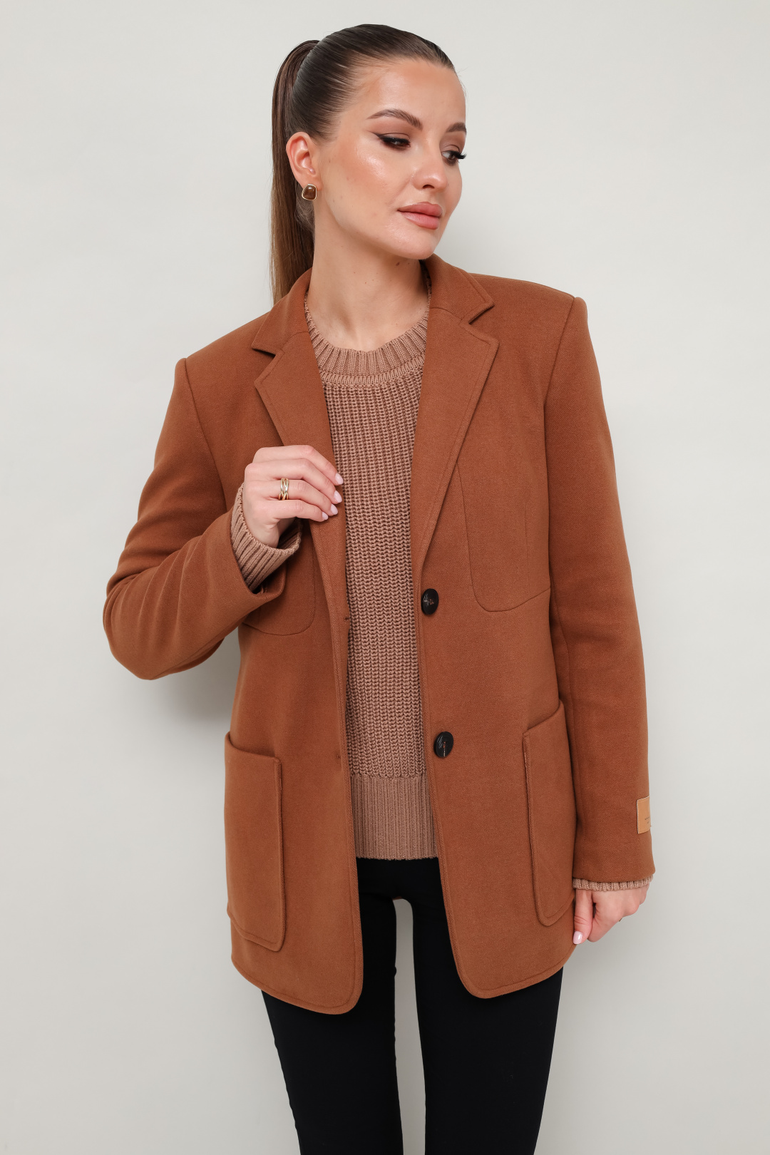 Стильный жакет полуприлегающего силуэта, выполнен из костюмной ткани. Воротник пиджачного типа с отложными лацканами. Застежка центральная на петли и пуговицы. Спереди обработаны накладные карманы, в области груди подрезы с нагрудными вытачками. Спинка с рельефами и средним швом, переходящим в шлицу. Рукава втачные двухшовные, на левом рукаве декоративная нашивка. Изделие на подкладке.