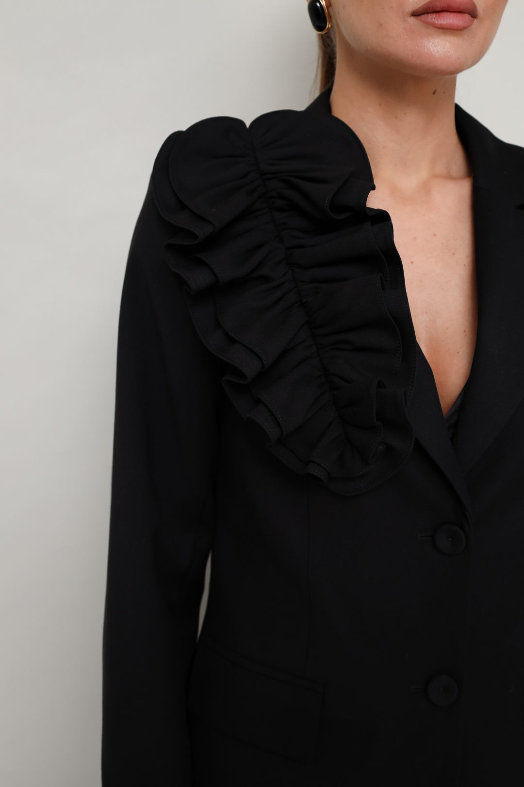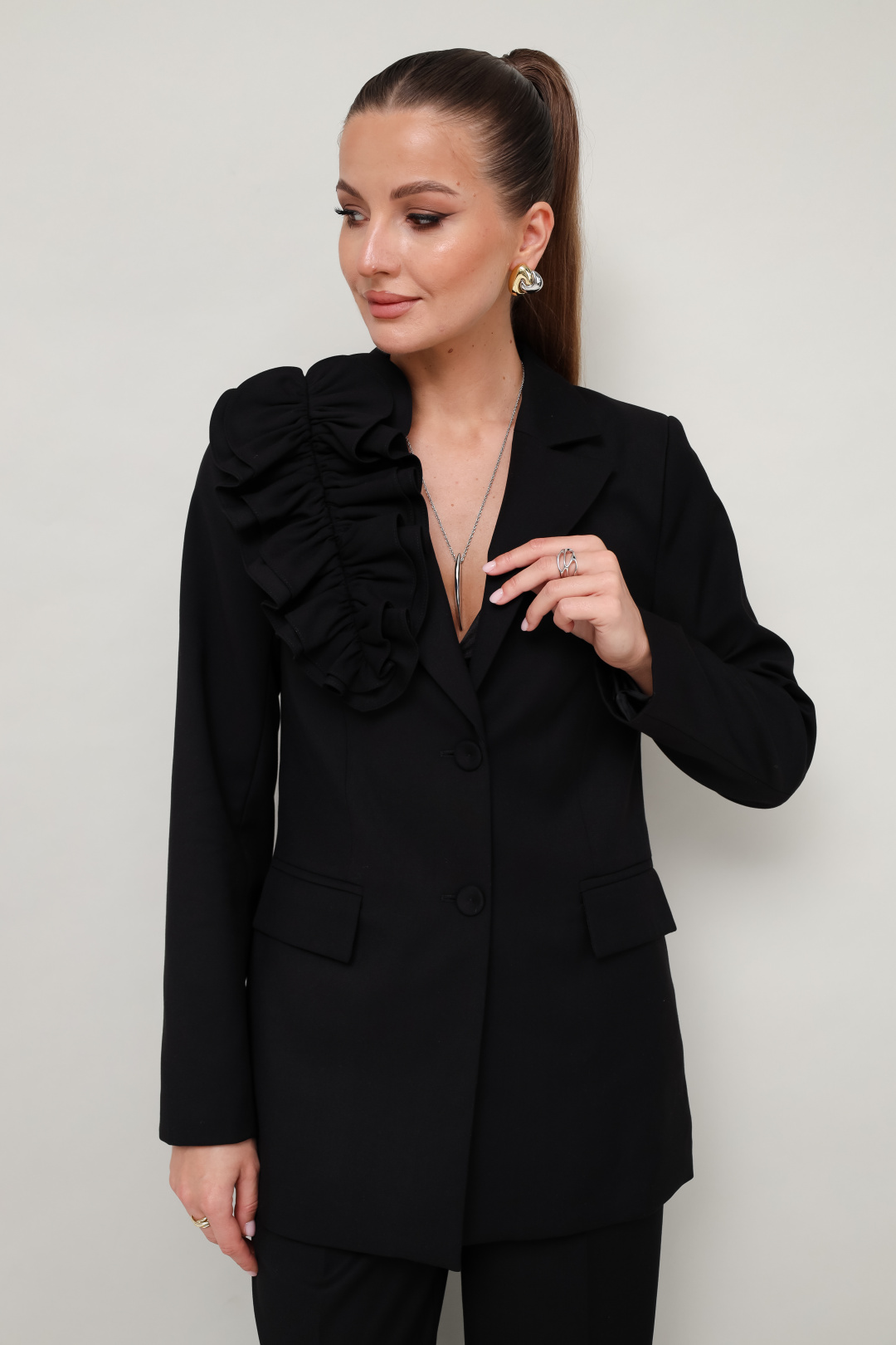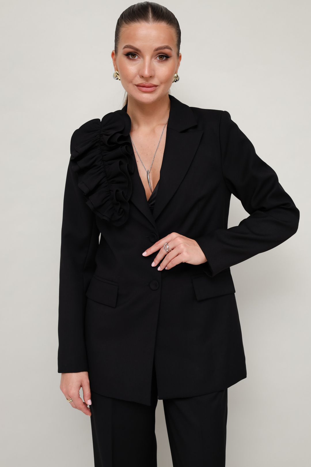 Эффектный 2-предметный комплект, состоящий из жакета и брюк, выполненный из костюмной ткани. Жакет женский полуприлегающего силуэта с центральной застежкой на петли и обтяжные пуговицы. Воротник пиджачного типа с отложными лацканами. Спереди обработаны прорезные карманы в рамку с клапанами. Рукава втачные двухшовные. Спинка со средним швом и рельефами. Изделие обработано подкладкой. Брюки прямого силуэта с заутюженными стрелками и с боковыми наклонными карманами. Пояс притачной с застежкой на пуговицу и тесьму-молнию, по спинке пояс на резинке для регуляции размера. В комплекте прилагается съемная брошь из основной ткани.