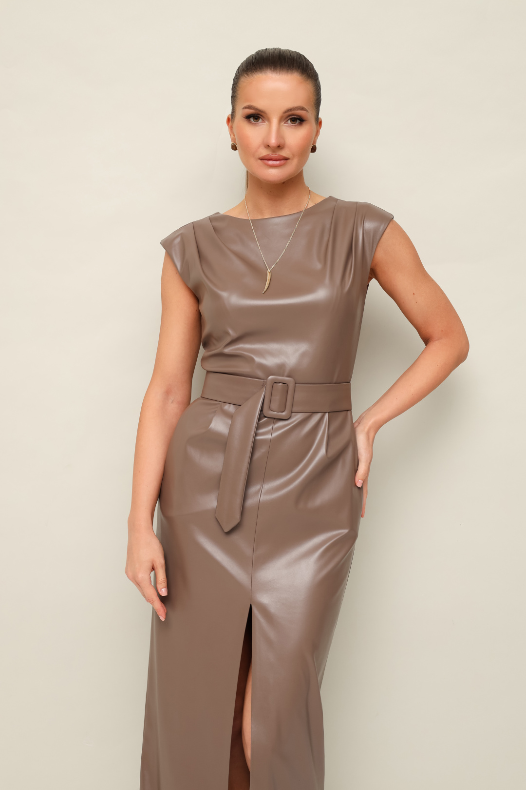 Стильное платье отрезное по линии талии в длине миди, выполнено из экокожи. Округлый вырез горловины. По плечевым швам лифа и по талии обработаны защипы. Юбка со средним швом, переходящим в разрез. Спинка в V-образным вырезом. В среднем шве застёжка на потайную тесьму молнию. В комплекте прилагается пояс из основной ткани с обтяжной пряжкой.
