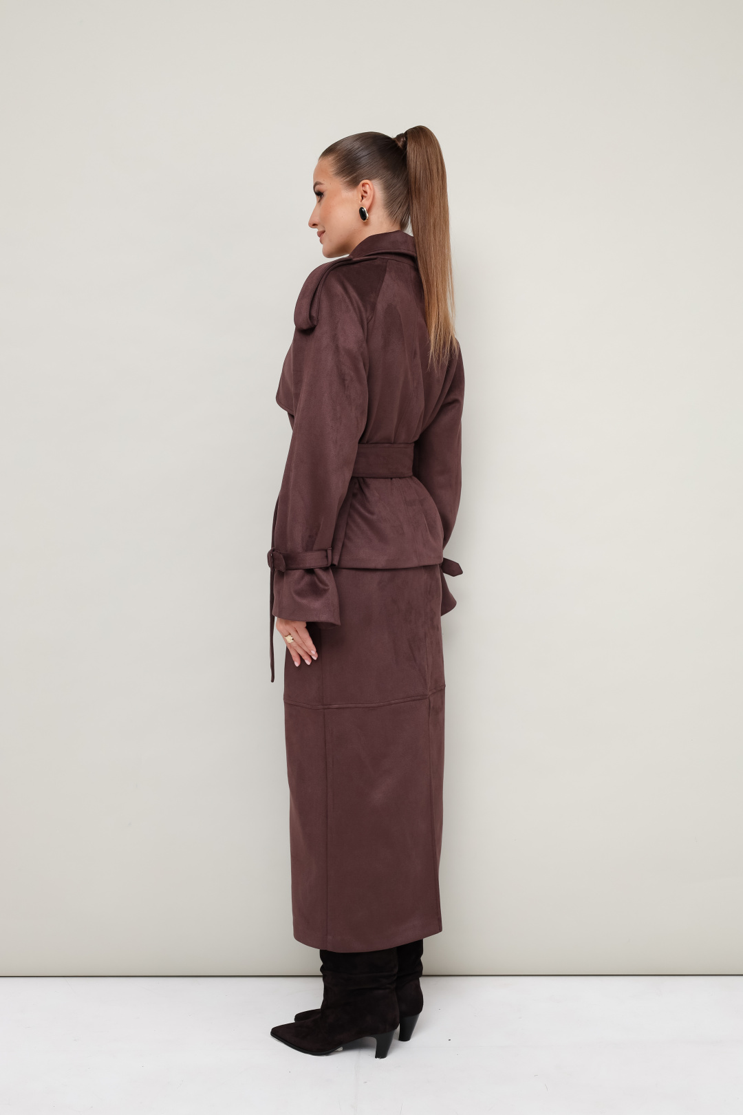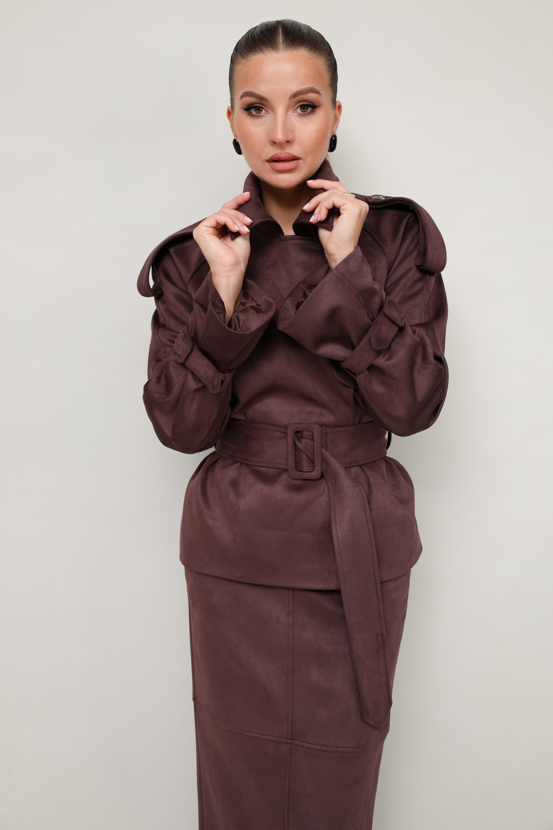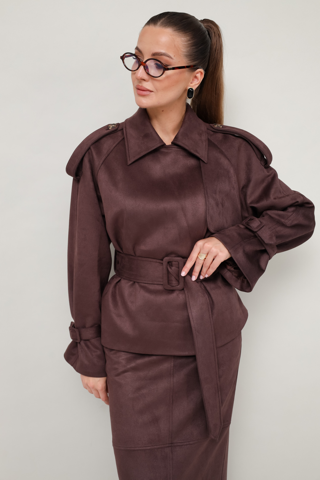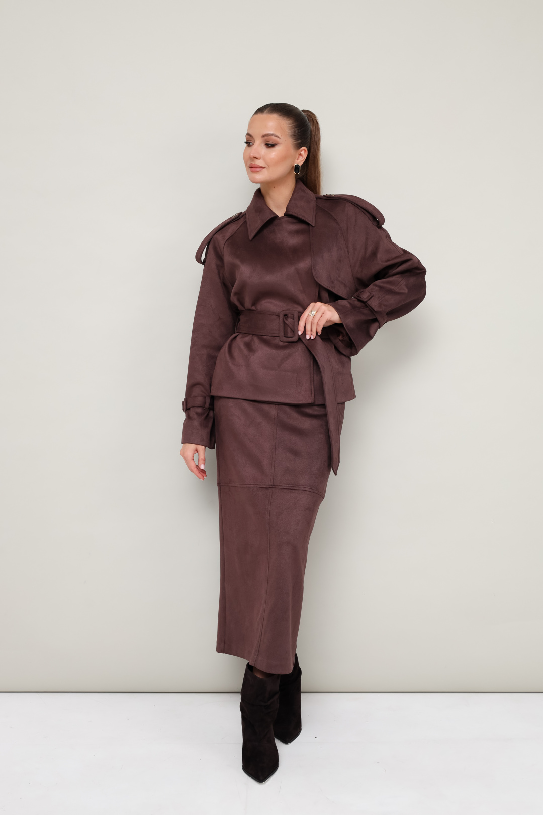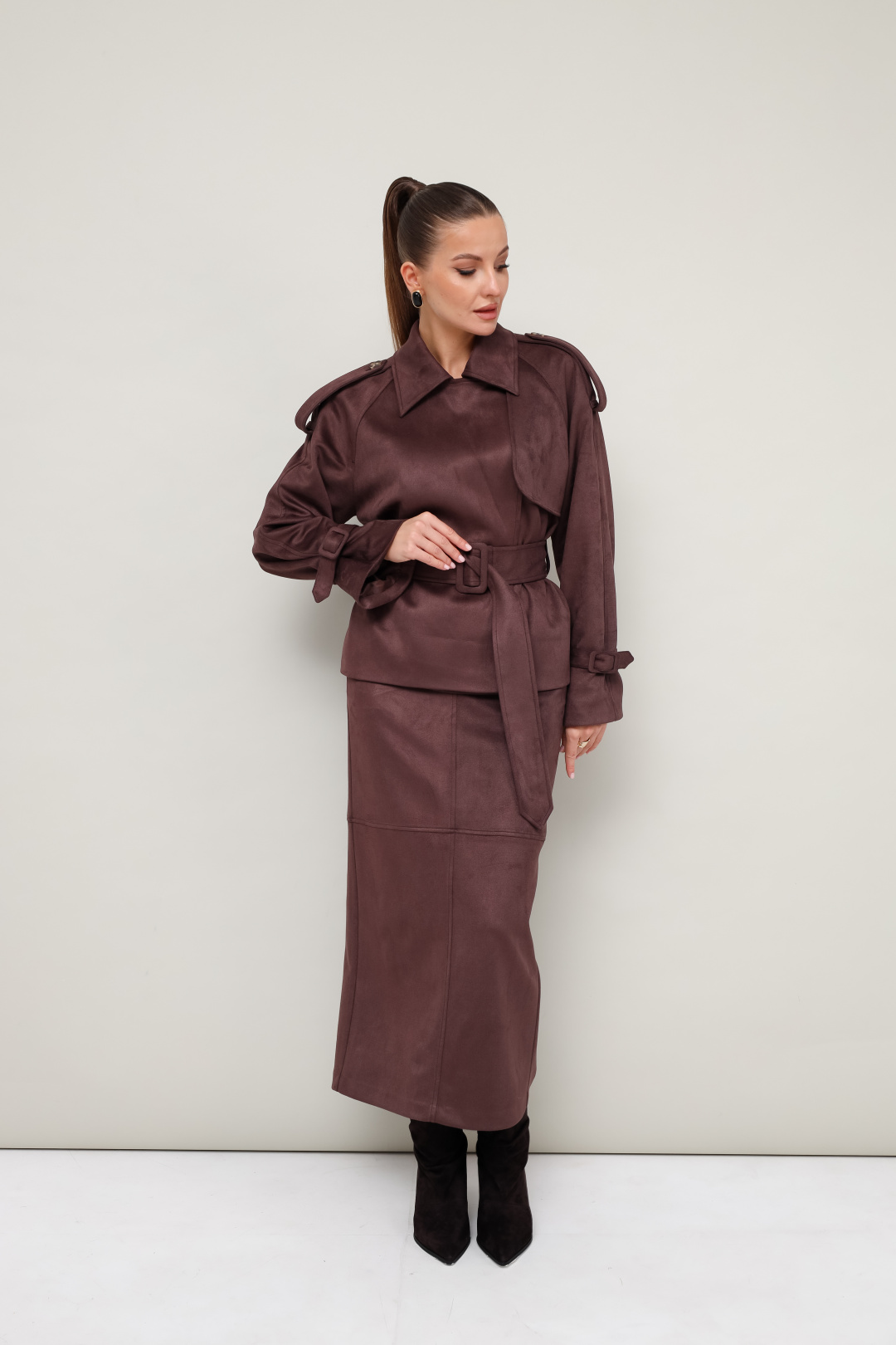 Стильный 2-предметный комплект, состоящий из жакета и юбки, выполненный из экозамши.