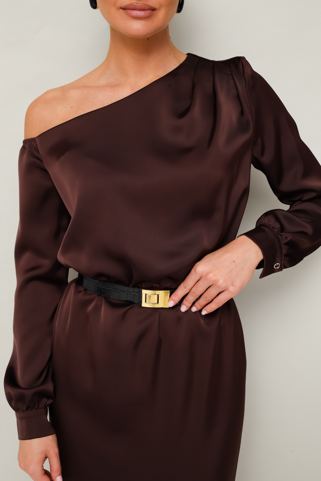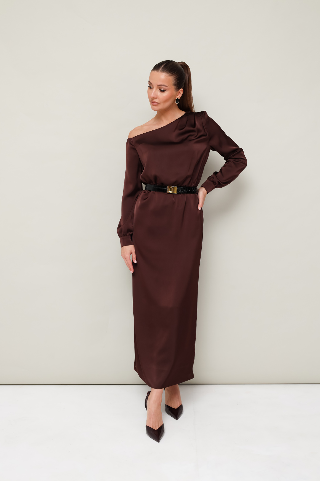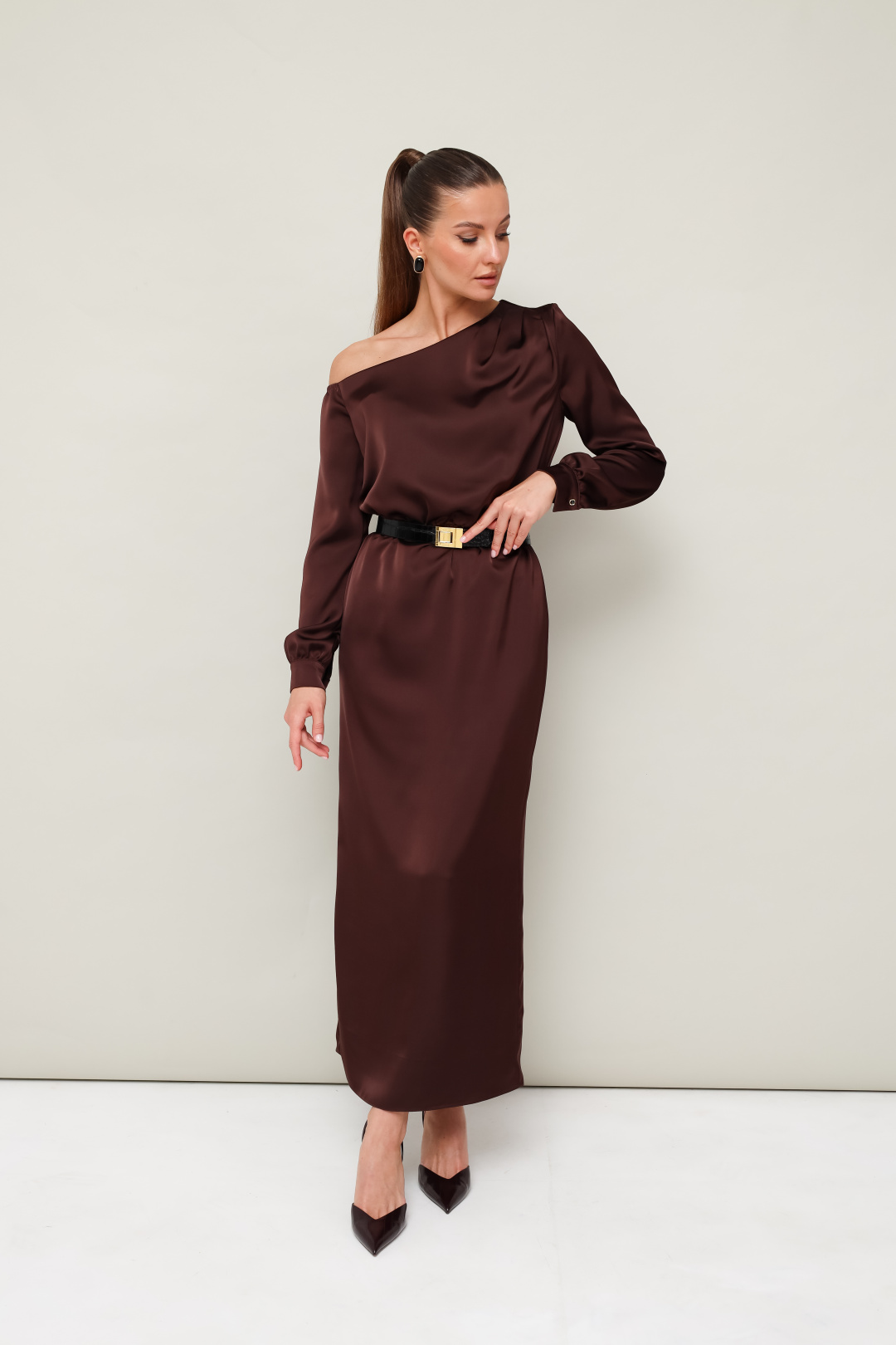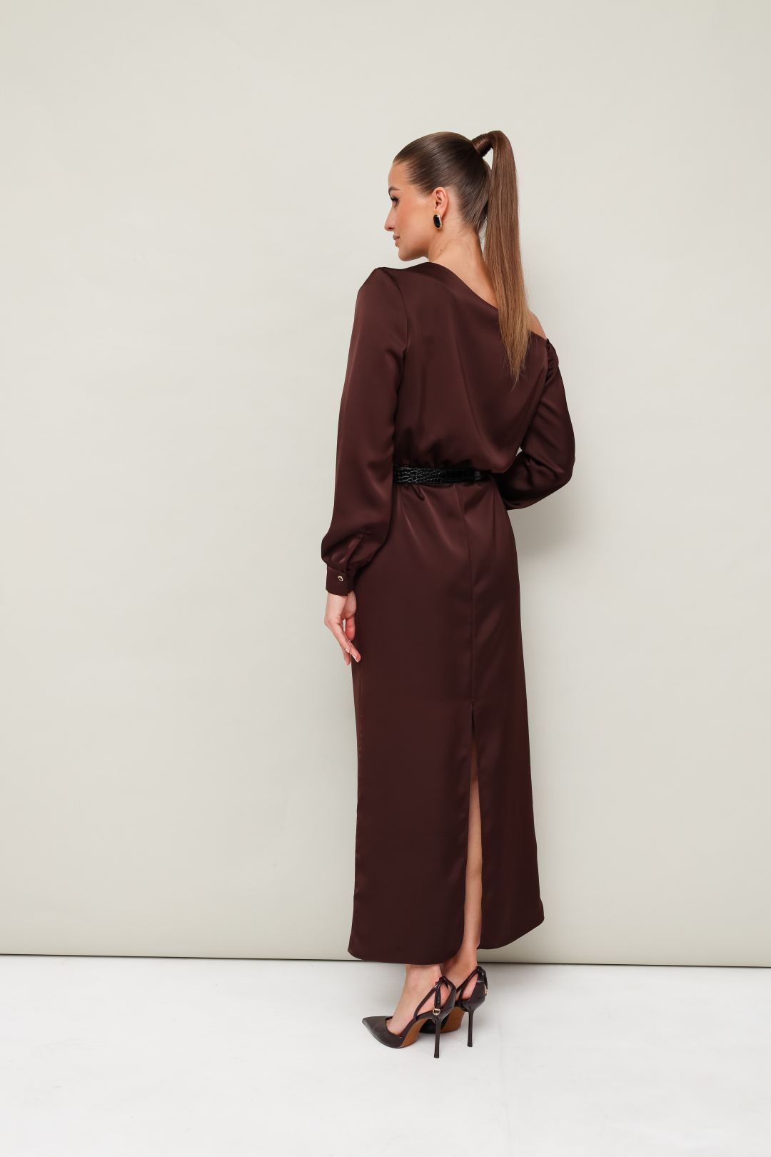 Вечернее платье полуприлегающего силуэта, выполнено из струящейся ткани с благородным матовым блеском. Ассиметричный вырез горловины с открытым плечом. Правый плечевой шов декорирован складками. Платье отрезное по линии талии на резинке. Рукава длиннные с манжетами с застежкой на петли и пуговицы. По спинке в среднем шве юбки обработан разрез.
