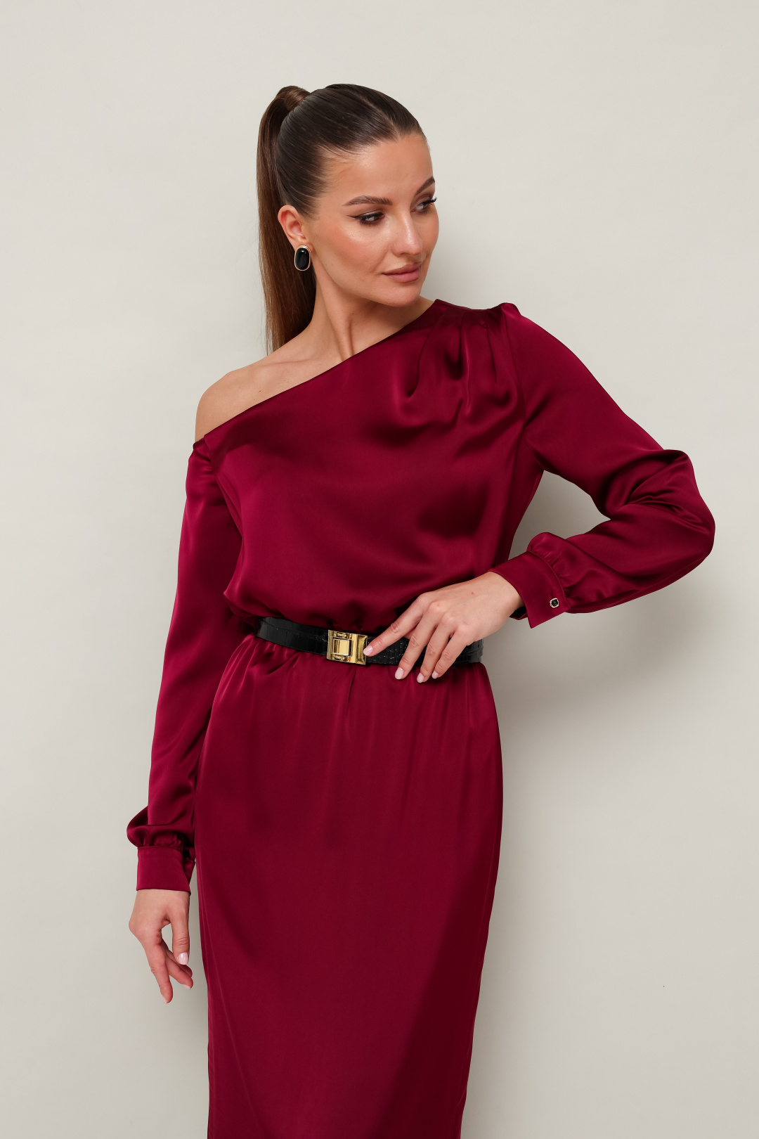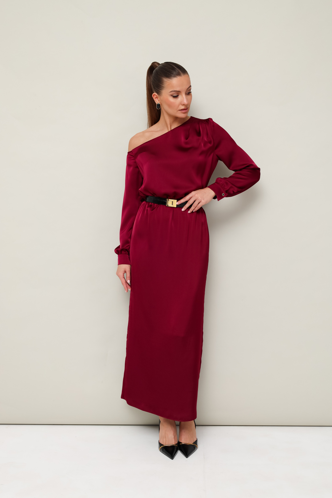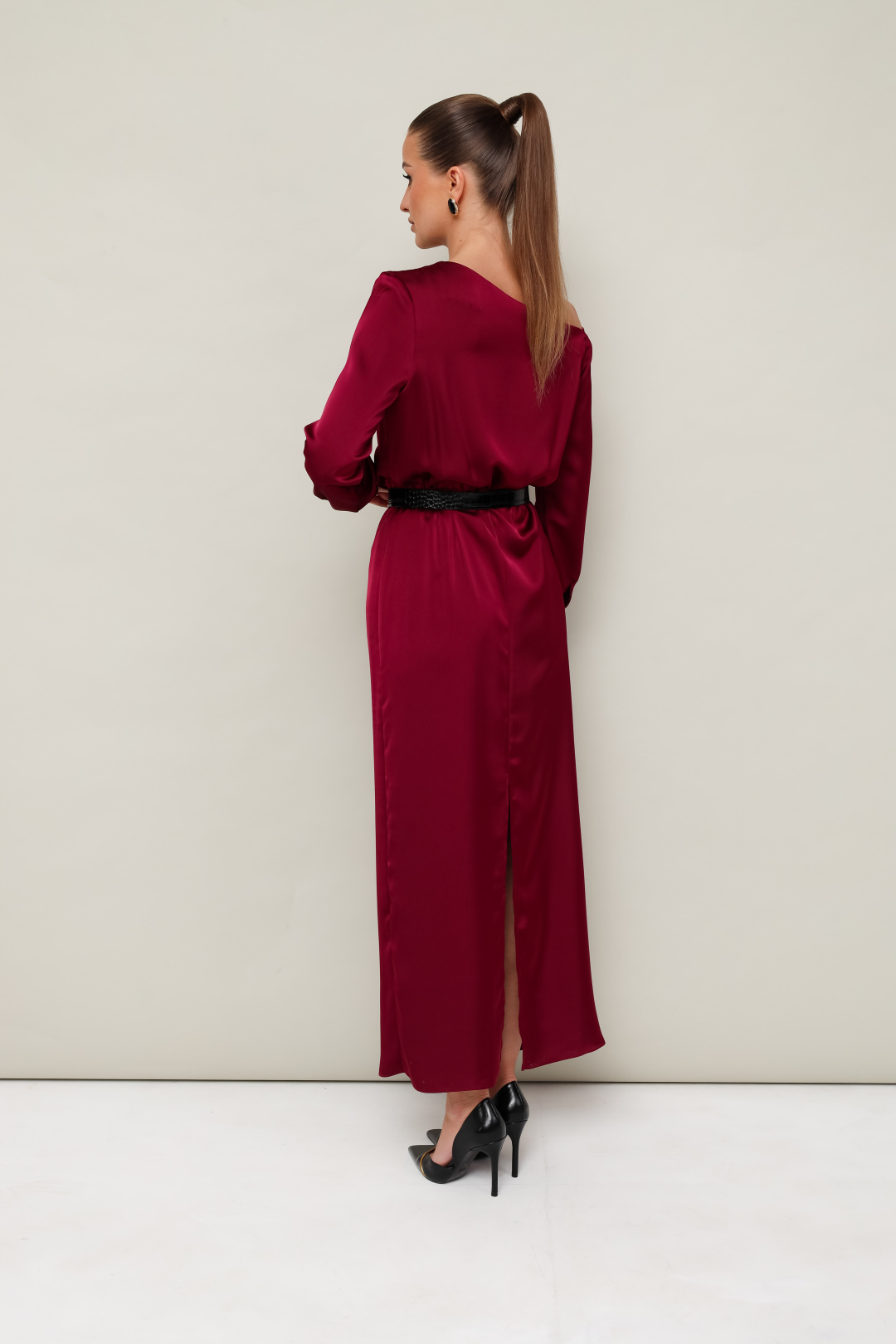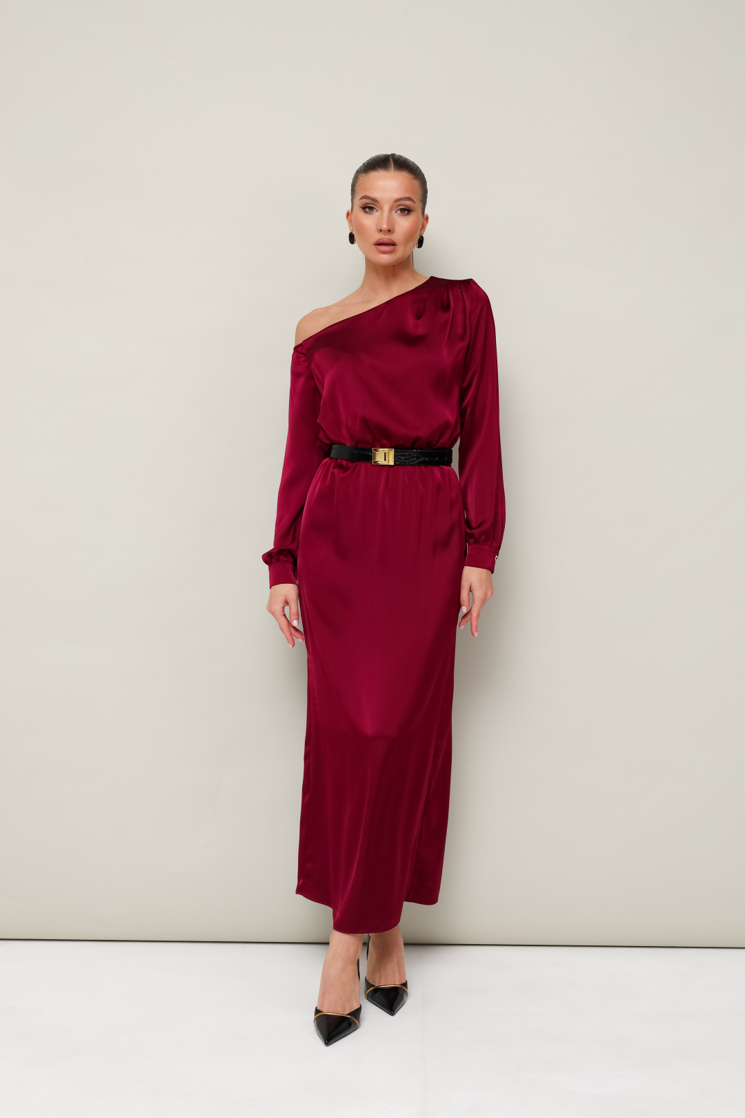 Вечернее платье полуприлегающего силуэта, выполнено из струящейся ткани с благородным матовым блеском. Ассиметричный вырез горловины с открытым плечом. Правый плечевой шов декорирован складками. Платье отрезное по линии талии на резинке. Рукава длиннные с манжетами с застежкой на петли и пуговицы. По спинке в среднем шве юбки обработан разрез.