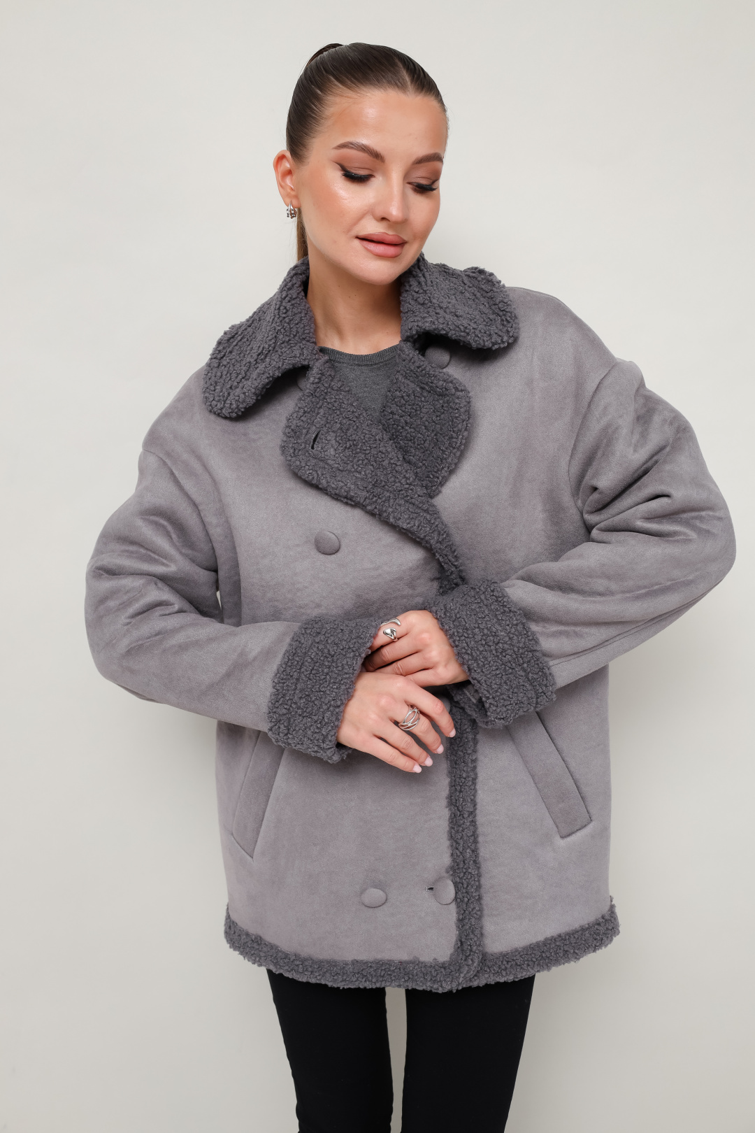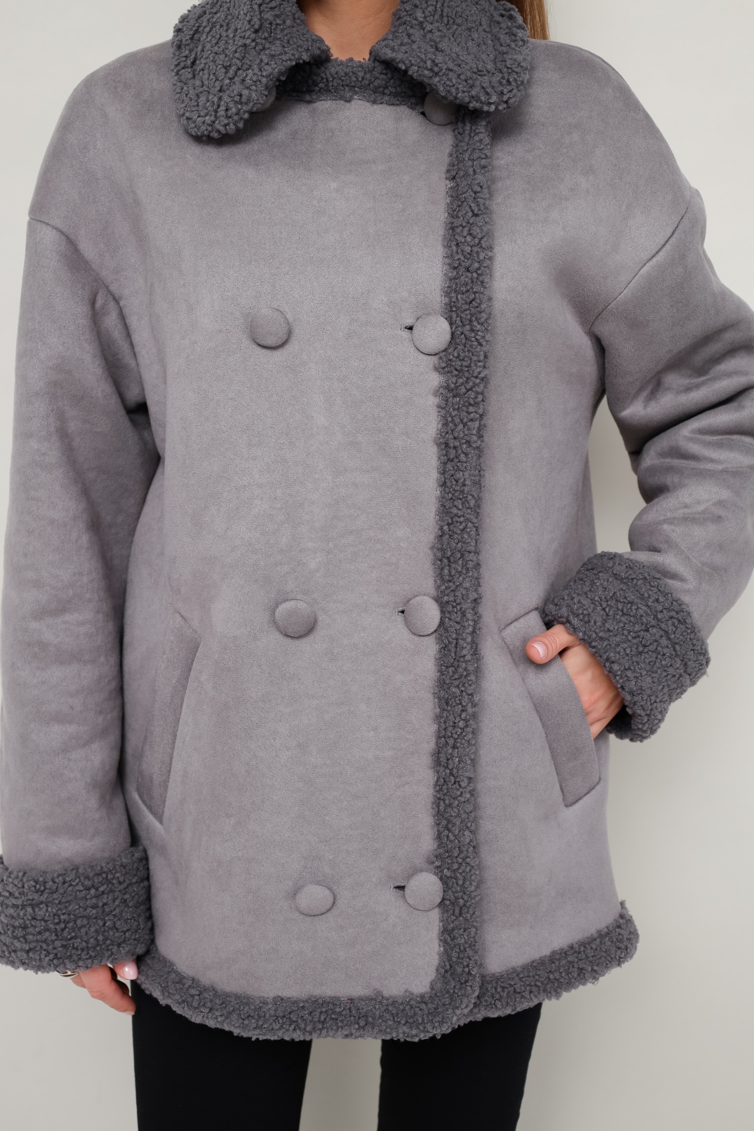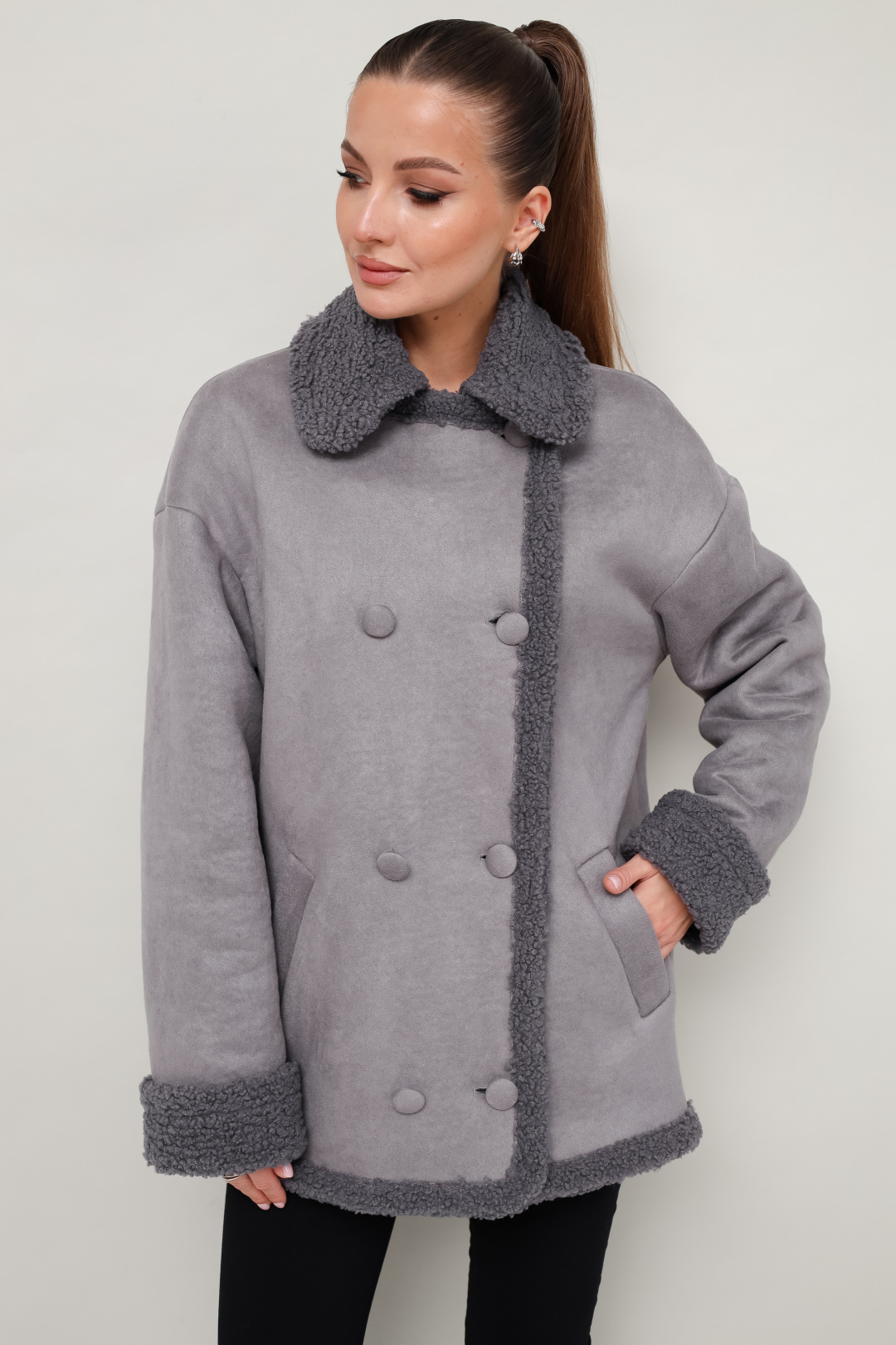 Дубленка декорирована искусственным мехом, который придает образу благородную мягкость и уют.