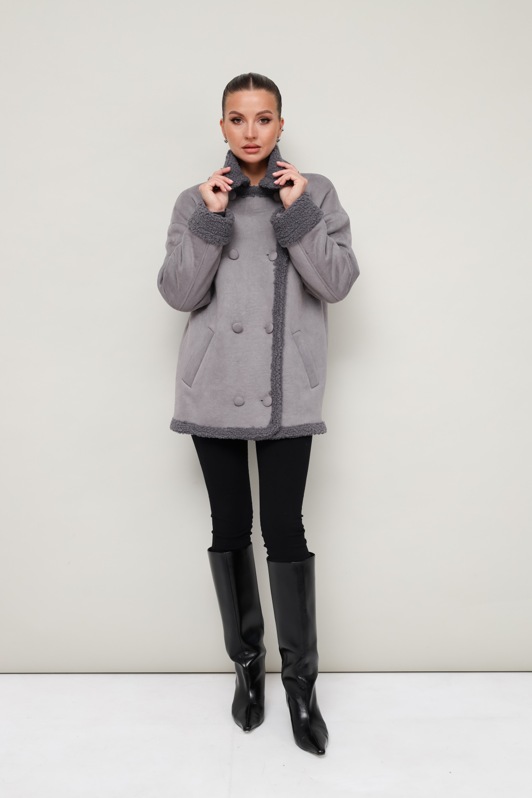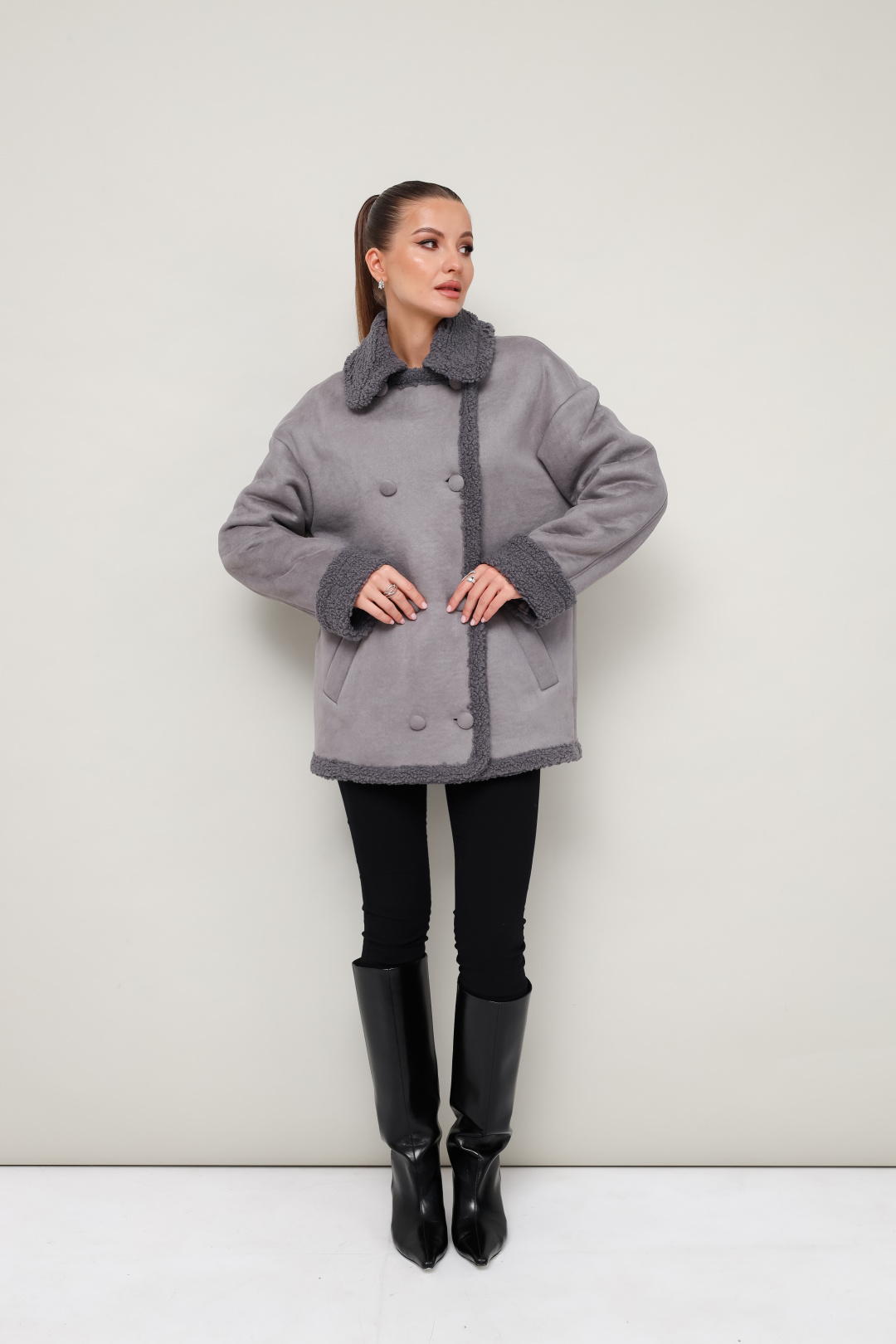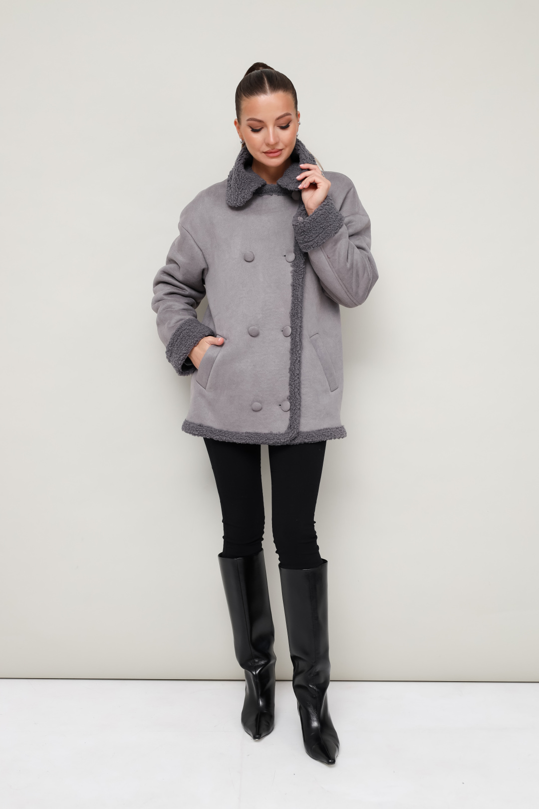 Дубленка декорирована искусственным мехом, который придает образу благородную мягкость и уют.