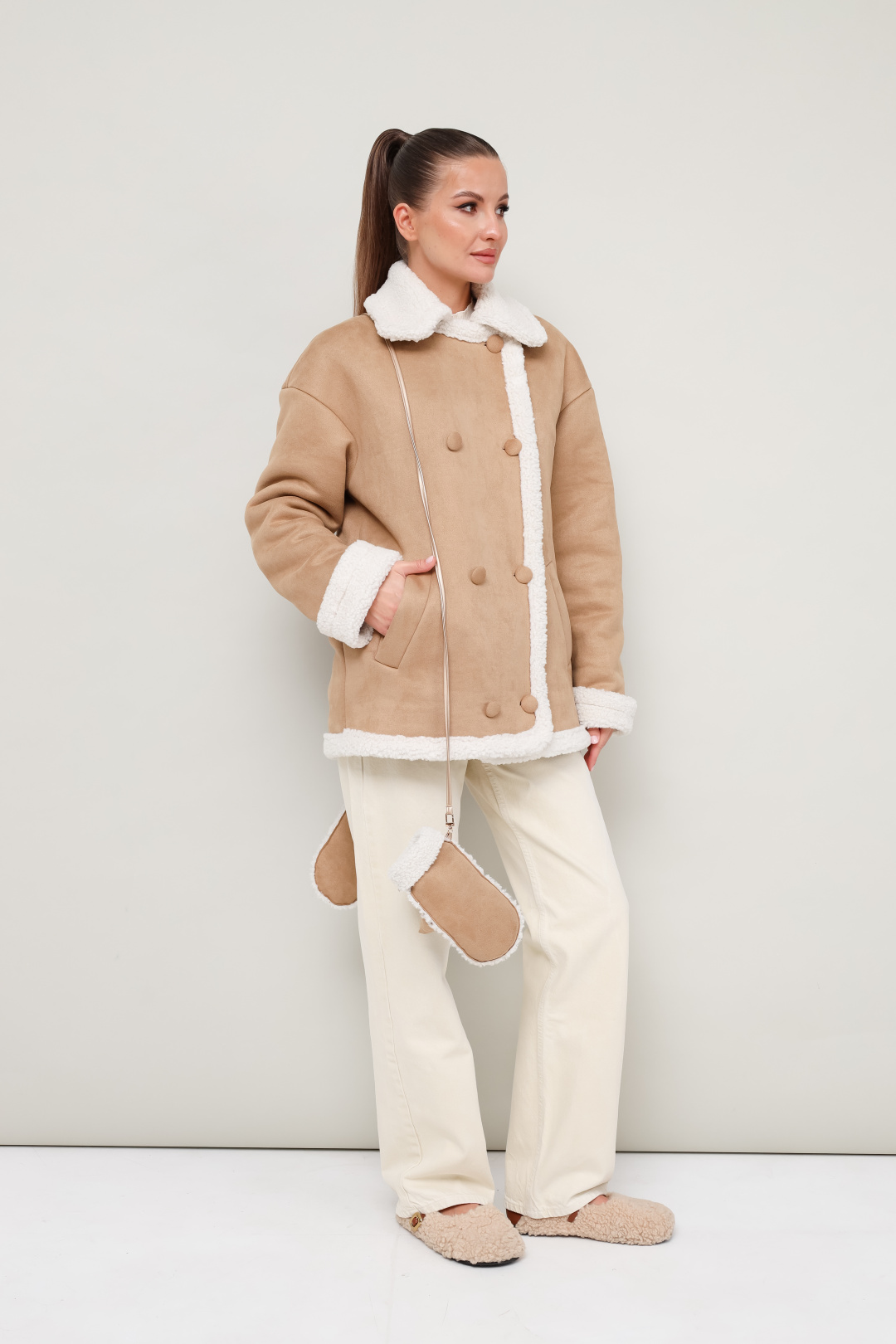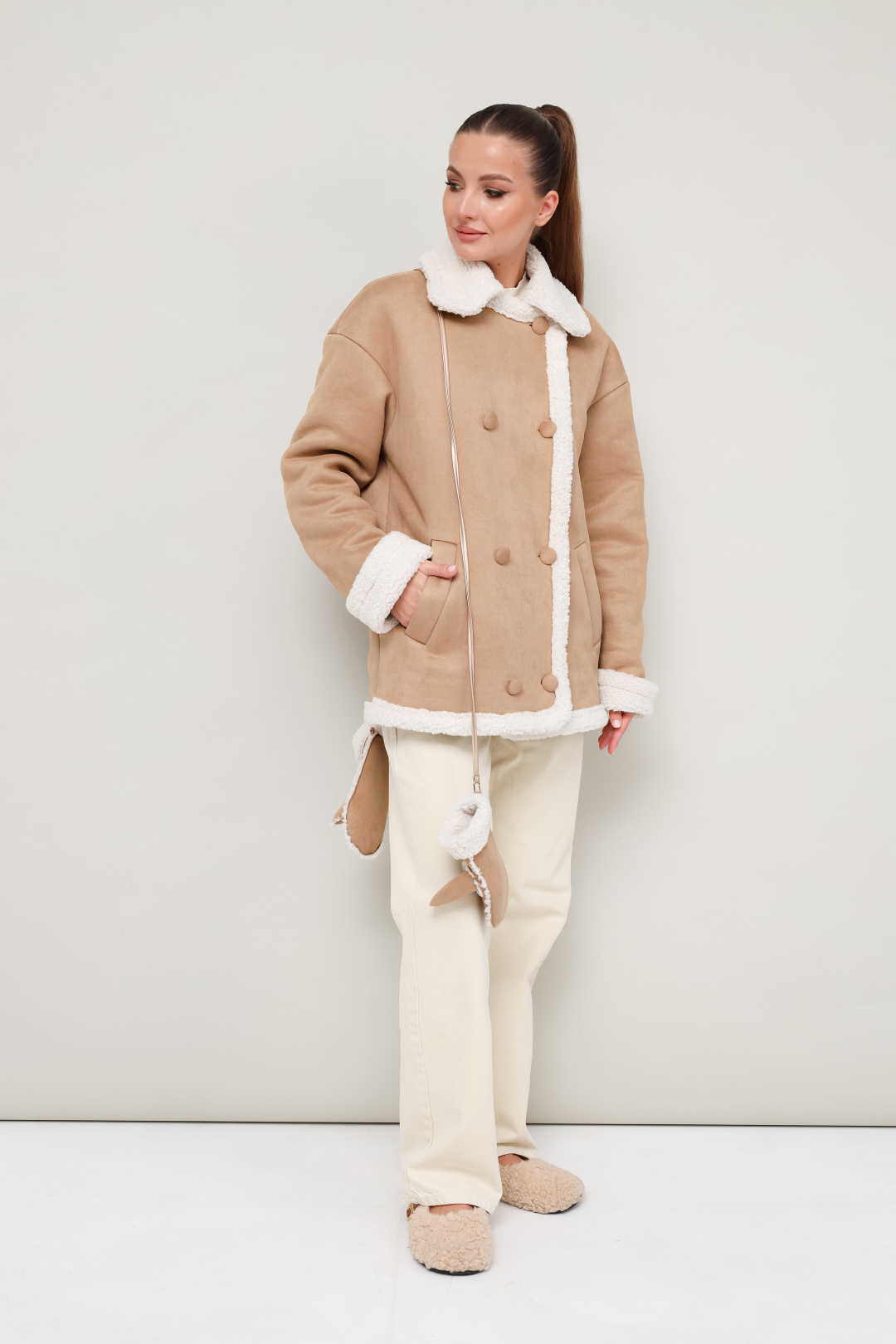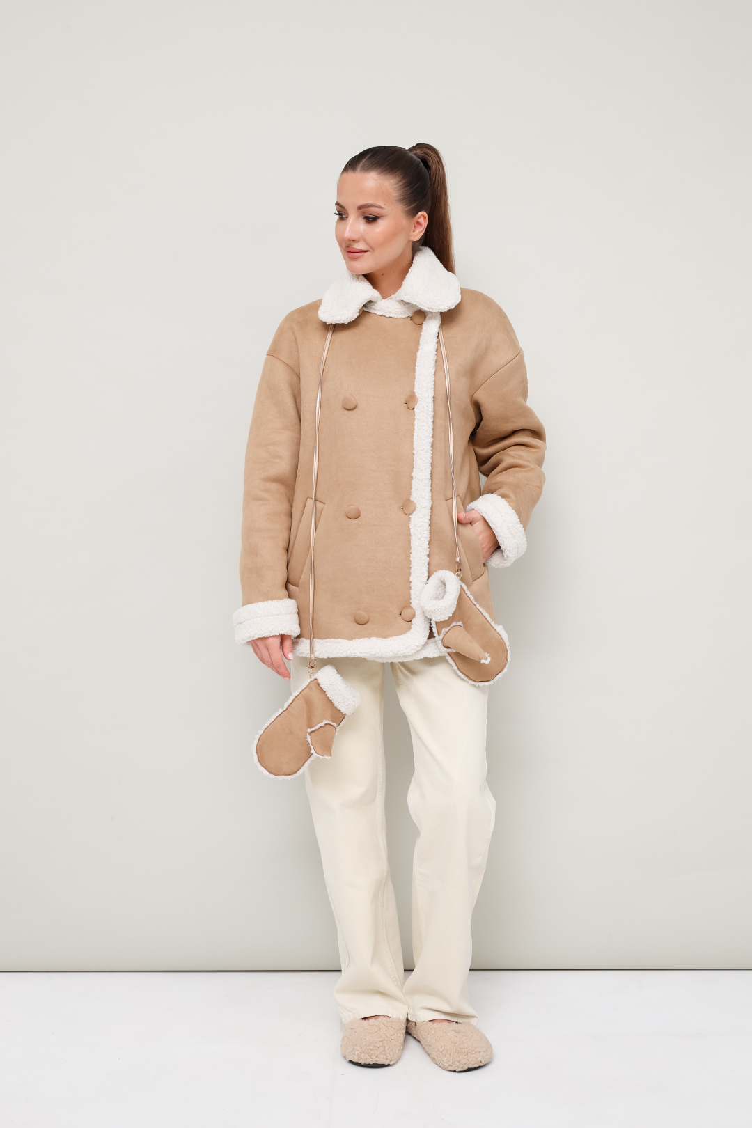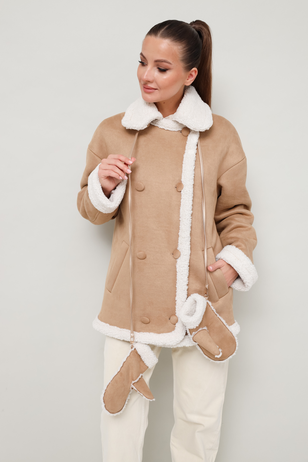 Дубленка декорирована искусственным мехом, который придает образу благородную мягкость и уют.Рукавицы из искусственного меха с отложными манжетами. Стильный и акцентный аксессуар, который гармонично дополнит образ с дубленкой. В комплекте шнур с креплением на карабин.