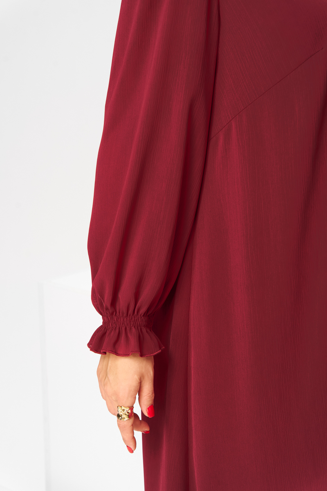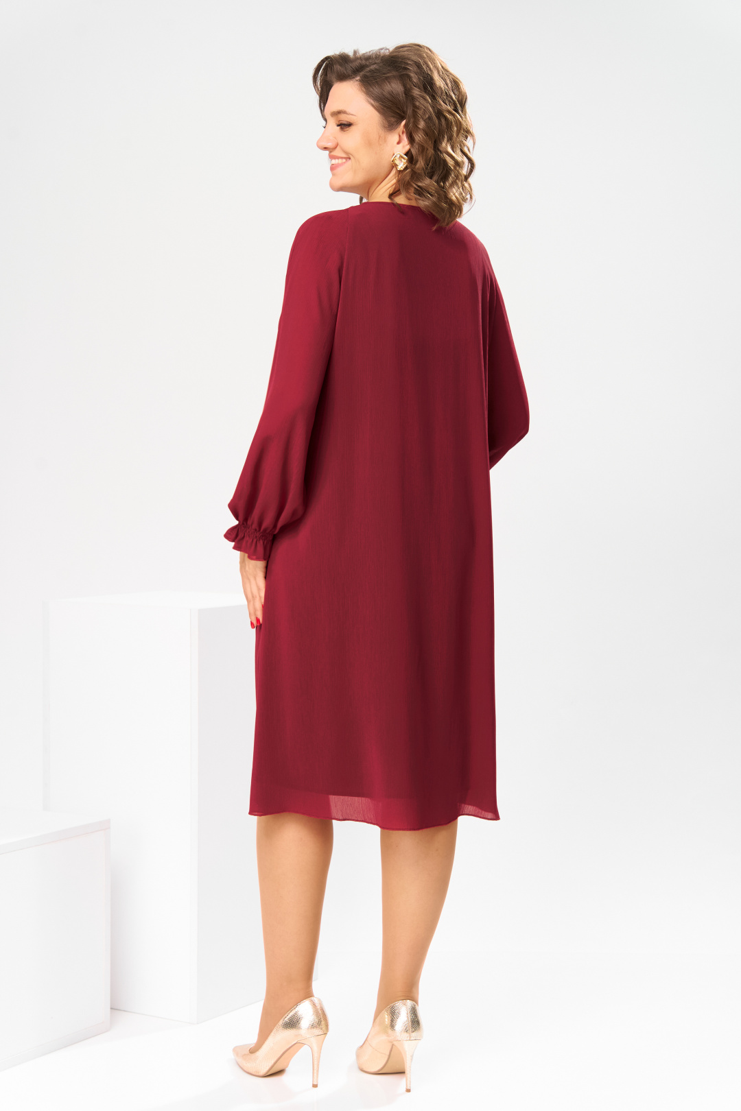 Платье женское расширенное к низу, длиной за колено. Перед с двумя нагрудными вытачками, с разрезом по центру, фиксирующимся на 10 навесных петель и 10 пришивных пуговиц с одной бантовой складкой, выходящей из-под разреза. Спинка цельнокроеная. Горловина круглая, обтачная, без воротника. Рукав полуреглан, втачной, длинный, одношовный, низ рукава собран на эластичную тесьму. Платье на подкладке. Длина спинки 107 см. Длина рукава от горловины 67 см