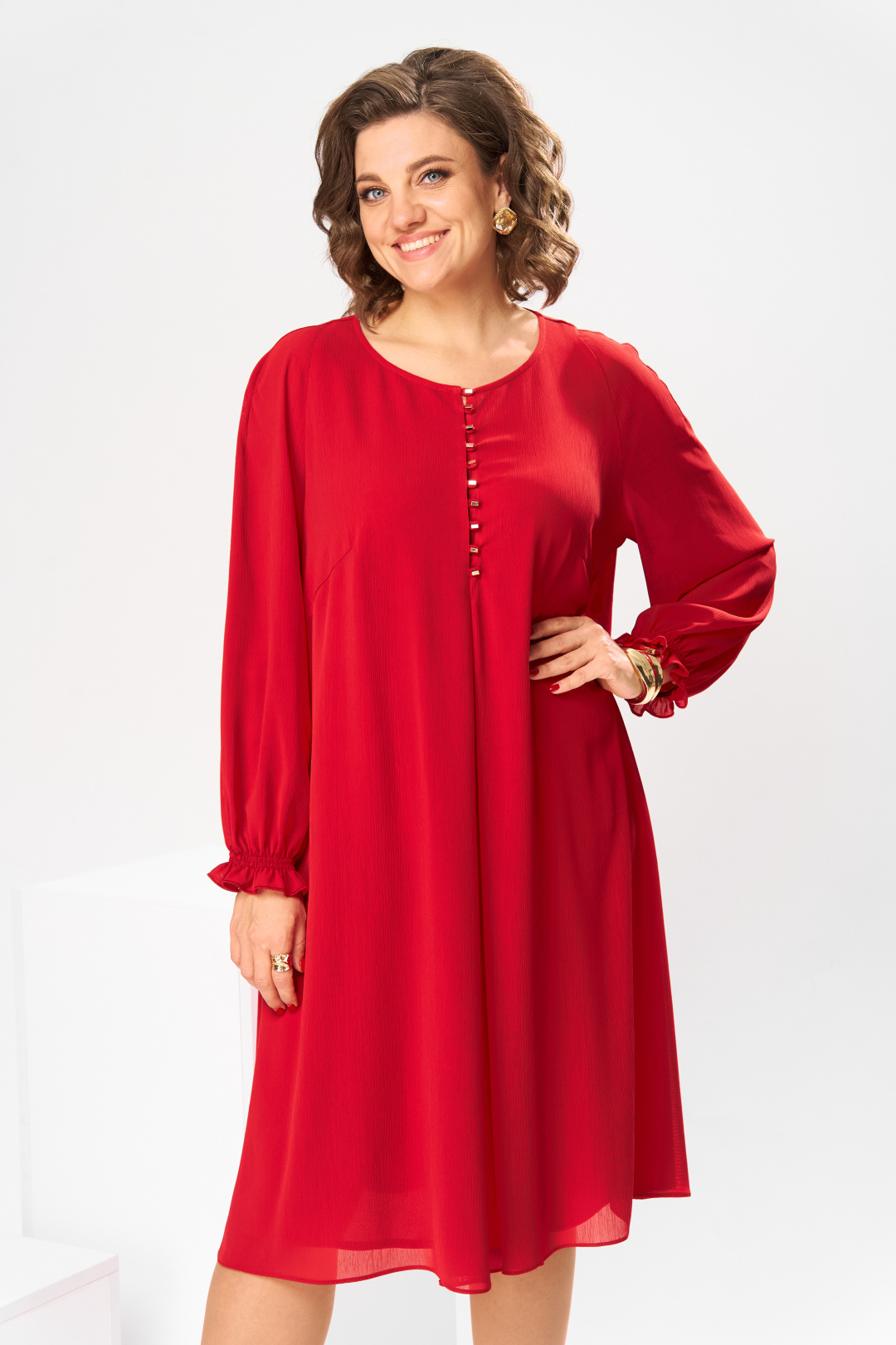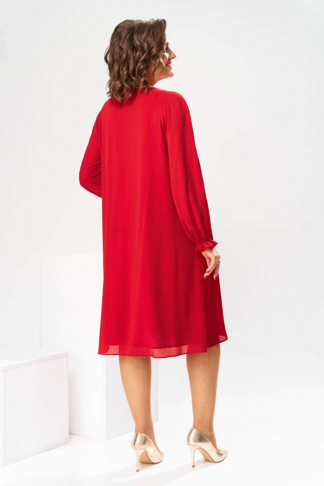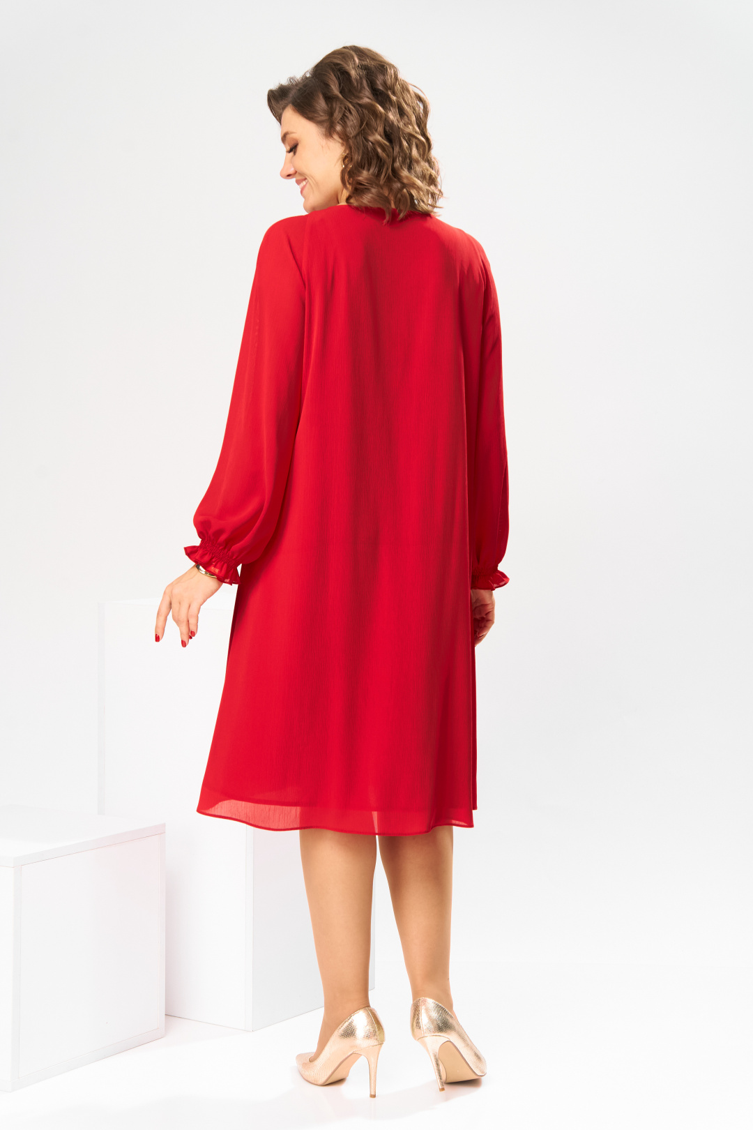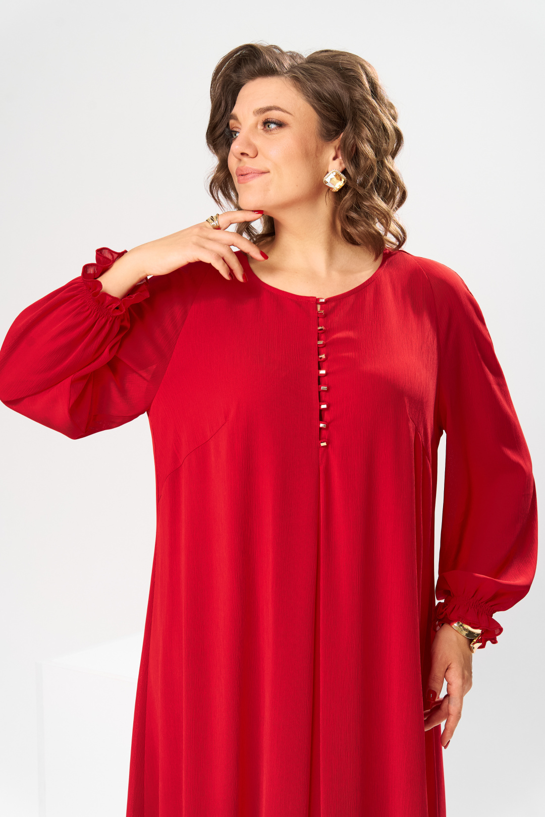 Платье женское расширенное к низу, длиной за колено. Перед с двумя нагрудными вытачками, с разрезом по центру, фиксирующимся на 10 навесных петель и 10 пришивных пуговиц с одной бантовой складкой, выходящей из-под разреза. Спинка цельнокроеная. Горловина круглая, обтачная, без воротника. Рукав полуреглан, втачной, длинный, одношовный, низ рукава собран на эластичную тесьму. Платье на подкладке. Длина спинки 107 см. Длина рукава от горловины 67 см