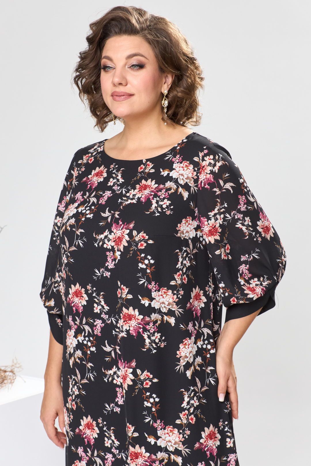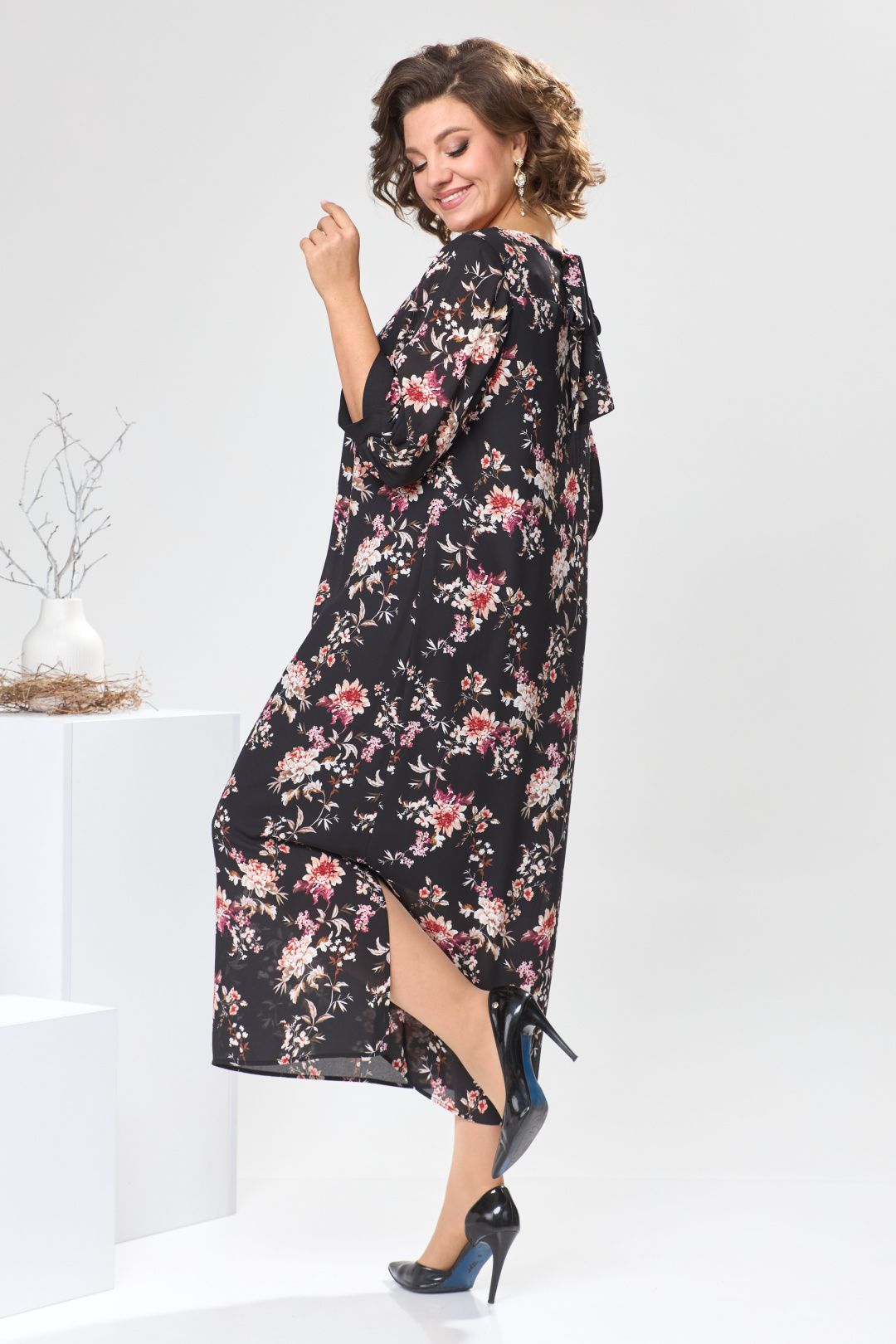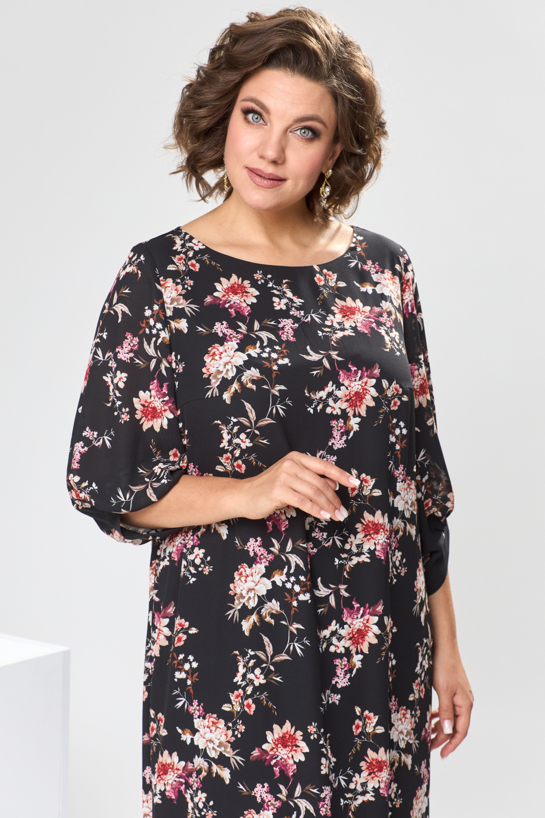 Платье женское относится к нарядной торжественной одежде. Платье женское прямого силуэта, длиной до нижней части икры. Перед с 2-мя нагрудными вытачками. Спинка с отрезной кокеткой с фигурным обтачным разрезом, фиксирующимся по горловине на 2-е обточные завязки. Горловина круглая, обтачная, без воротника. Рукав втачной, одношовный, длиной 3/4 с фигурным низом с 14-ю односторонними складками (по 7 с каждой стороны от угла манжеты), с притачной манжетой из отделочной ткани. Боковые швы с разрезами. Платье на подкладке. Платье без плечевых накладок.