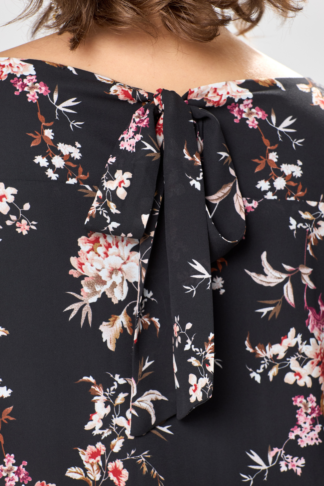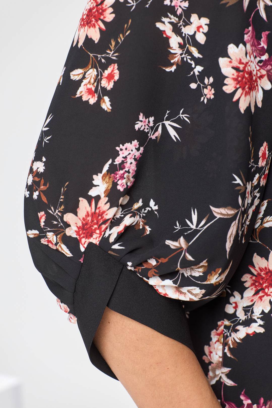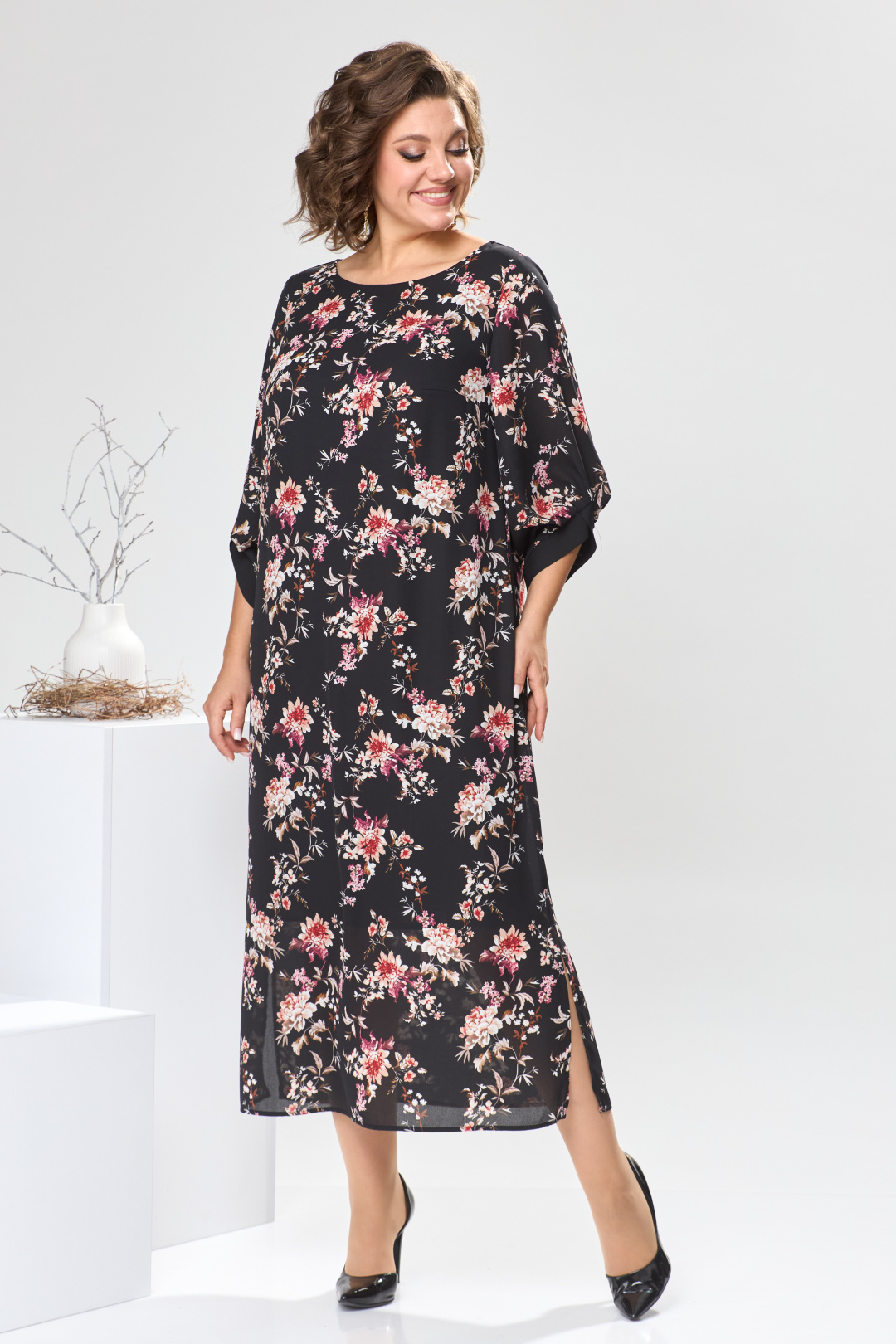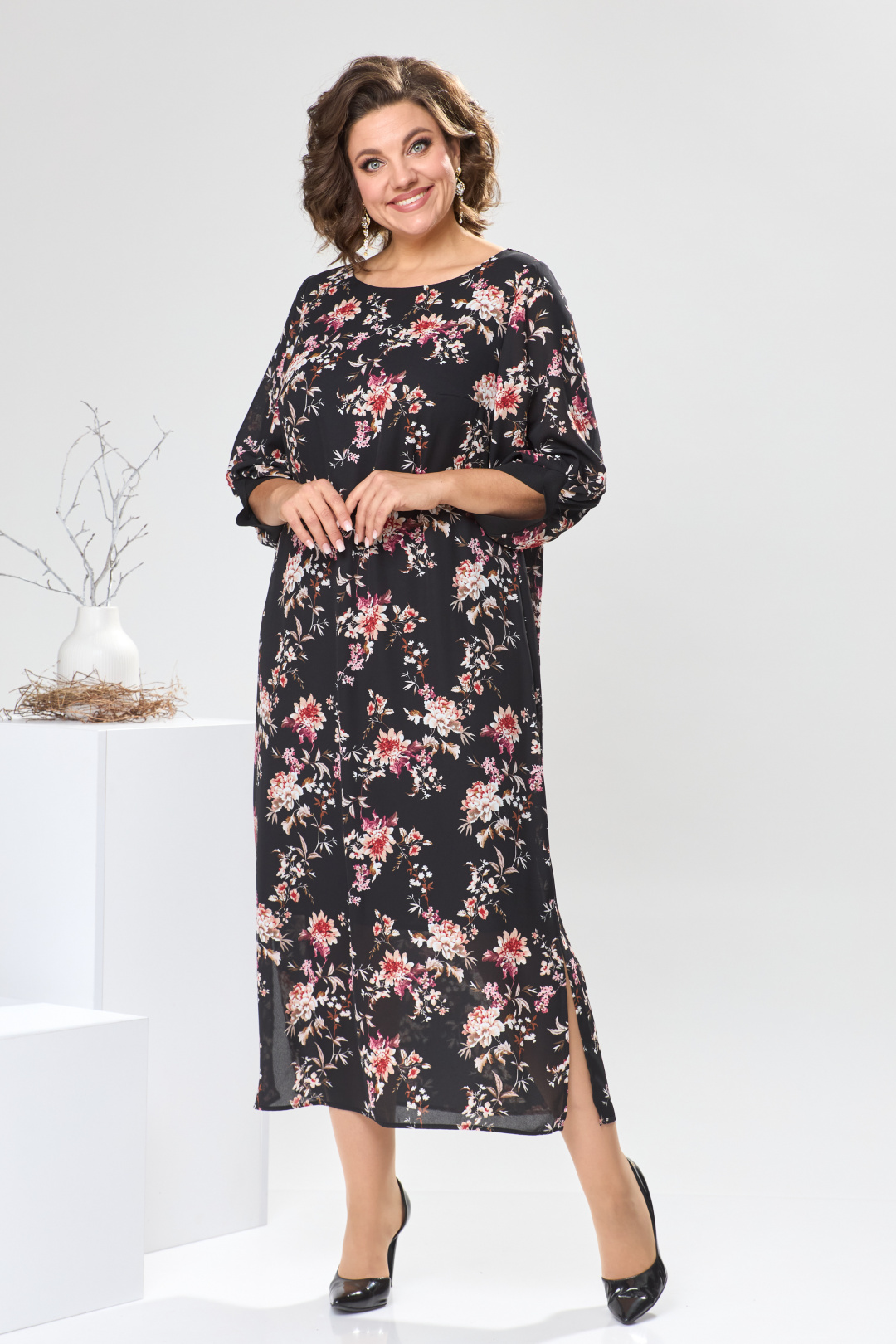Платье женское относится к нарядной торжественной одежде. Платье женское прямого силуэта, длиной до нижней части икры. Перед с 2-мя нагрудными вытачками. Спинка с отрезной кокеткой с фигурным обтачным разрезом, фиксирующимся по горловине на 2-е обточные завязки. Горловина круглая, обтачная, без воротника. Рукав втачной, одношовный, длиной 3/4 с фигурным низом с 14-ю односторонними складками (по 7 с каждой стороны от угла манжеты), с притачной манжетой из отделочной ткани. Боковые швы с разрезами. Платье на подкладке. Платье без плечевых накладок.