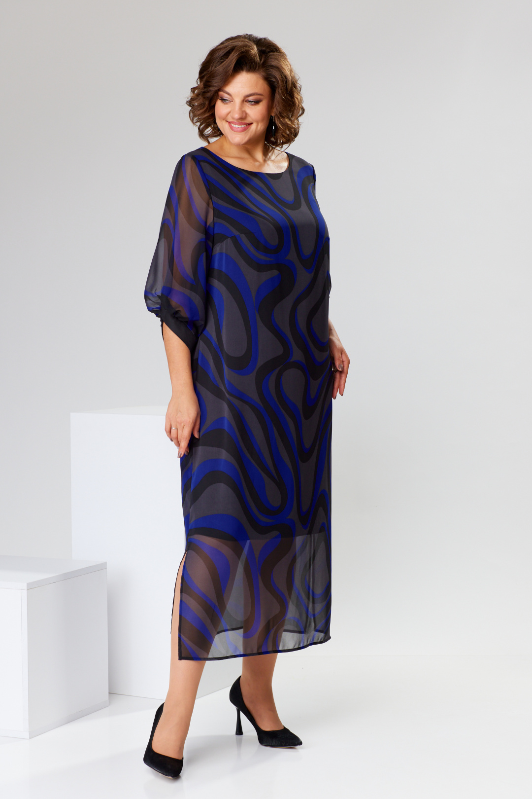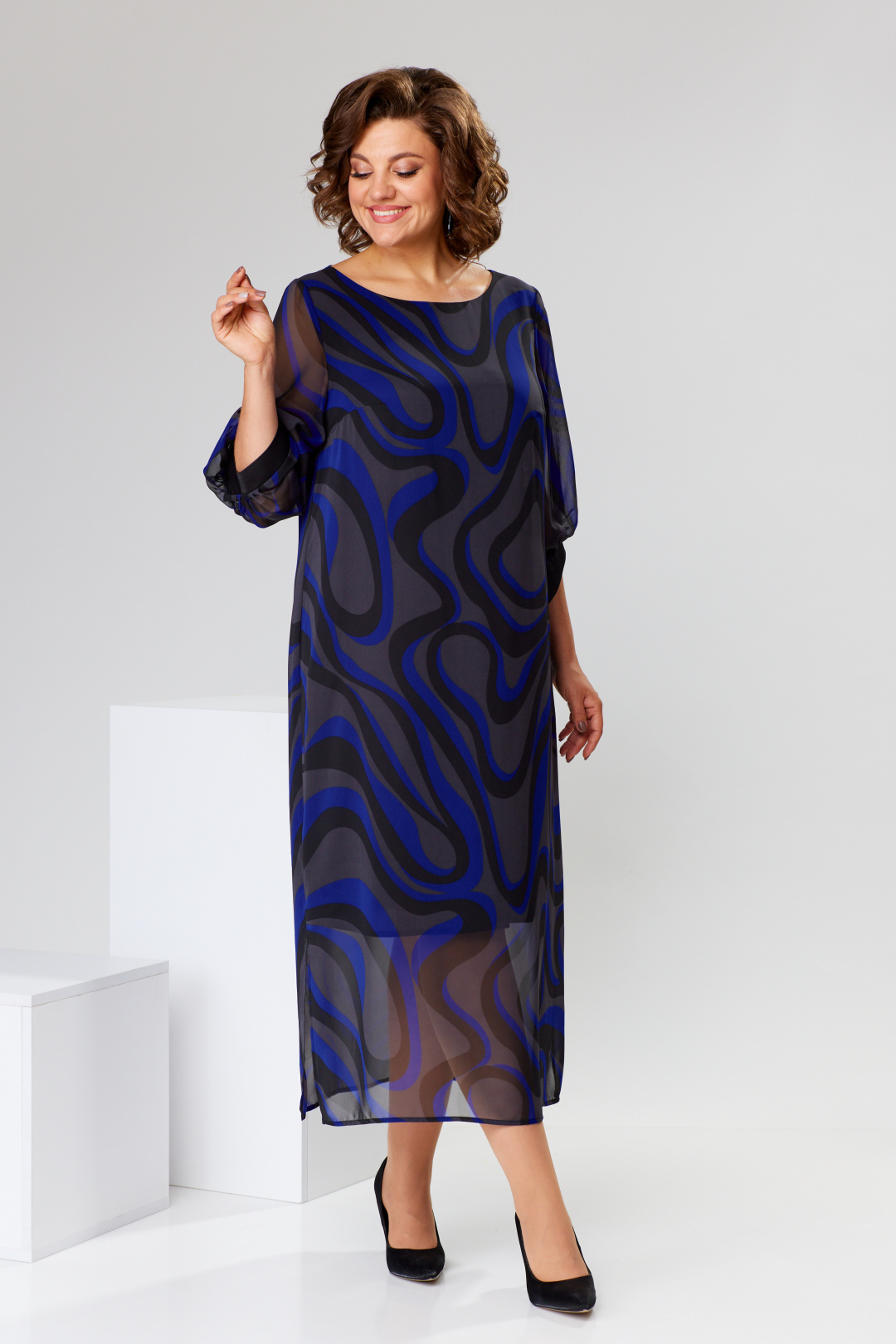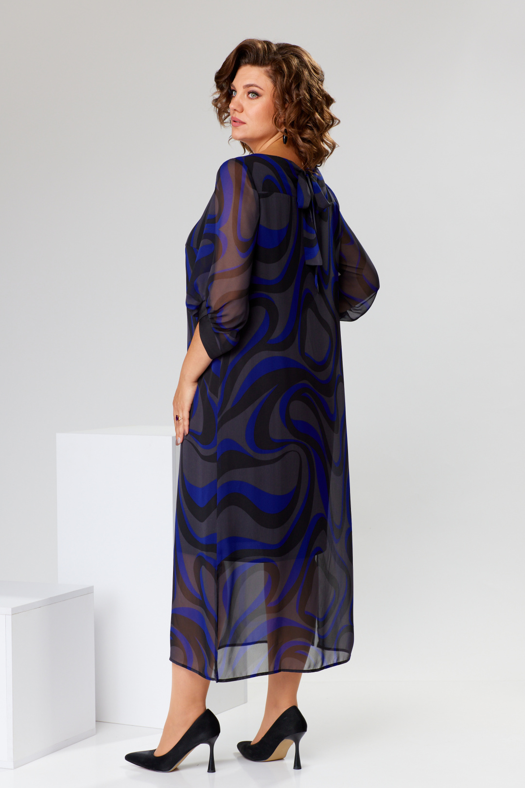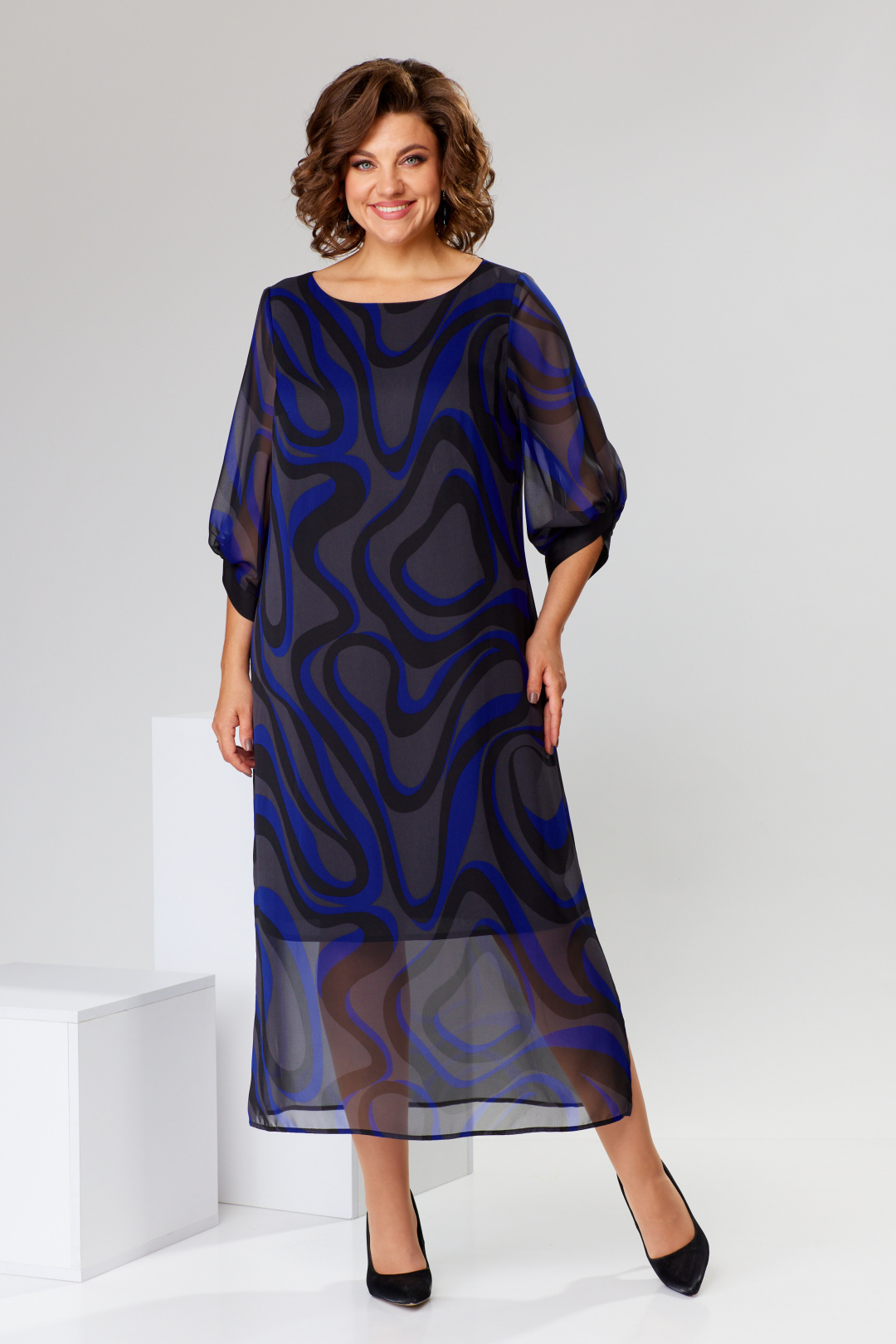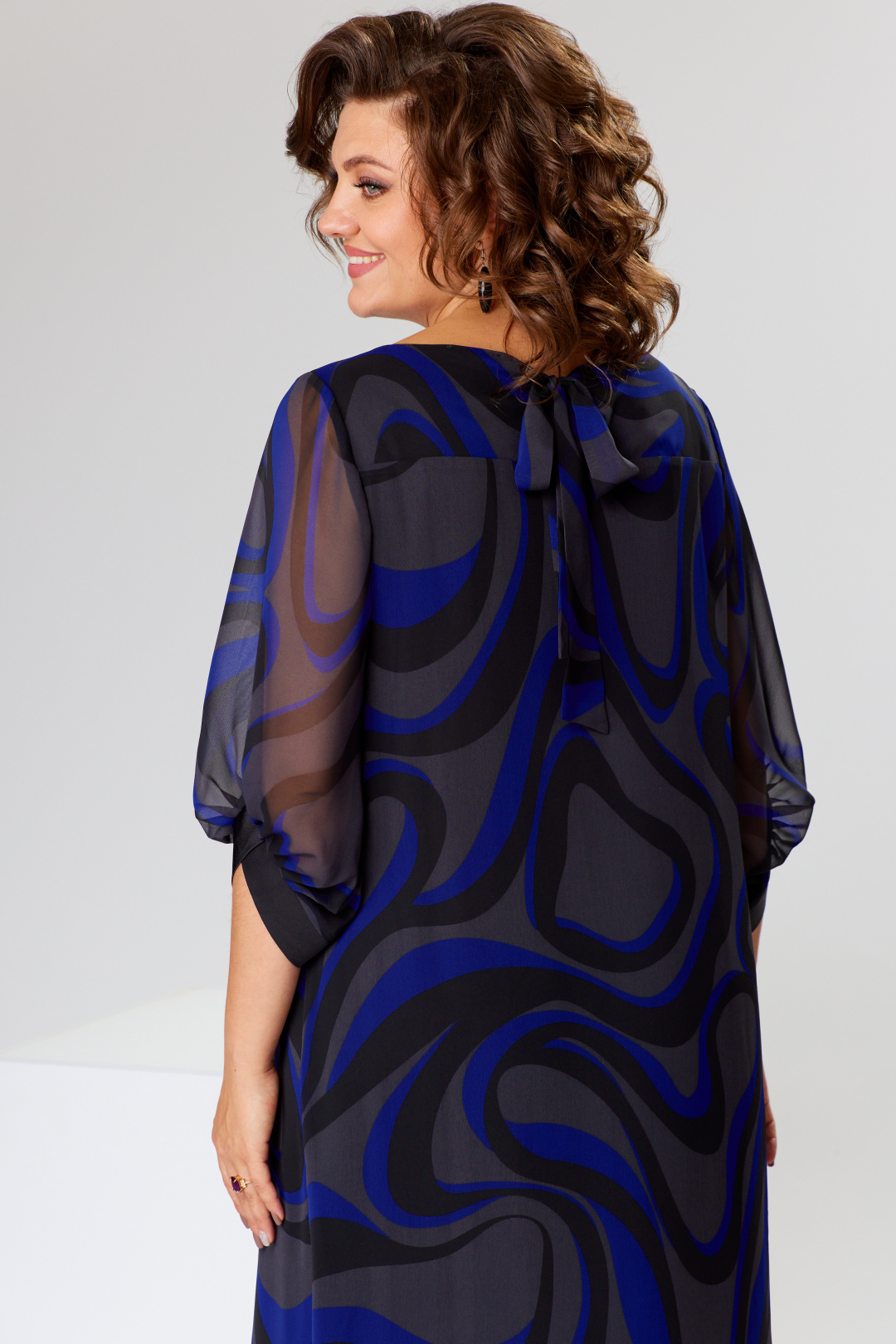 Платье женское относится к нарядной торжественной одежде. Платье женское прямого силуэта, длиной до нижней части икры. Перед с 2-мя нагрудными вытачками. Спинка с отрезной кокеткой с фигурным обтачным разрезом, фиксирующимся по горловине на 2-е обточные завязки. Горловина круглая, обтачная, без воротника. Рукав втачной, одношовный, длиной 3/4 с фигурным низом с 14-ю односторонними складками (по 7 с каждой стороны от угла манжеты), с притачной манжетой из отделочной ткани. Боковые швы с разрезами. Платье на подкладке. Платье без плечевых накладок.