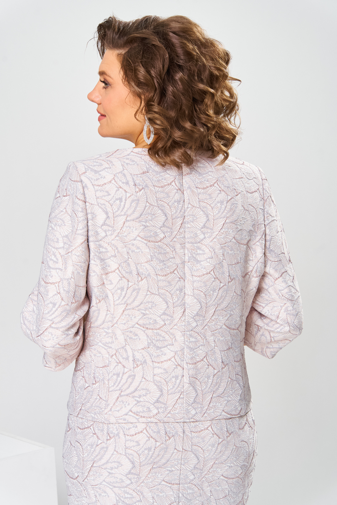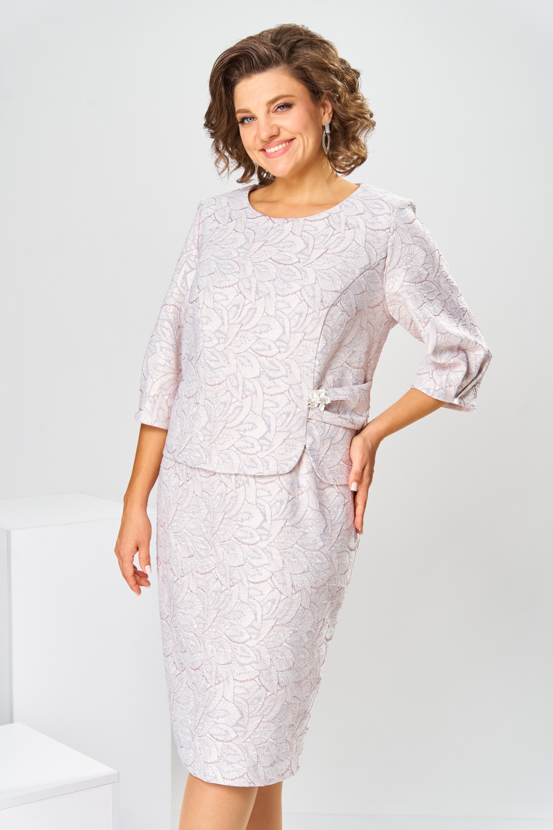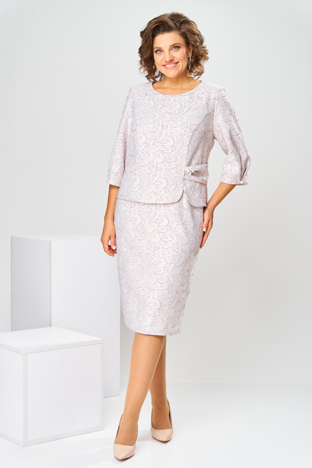 Платье женское, относится к нарядной торжественной одежде. Платье женское полу прилегающего силуэта, длиной за колено, выполнено в виде имитации костюма. Лиф платья отлетной. Перед с 2-мя отрезными бочками, левый бочок с отделочным фигурным поясом, декорированным объёмным украшением, шов притачивания левого бочка с разрезом с закруглёнными концами. Спинка лифа со средним швом и 2-мя отрезными бочками. Лиф платья на подкладке, к которой крепится нижняя часть платья (юбка). Переднее полотнище нижней части с 2-мя таллиевыми вытачками. Заднее полотнище с 2-мя таллиевыми вытачками и средним швом, заканчивающимся шлицей. Нижняя часть платья на подкладке. Горловина круглая, обтачная, без воротника. Застёжка на потайную тесьму-молнию в среднем шве спинки. Рукав втачной, одно шовный, длиной 3/4. Низ рукава со встречной складкой, обточной, складка декорирована пришивной пуговицей. Платье с плечевыми накладками. Длина спинки 104 см, длина рукава 42 см.