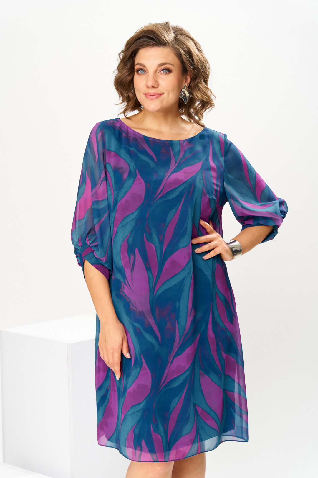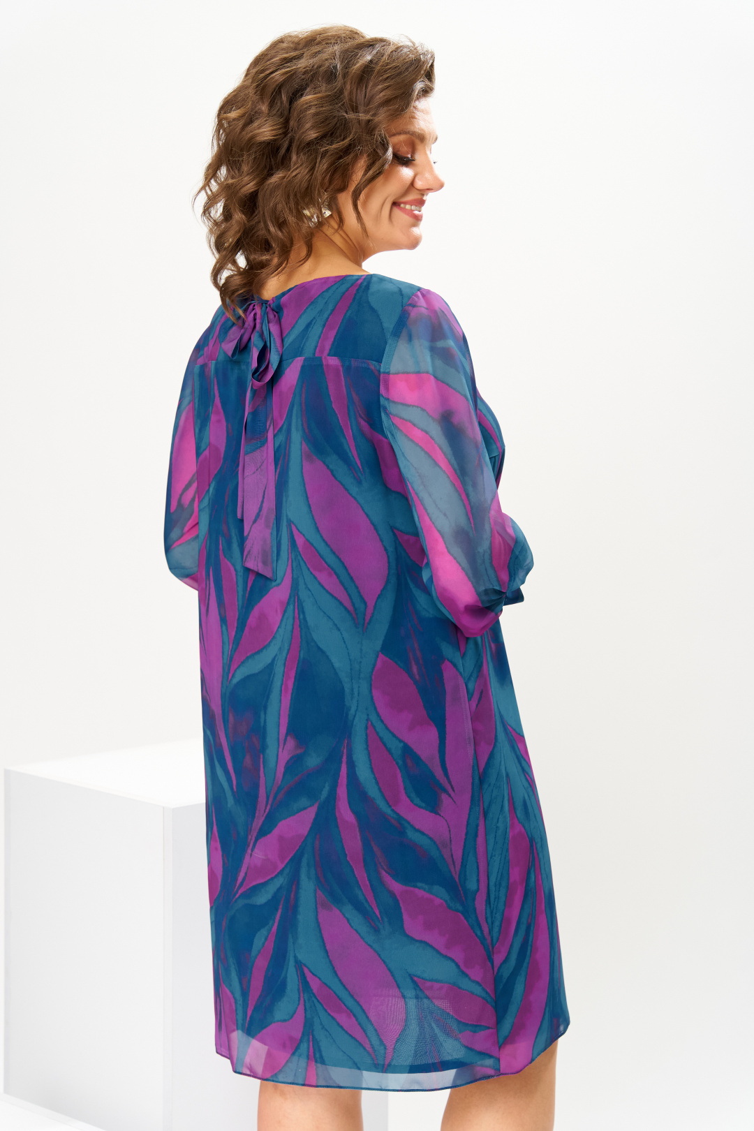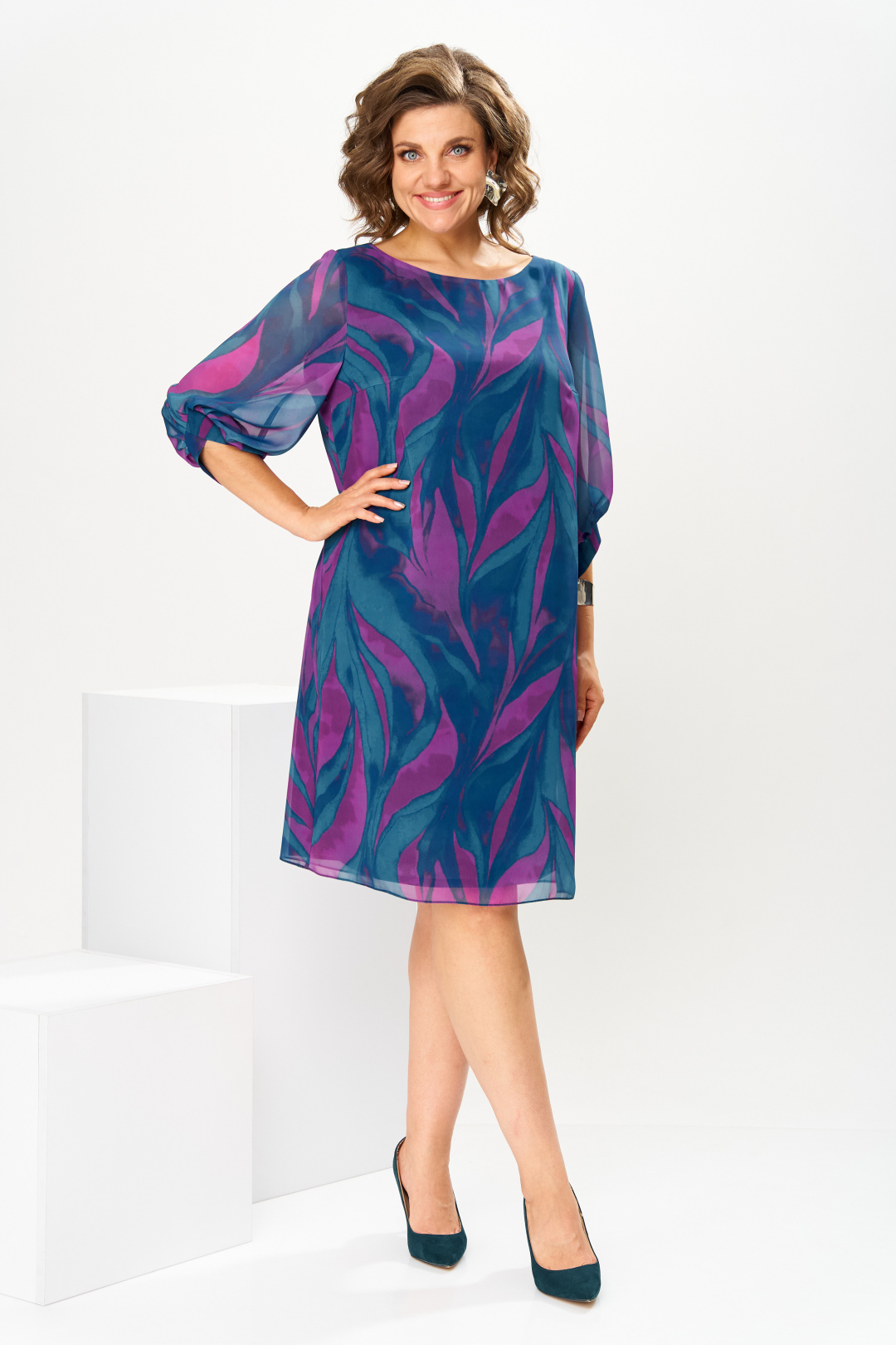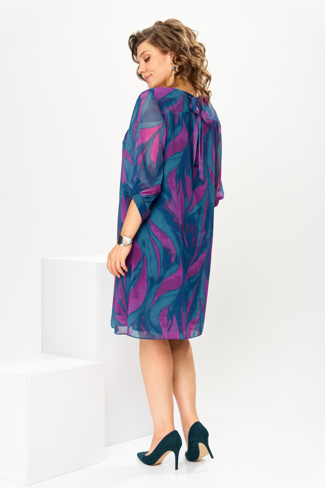 Платье женское относится к нарядной торжественной одежде. Платье женское прямого силуэта, длиной за колено. Перед с 2-мя нагрудными вытачками. Спинка с отрезной кокеткой с фигурным обтачным разрезом, фиксирующимся по горловине на 2-е обточные завязки. Горловина круглая, обтачная, без воротника. Рукав втачной, одношовный, длиной 3/4 с фигурным низом с 14-ю односторонними складками (по 7 с каждой стороны от угла манжеты), с притачной манжетой из отделочной ткани. Платье на подкладке. Платье без плечевых накладок.