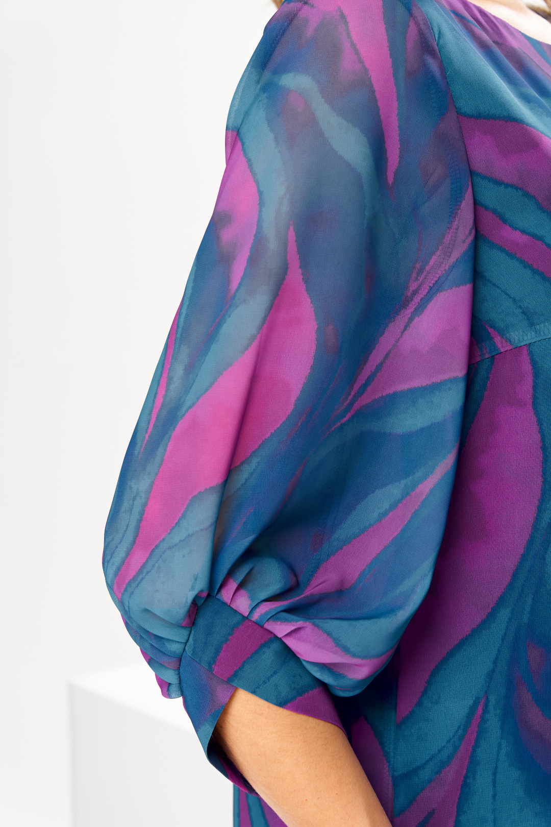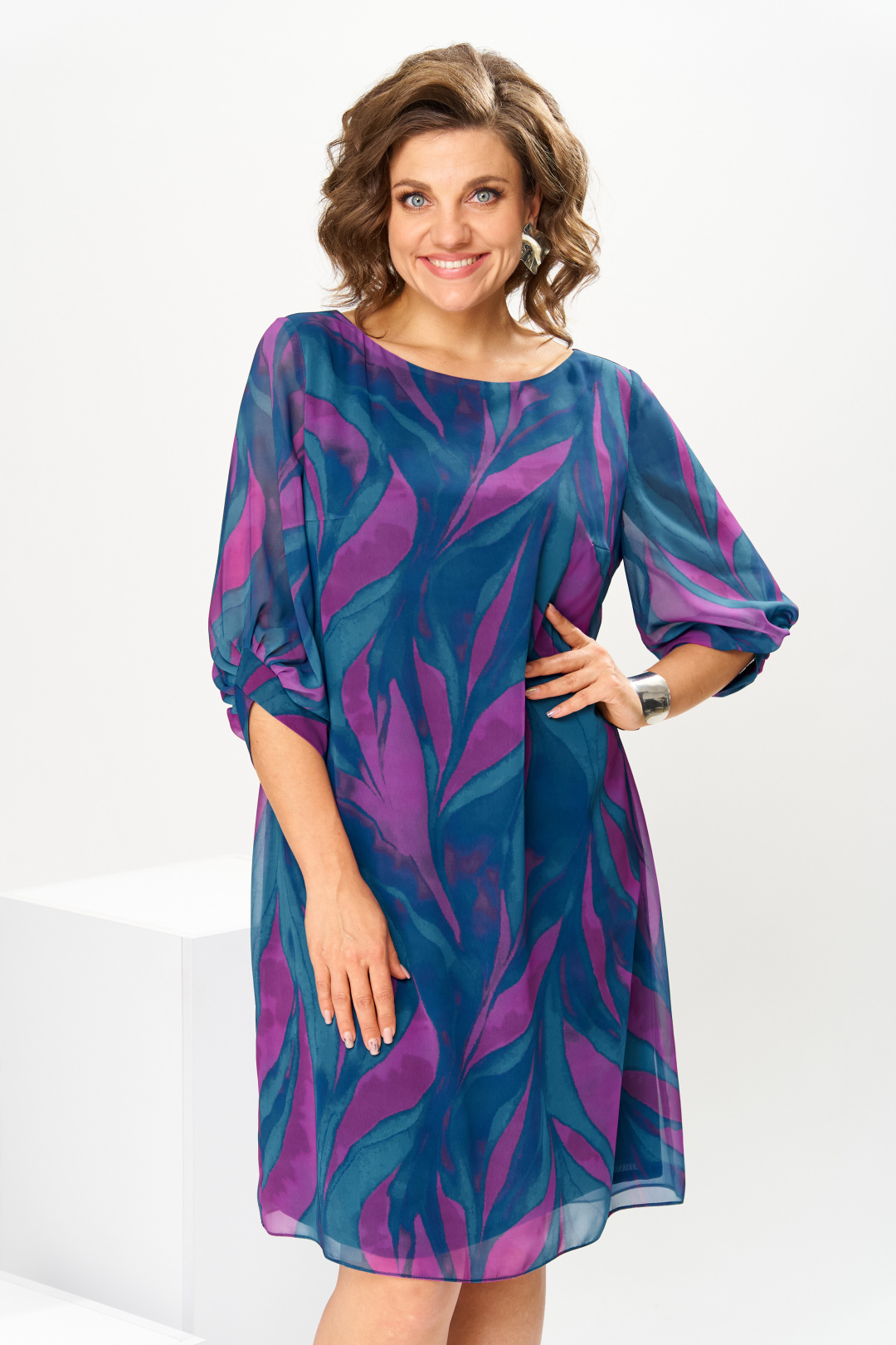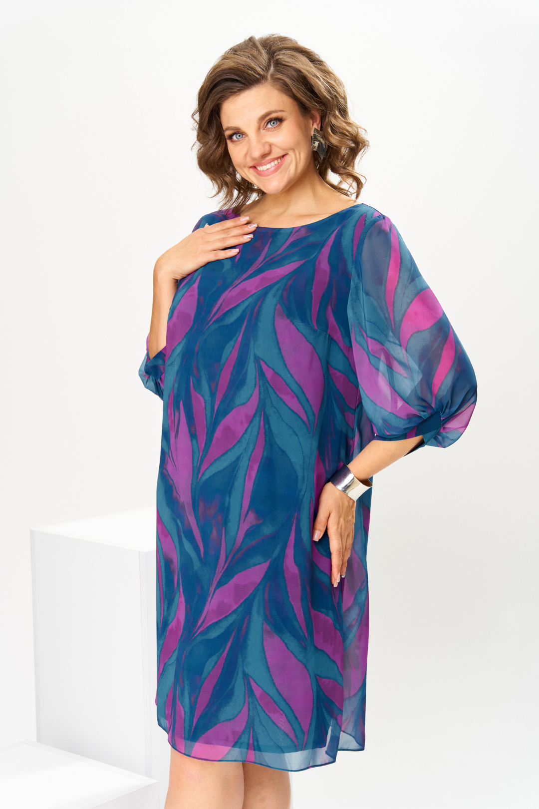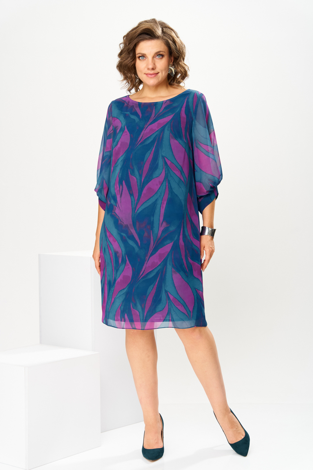 Платье женское относится к нарядной торжественной одежде. Платье женское прямого силуэта, длиной за колено. Перед с 2-мя нагрудными вытачками. Спинка с отрезной кокеткой с фигурным обтачным разрезом, фиксирующимся по горловине на 2-е обточные завязки. Горловина круглая, обтачная, без воротника. Рукав втачной, одношовный, длиной 3/4 с фигурным низом с 14-ю односторонними складками (по 7 с каждой стороны от угла манжеты), с притачной манжетой из отделочной ткани. Платье на подкладке. Платье без плечевых накладок.
