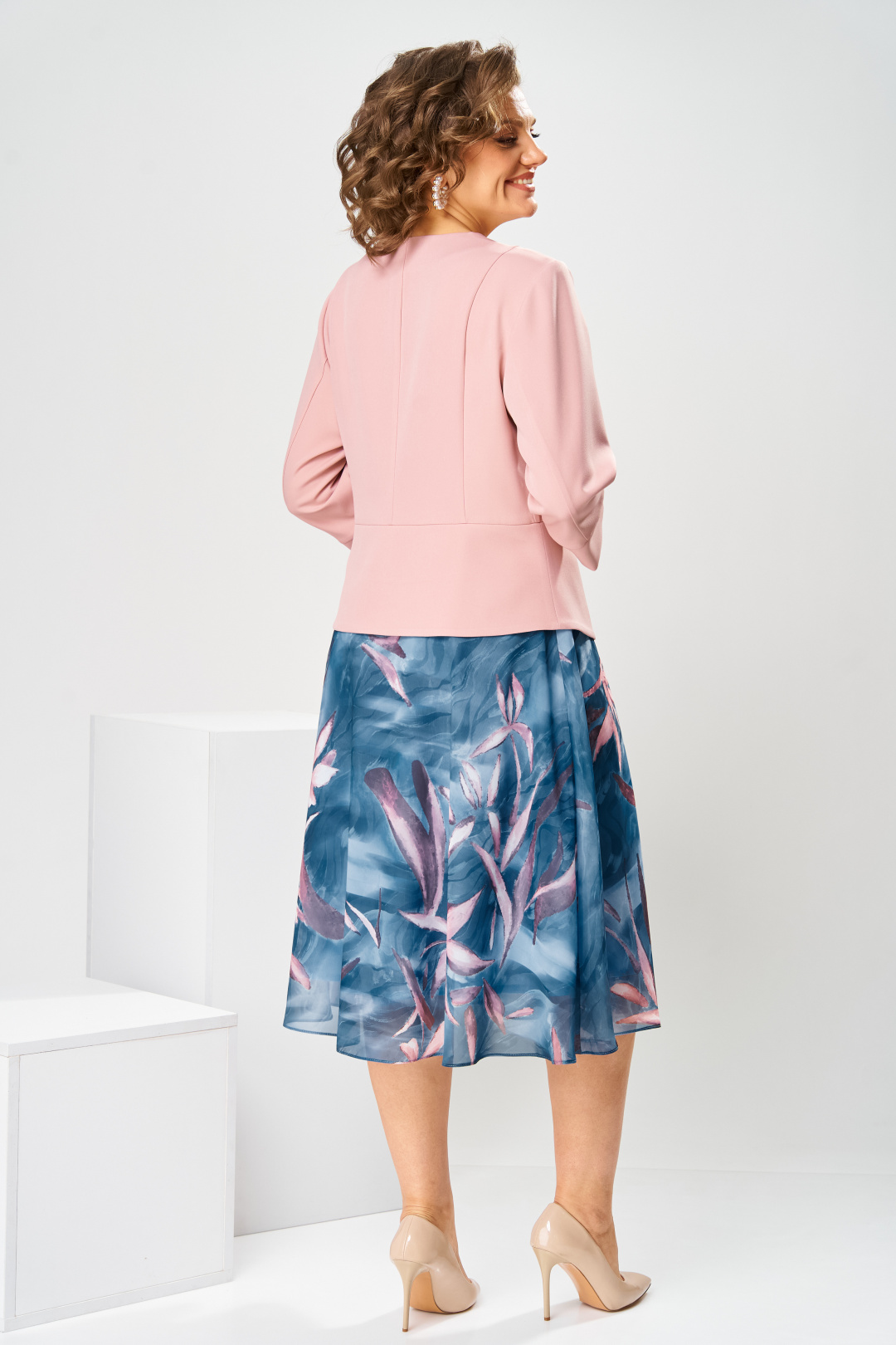 Платье женское относится к нарядной торжественной одежде, но может использовано и при повседневной носке. Платье женское, отрезное по линии талии, расширенное к низу, длиной за колено. Верхняя часть переда с отрезными рельефами, выходящими из плечевых швов, центральная часть с зафиксированным запахом. Верхняя часть спинки со средним швом и 2-мя рельефами, выходящими из плечевых швов. Горловина с V-образным вырезом, фигурная, обточная без воротника. Нижняя часть переда и нижняя часть спинки цельнокроеные, выполнены из отделочной ткани. Шов соединения верхней и нижней частей платья декорирован притачной фигурной отлетной баской. Платье с декоративным поясом из отделочной ткани, закреплённом на левом боковом шве и фиксирующимся в бант через металлическую пробивную блочку на центральной части переда. Рукав одно шовный втачной, длиной до локтя, с притачной фигурной манжетой. Платье с плечевыми накладками. Нижняя часть на подкладке. Длина платья 112 см, длина рукава 33 см.