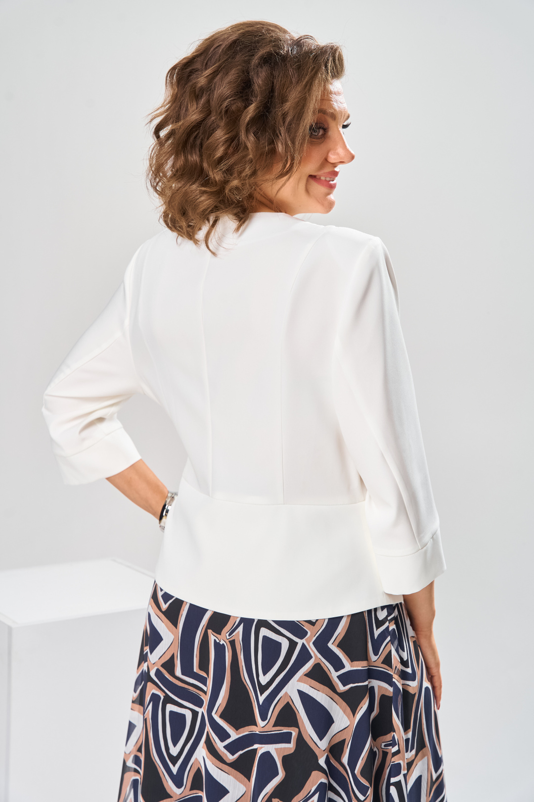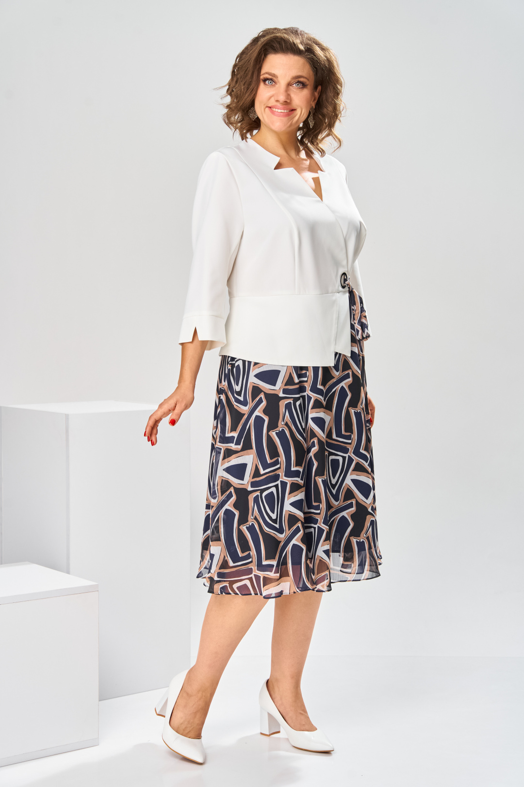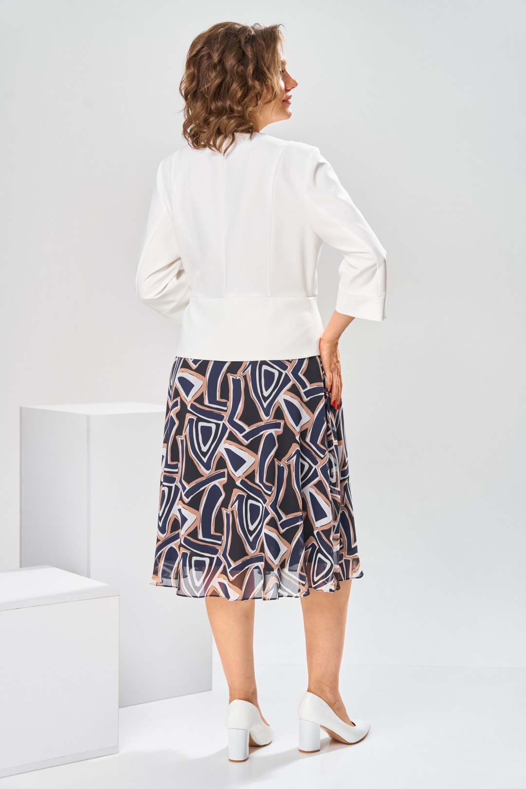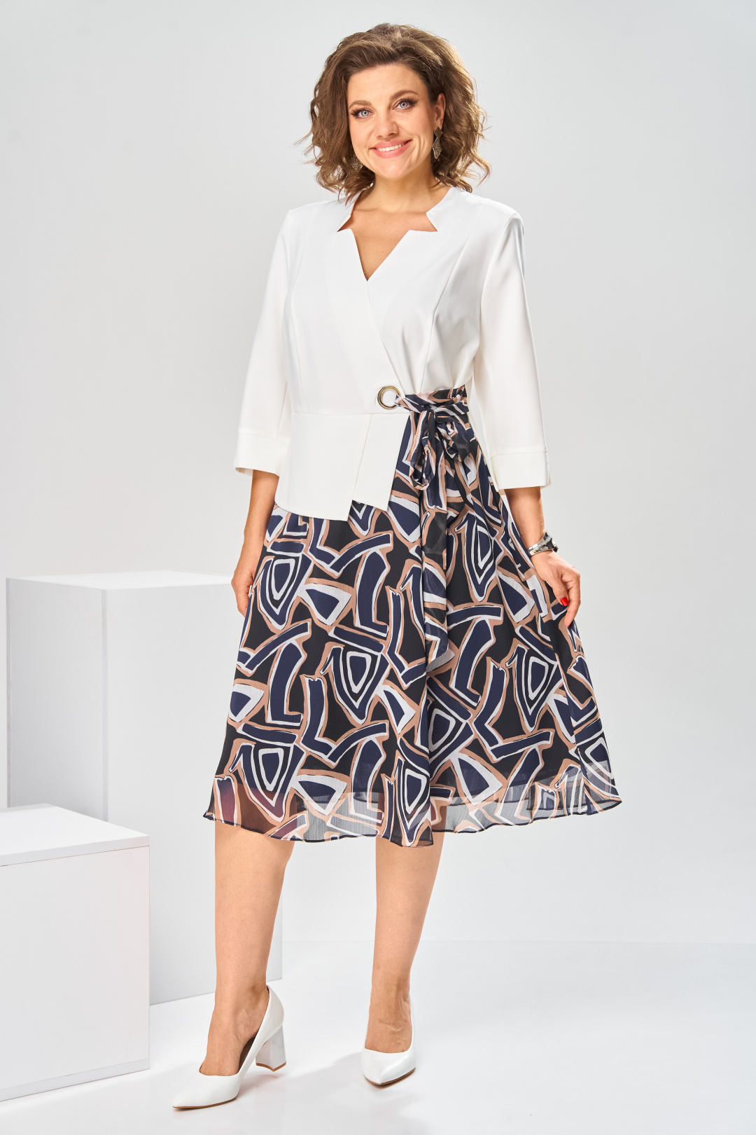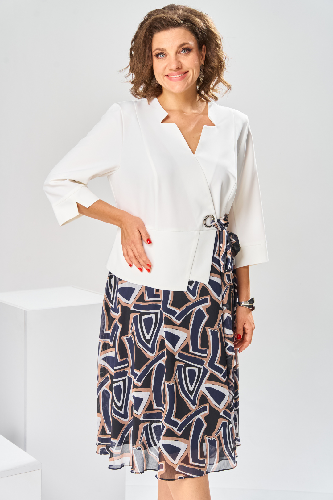 Платье женское относится к нарядной торжественной одежде, но может использовано и при повседневной носке. Платье женское, отрезное по линии талии, расширенное к низу, длиной за колено. Верхняя часть переда с отрезными рельефами, выходящими из плечевых швов, центральная часть с зафиксированным запахом. Верхняя часть спинки со средним швом и 2-мя рельефами, выходящими из плечевых швов. Горловина с V-образным вырезом, фигурная, обточная без воротника. Нижняя часть переда и нижняя часть спинки цельнокроеные, выполнены из отделочной ткани. Шов соединения верхней и нижней частей платья декорирован притачной фигурной отлетной баской. Платье с декоративным поясом из отделочной ткани, закреплённом на левом боковом шве и фиксирующимся в бант через металлическую пробивную блочку на центральной части переда. Рукав одно шовный втачной, длиной до локтя, с притачной фигурной манжетой. Платье с плечевыми накладками. Нижняя часть на подкладке. Длина платья 112 см, длина рукава 33 см.