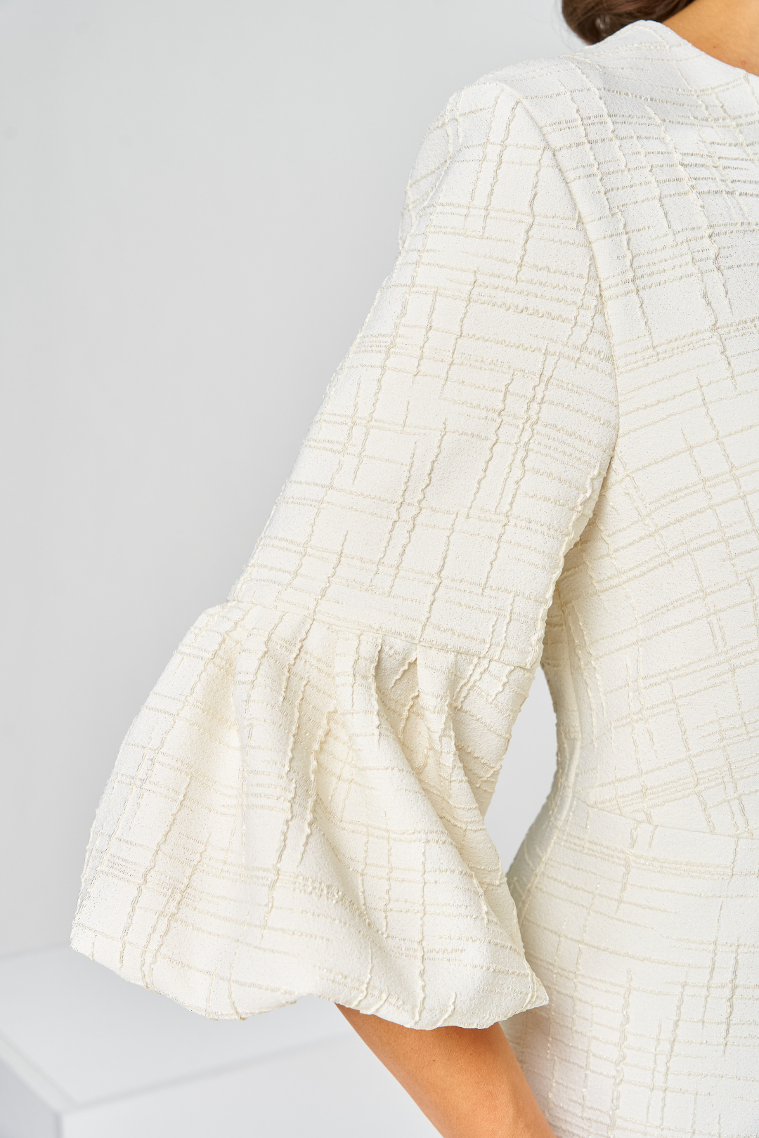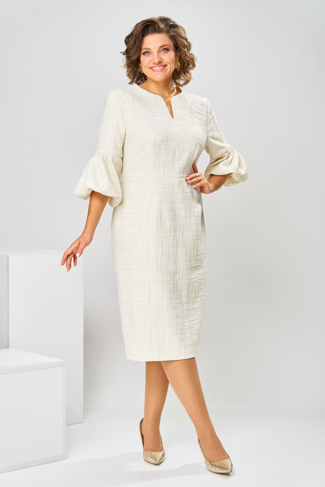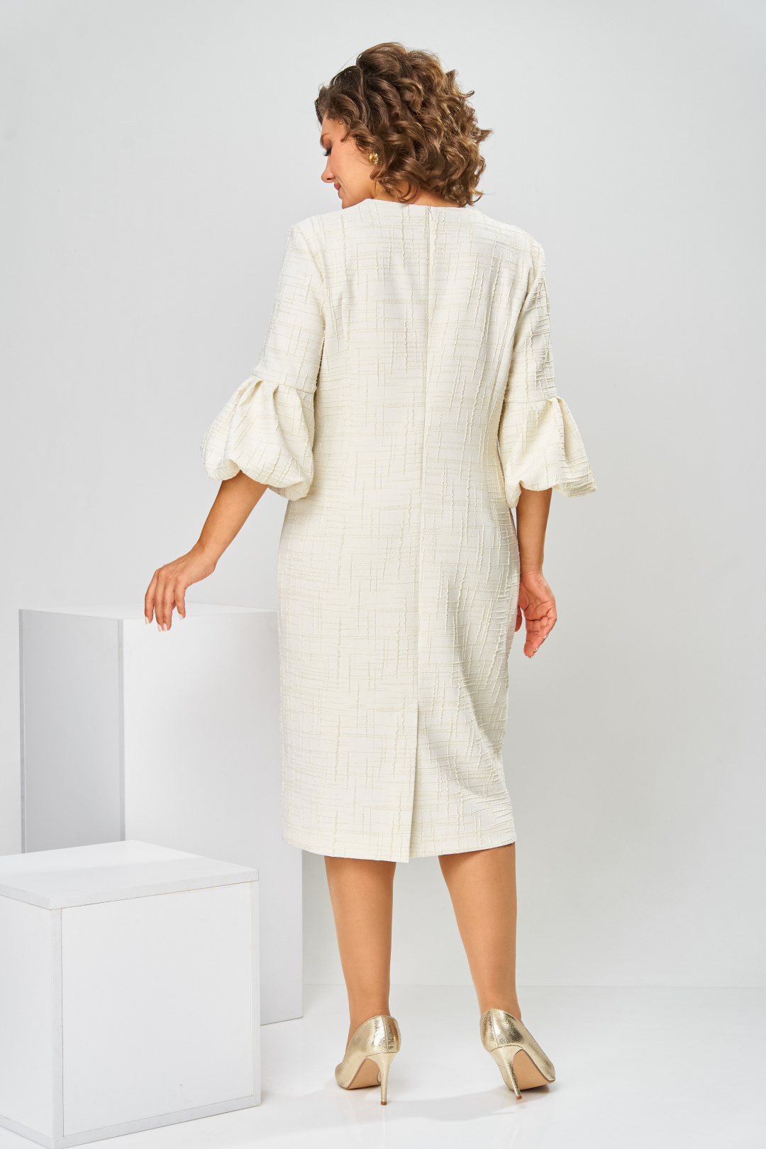 Платье женское, относится к торжественной нарядной одежде. Платье женское, полу прилегающего силуэта, длиной ниже колена. Перед отрезной по линии талии. Верхняя часть переда со средним швом и 2-мя таллиевыми вытачками, нижняя часть с 2-мя таллиевыми вытачками. Спинка с 2-мя таллиевыми вытачками и средним швом, заканчивающимся шлицей. Горловина фигурная, обточная, без воротника. Застёжка на потайную тесьму-молнию в среднем шве спинки. Рукав втачной, одно шовный, длиной 3/4, с горизонтальным разрезом, нижняя часть рукава с 5-ю односторонними складками, со сборкой по низу, низ обточной. Платье на подкладке с плечевыми накладками. Длина спинки платье 111 см, длина рукава 45 см.