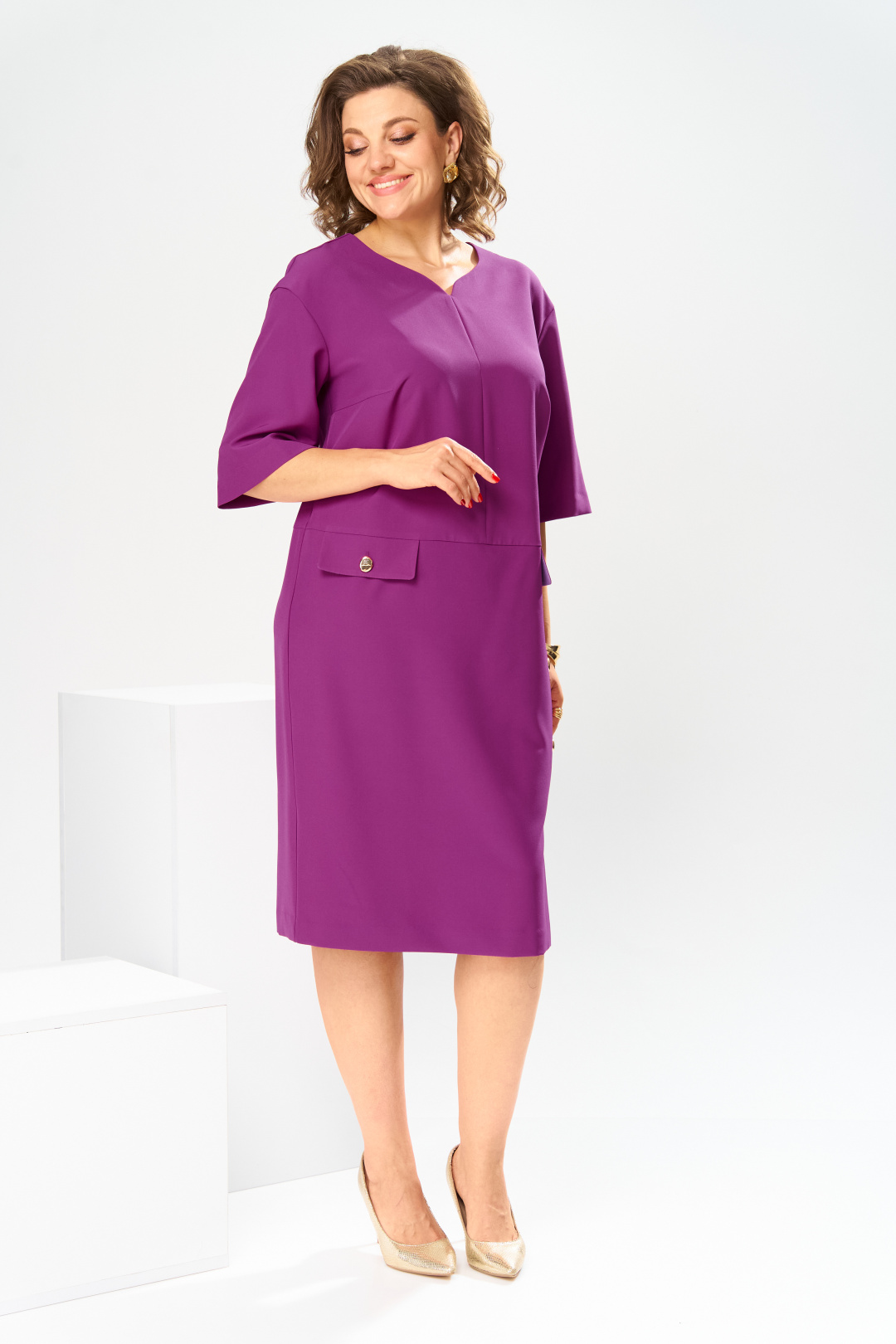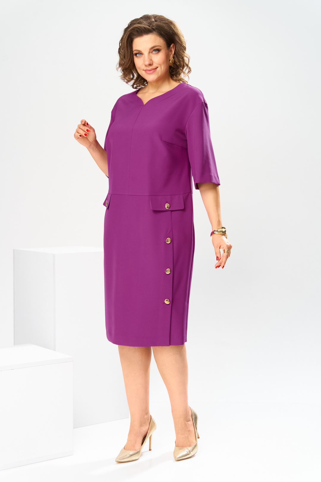 Платье женское, предназначено для повседневной носки. Платье женское, полу прилегающего силуэта, длиной за колено. Перед отрезной, ниже линии талии на 6 см; верхняя часть переда с 2-мя нагрудными выточками и средним швом, нижняя часть с отрезным бочком, шов соединения ею с передом, заканчивается шлицей, фиксирующейся на 3-и обмётанные петли и 3-и пришивные пуговицы; шов соединения часть переда декорирован 2-мя клапанами с закруглёнными концами закреплены на перед пришивными пуговицами. Спинка отрезная ниже линии талии на 6 см; верхняя часть с 2-мя таллиевыми вытачками и средним швом, нижняя часть с 2-мя таллиевыми выточками. Горловина с фигурным вырезом, обтачная без воротника. Платье со спущенным плечом. Рукам втачной, одно шовный, длиной за локоть. Платье без плечевых накладок. Длина спинки 105 см. Длина рукава+плечо 48 см.