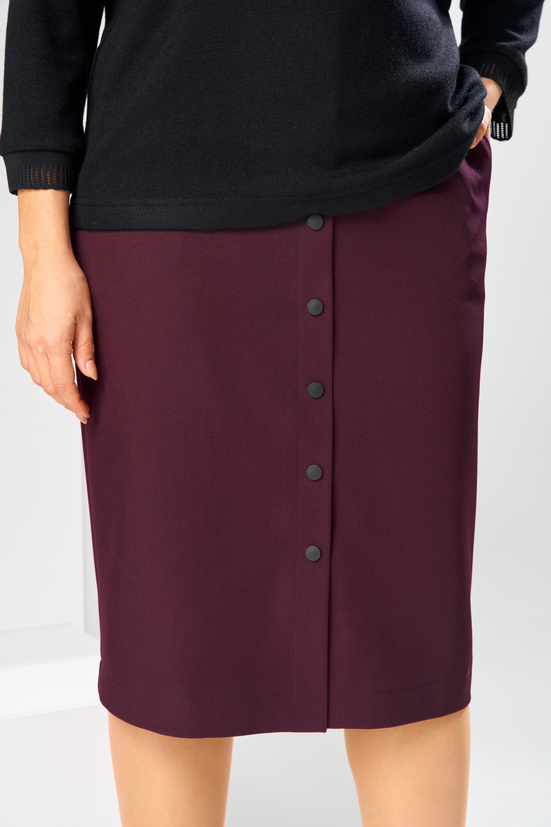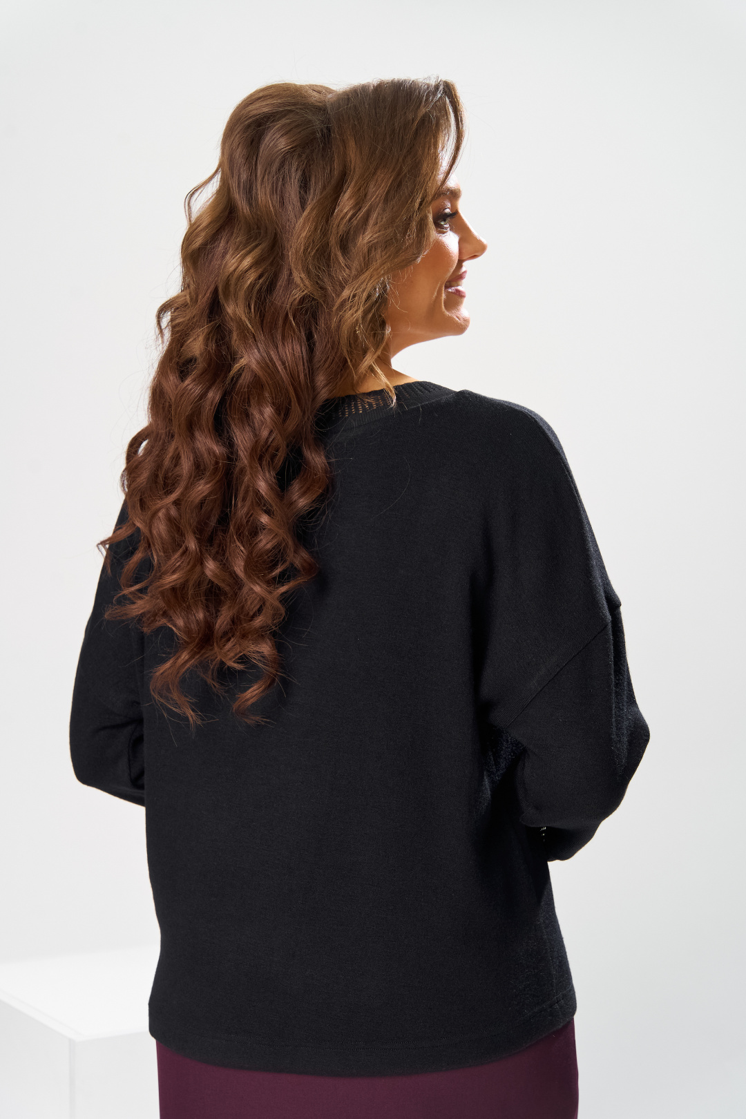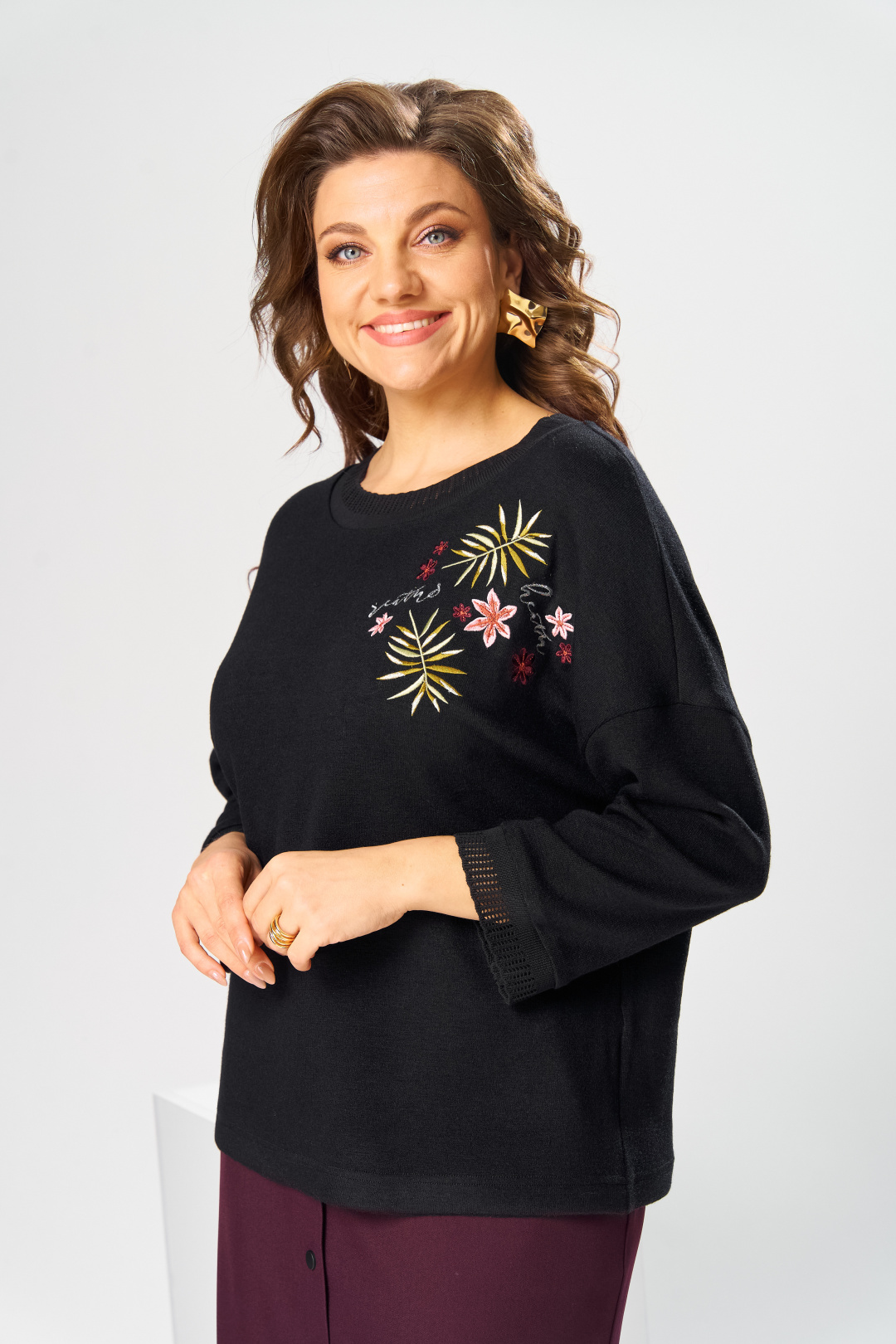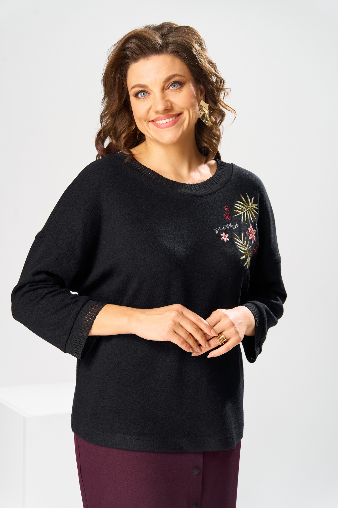 Костюм женский двух предметный: джемпер и юбка предназначен для повседневной носки. Джемпер прямого силуэта, длиной до линии бедер. Перед цельнокроеный, декорирован худ. Вышивкой. Спинка цельнокроеная. Горловина круглая, с втачной фигурной планкой из отделочной ткани. Джемпер со спущенной проймой. Рукав втачной, одно шовный, длиной 7/8. Юбка прямая, длиной ниже колена. Переднее полотнище с двумя боковыми фигурными карманами. Заднее полотнище с двумя таллиевыми  вытачками. Застежка спереди на 8 металлических кнопок. Верхний срез с притачным поясом, с 4 надстрочными шлевками, между карманами и вытачками заднего полотнища пояс собран на эластичную тесьму. Юбка на подкладке. Длина джемпера 53см, длина рукава от горловины 58см. Длина юбки 68см