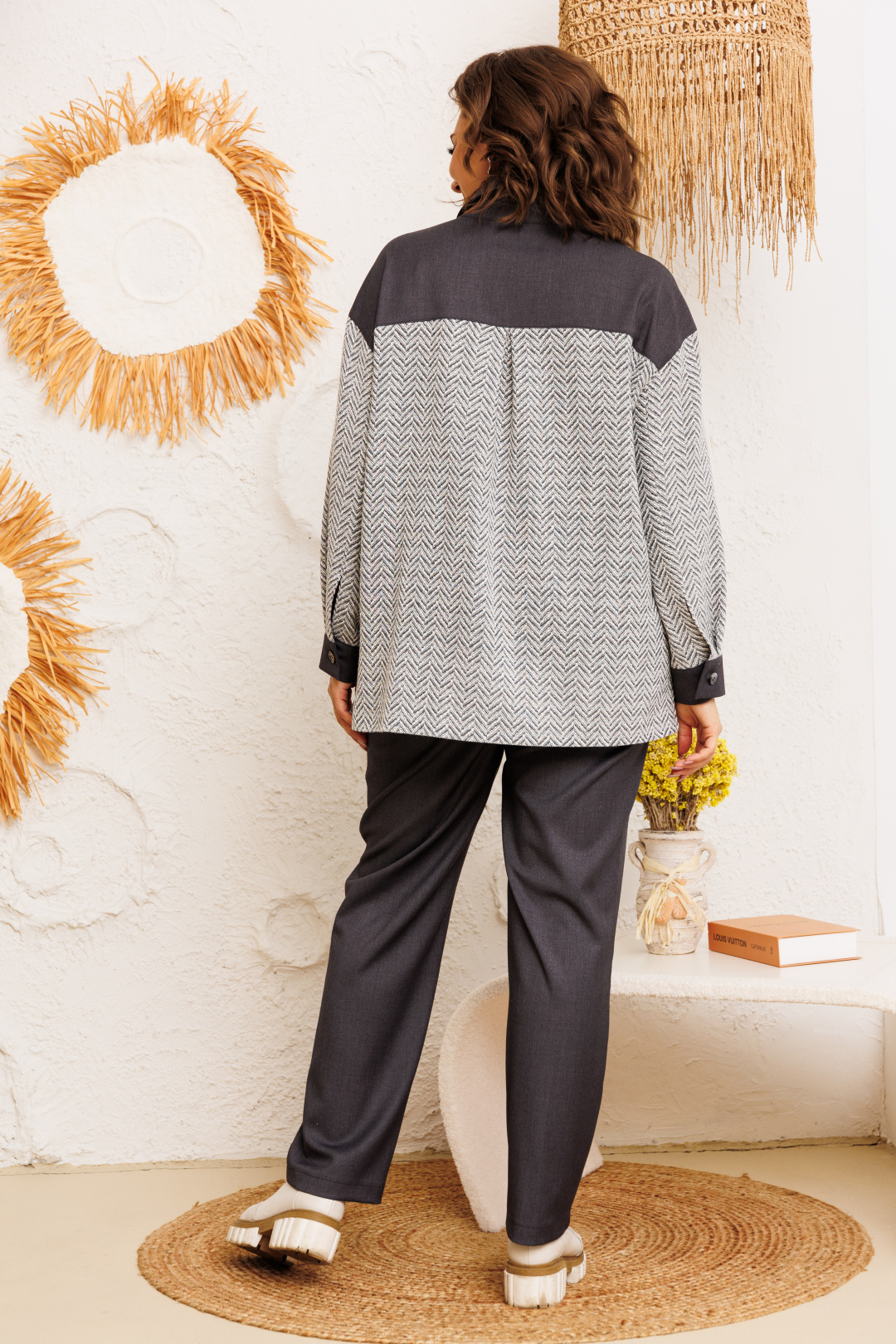 Костюм женский предназначен для повседневной носки. Костюм женский 2-х предметный жакет и брюки. Жакет женский прямого силуэта, длиной ниже линии бёдер. Перед с отрезной кокеткой, с 2-мя фигурными клапанами, декорированными пришивными пуговицами, с 2-мя притачными вертикальными планками. Спинка с отрезной кокеткой, с 1-ной центральной встречной складкой. Передняя центральная часть и спинка выполнены из отделочной ткани. Боковые швы с разрезами. Горловина круглая с втачным воротником, рубашечного типа с отрезной стойкой. Застёжка центральная на 7-мь обмётанных петель и 7-мь пришивных пуговиц. Жакет со спущенным плечом. Рукав втачной, 2-х шовный, длинный с притачной манжетой, с застёжкой на 1-ну обмётанную петлю и 1-ну пришивную пуговицу. Рукав из отделочной ткани. Жакет без плечевых накладок. Брюки женские, слегка заужены к низу, длинные. Передние половинки с карманами в боковых швах. Задние половинки с таллиевыми вытачками. Брюки с притачным поясом, собранным на эластичную тесьму, закреплённую 2-мя отделочными строчками. Длина спинки жакета 72 см, длина рукава 51 см, ширина плеча 21 см. Длина брюк по боковому срезу 102 см.