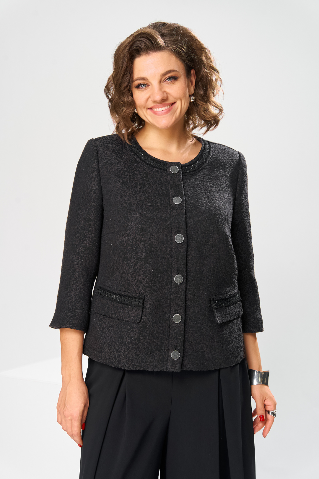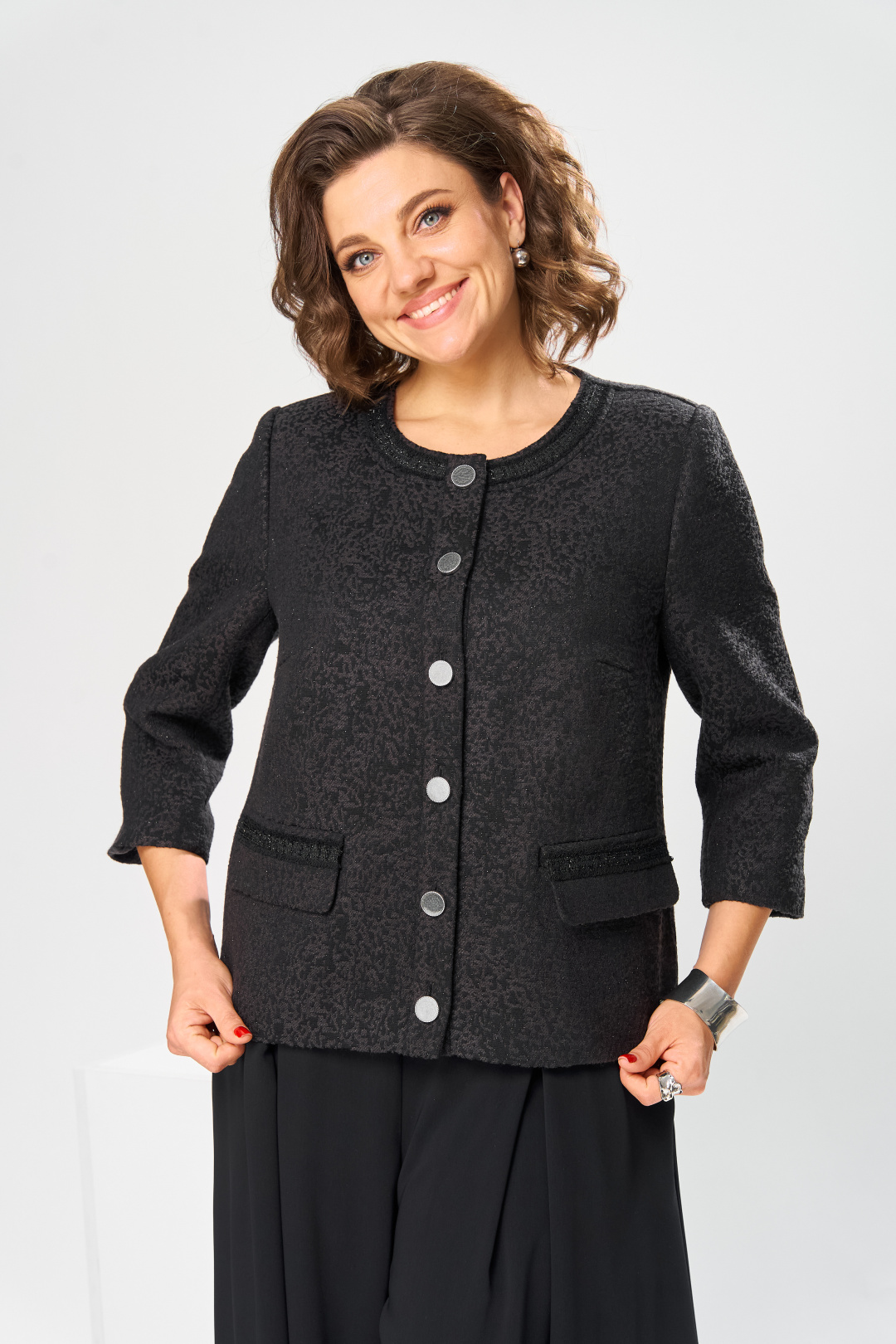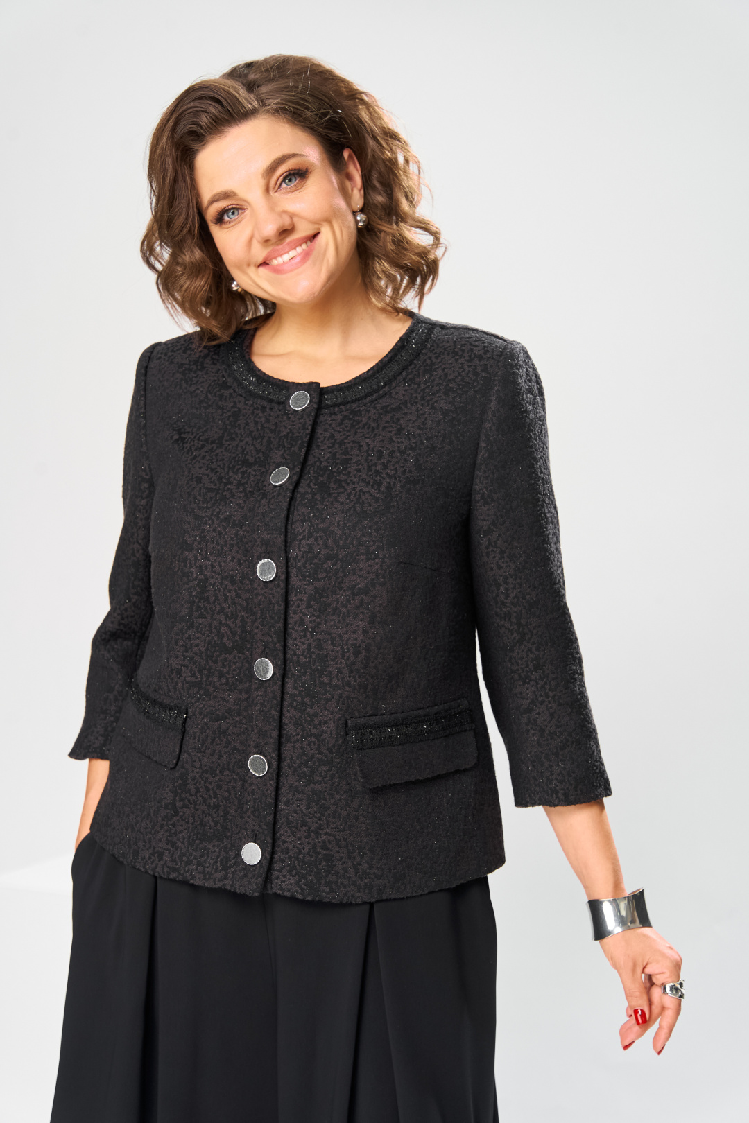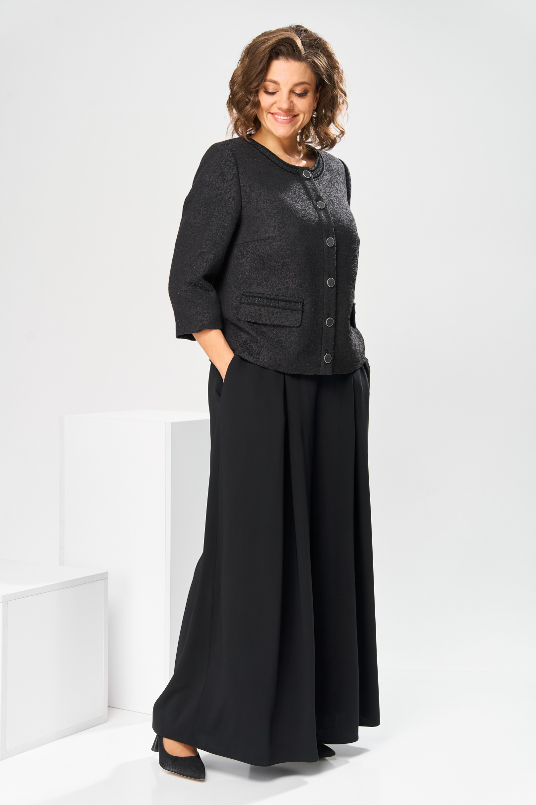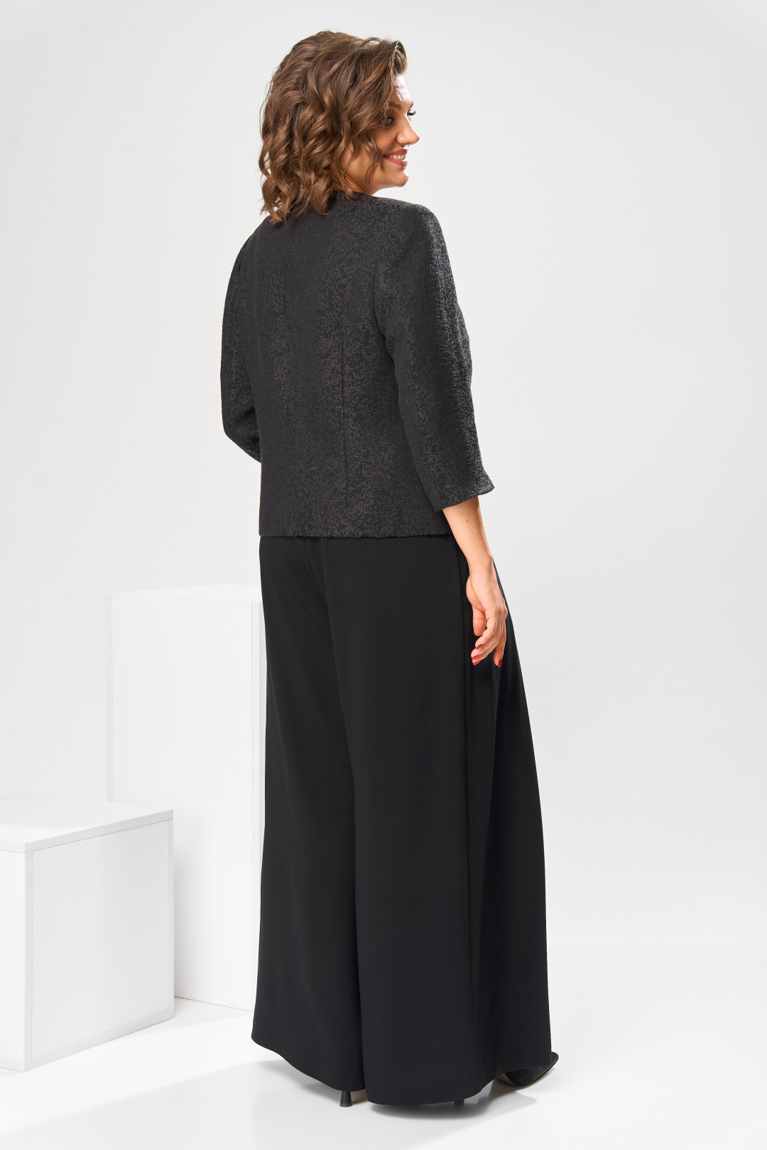 Костюм женский относится к нарядной торжественной одежде. Костюм женский 2-х предметный жакет и брюки. Жакет женский полуприлегающего силуэта, длиной до линии бёдер. Перед с 2-мя нагрудными вытачками с притачными планками по горловине, декорированными надстрочной отделочной тесьмой, с 2-мя надстрочными вертикальными планками, с 2-мя прорезными карманами с клапаном с закруглёнными концами и листочкой, клапан декорирован надстрочной отделочной тесьмой, карманы расположены ниже линии талии на 2 см. Спинка с 2-мя таллиевыми вытачками и средним швом. Горловина круглая, обточная, без воротника. Застёжка центральная бортовая на 6-ть вертикально обмётанных петель и 6-ть пришивных пуговиц. Рукав 2-х шовный втачной, длиной 3/4. Жакет на притачной подкладке. Брюки женские, широкие, длинные. Передние половинки со встречными складками с карманами в боковых швах. Задние половинки без конструктивных особенностей. Брюки с притачным поясом, собранным на эластичную тесьму, закреплённую 2-мя отделочными строчками. Длина спинки жакета 58 см, длина рукава 48 см. Длина брюк по боковому срезу 99 см.