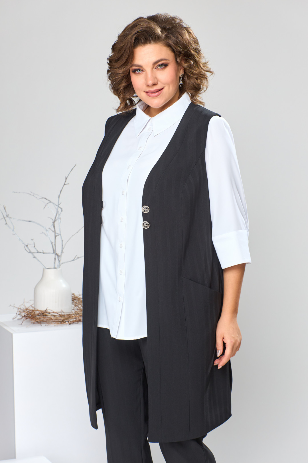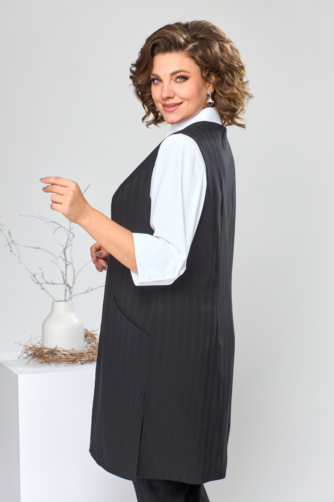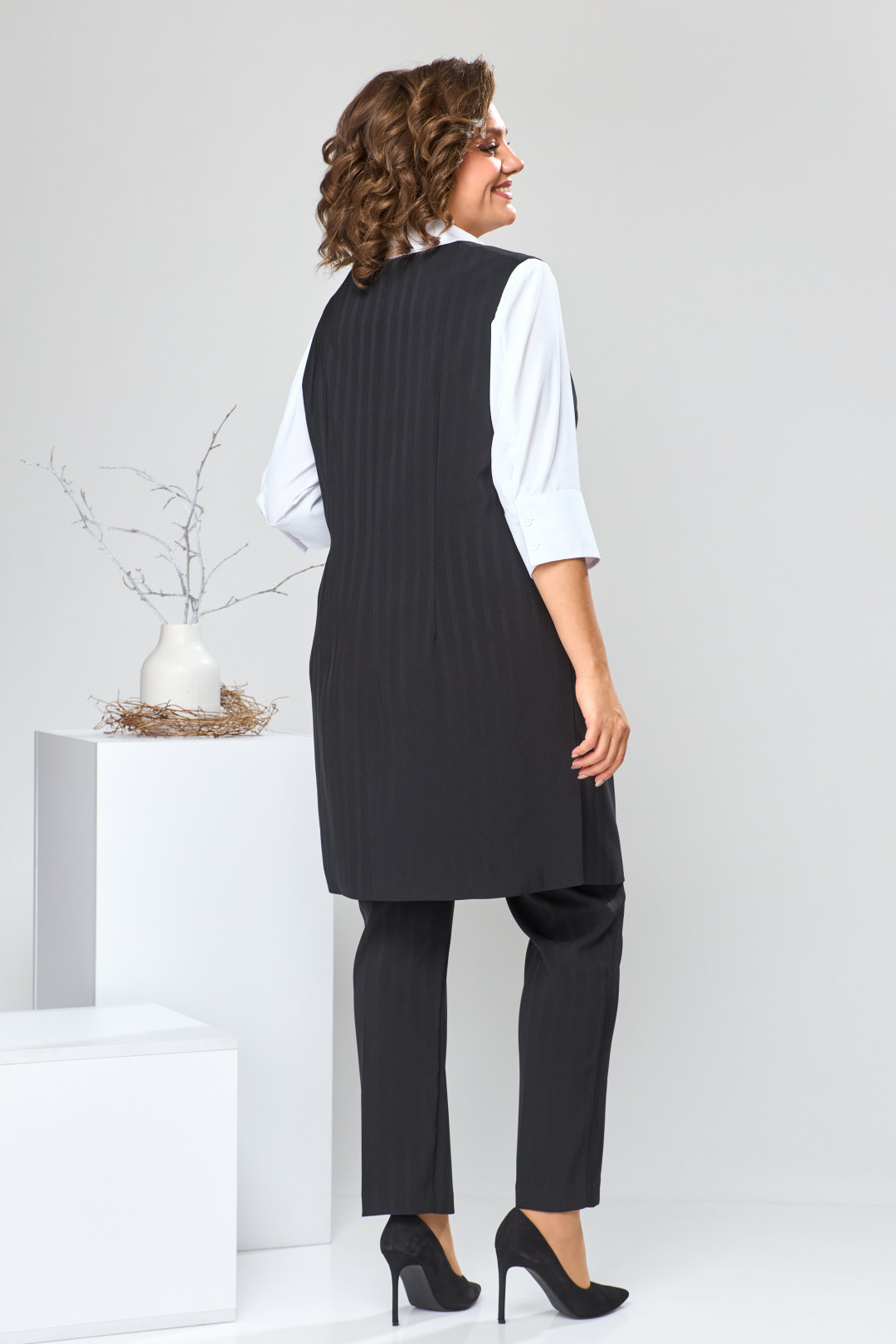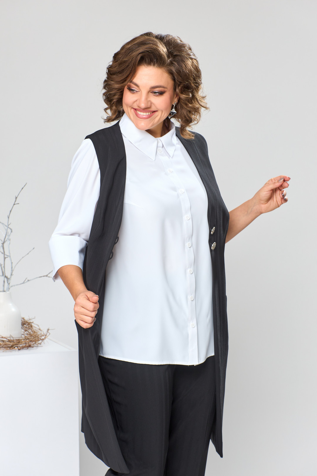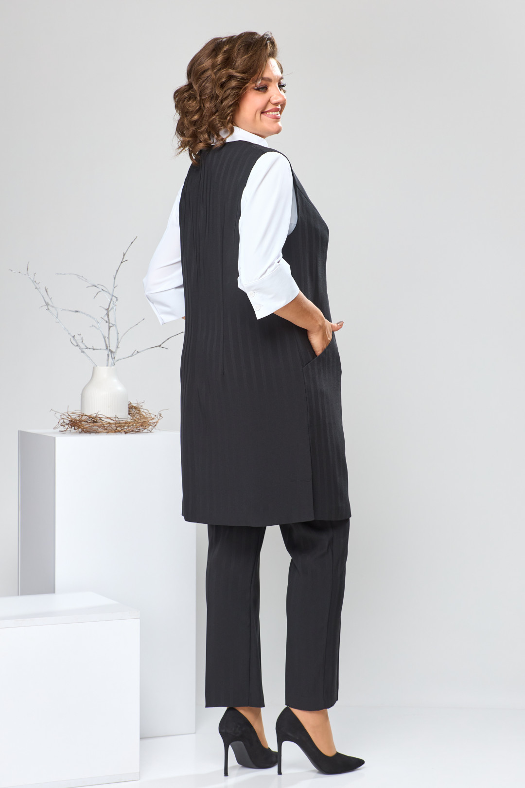 Блузка женская прямого силуэта, длиной до линии бедер. Перед с двумя нагрудными вытачками, с двумя цельнокроеными планками. Спинка с двумя талиевыми вытачками. Горловина круглая, с воротником рубашечного типа, с отрезной стойкой. Рукав втачной, двухшовный, длиной 3\4, с притачной манжетой, фиксирующейся на две обметанные петли и две пришивные пуговицы. Застежка центральная на десять обметанных петель и десять пришивных пуговиц. Блузка с плечевыми накладками. Брюки женские, длинные, слегка заужены к низу. Передние и задние половинки с двумя талиевыми вытачками. Застежка на тесьму-молнию. Верхний срез с притачным поясом, застегивающимся на одну обметанную петлю и одну пришивную пуговицу. Между вытачками задних полотнищ и боковыми швами пояс собран на эластичную тесьму. Длина спинки жилета 94 см. Длина блузки 71 см. Длина рукава 47 см. Длина брюк 102 см