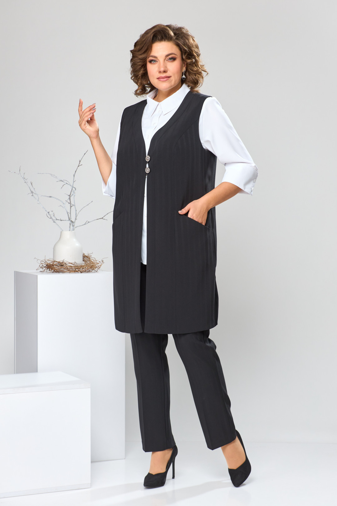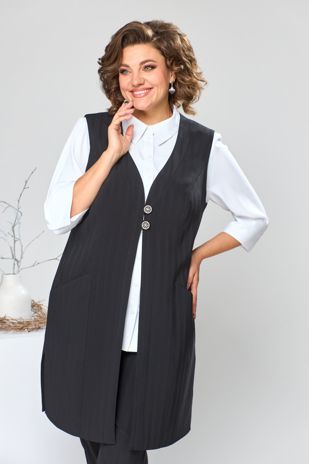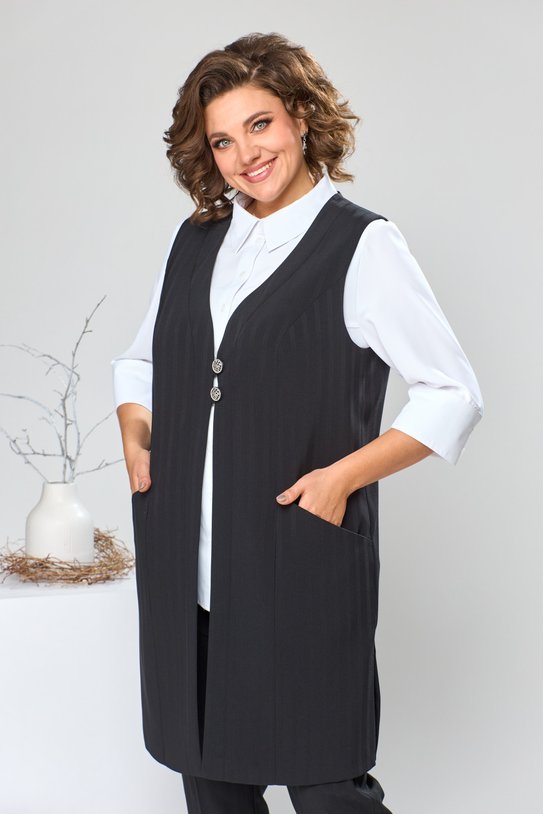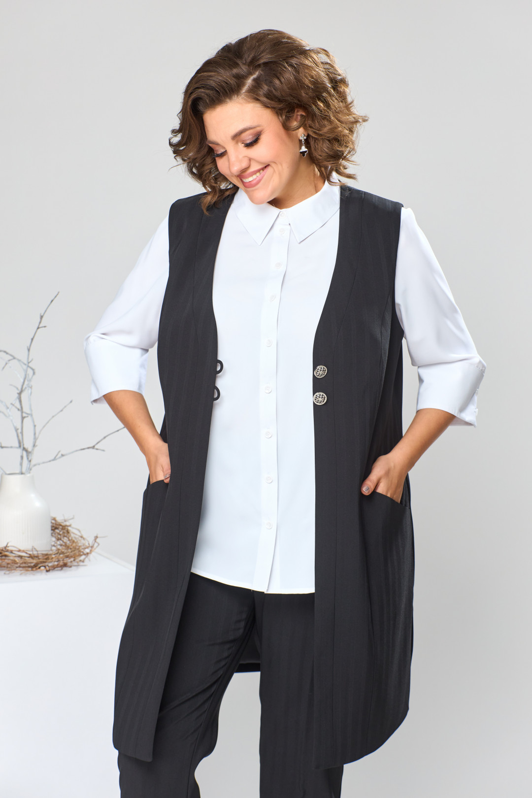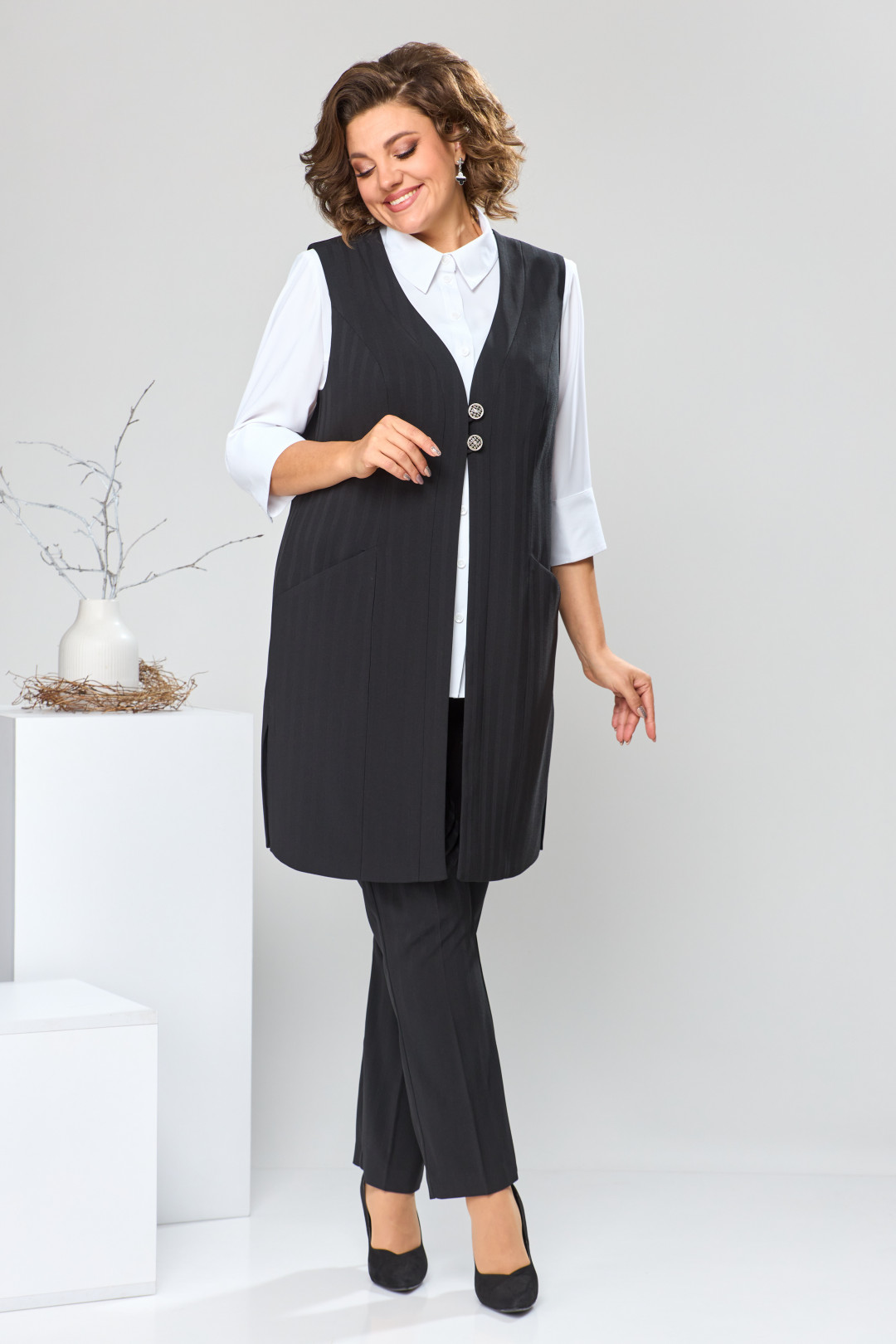 Блузка женская прямого силуэта, длиной до линии бедер. Перед с двумя нагрудными вытачками, с двумя цельнокроеными планками. Спинка с двумя талиевыми вытачками. Горловина круглая, с воротником рубашечного типа, с отрезной стойкой. Рукав втачной, двухшовный, длиной 3\4, с притачной манжетой, фиксирующейся на две обметанные петли и две пришивные пуговицы. Застежка центральная на десять обметанных петель и десять пришивных пуговиц. Блузка с плечевыми накладками. Брюки женские, длинные, слегка заужены к низу. Передние и задние половинки с двумя талиевыми вытачками. Застежка на тесьму-молнию. Верхний срез с притачным поясом, застегивающимся на одну обметанную петлю и одну пришивную пуговицу. Между вытачками задних полотнищ и боковыми швами пояс собран на эластичную тесьму. Длина спинки жилета 94 см. Длина блузки 71 см. Длина рукава 47 см. Длина брюк 102 см