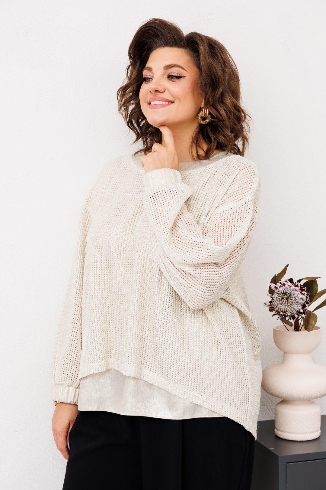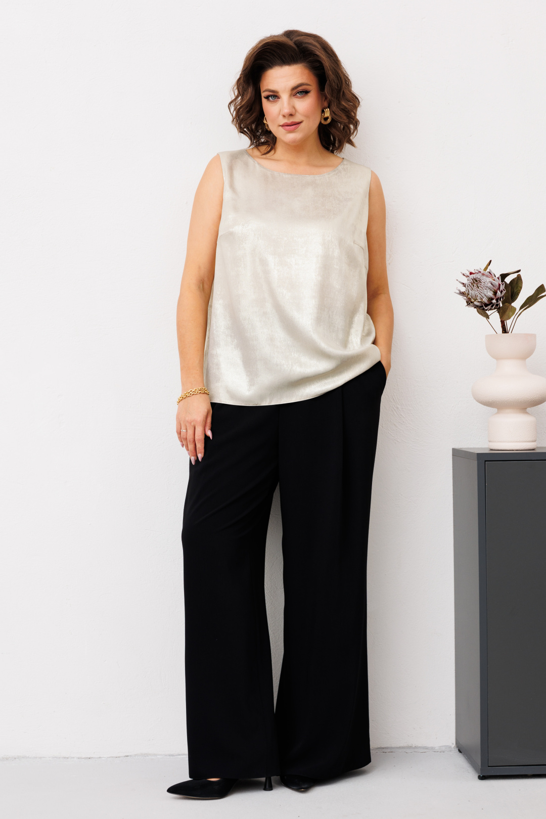 Комплект женский относится к торжественной одежде. Комплект женский 3-х предметный джемпер, топ и брюки. Джемпер прямого силуэта, с фигурным низом. Перед и спинка цельнокроеные, с притачной планкой из отделочной ткани по горловине. Джемпер со спущенным плечом. Рукав втачной, одно шовный, длинный, с притачной манжетой, собранной на эластичную тесьму. Джемпер без плечевых накладок. Топ женский прямого силуэта, длиной до линии бёдер. Перед с 2-мя нагрудными вытачками. Спинка цельнокроеная. Горловина круглая, без воротника. Проймы обтачные. Топ на подкладке. Брюки женские прямые широкие, длинные. Передние половинки с односторонними складками и карманами в боковых швах. Задние половинки с таллиевыми вытачками. Брюки с притачным поясом, собранным на эластичную тесьму, закреплённую 2-мя отделочными строчками.