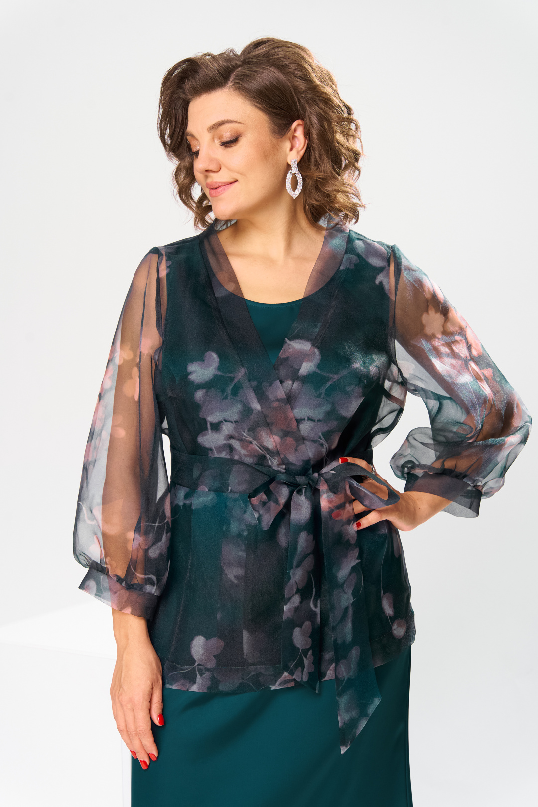 Комплект женские, относится к торжественной и нарядной одежде. Комплект женский, 2-х предметный, кардиган и платье. Кардиган женский, прямого силуэта. Перед с 2-мя нагрудными вытачками. Спинка цельнокроена. Горловина с V-образным вырезом с притачной планкой по краю борта и горловине. Кардиган без застёжки, фиксируется на съёмный пояс. Рукав втачной, одно шовный, длиной 3/4, по низу со сборкой и притачной манжетой. Кардиган без плечевых накладок. Платье женское, полу прилегающего силуэта, слегка расширено к низу, длиной до нижней части икры. Перед с 2-мя нагрудными вытачками. Спинка со средним швом и 2-мя таллиевыми вытачками. Горловина круглая обточная без воротника. Застёжка на потайную тесьму молнию в левом боковом шве платья. Платье без рукавов, проймы обточены. По краю пройм и краю горловины отделочная строчка-0,6 см.