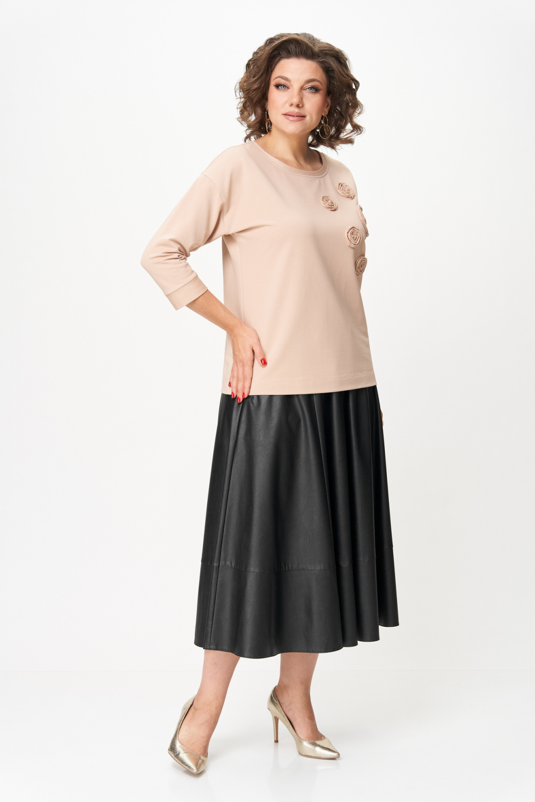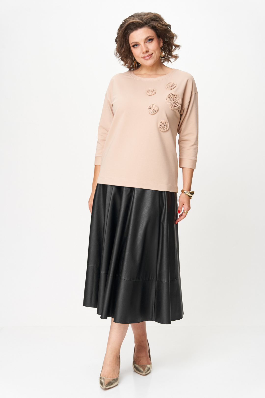 Джемпер женский из трикотажной хлопковой ткани (двунитка). По переду джемпера расположены декоративные элементы. Спущенное плечо, рукав 3/4. Низ рукава обработан манжетой. Вырез горловины круглый, оформлен бейкой.