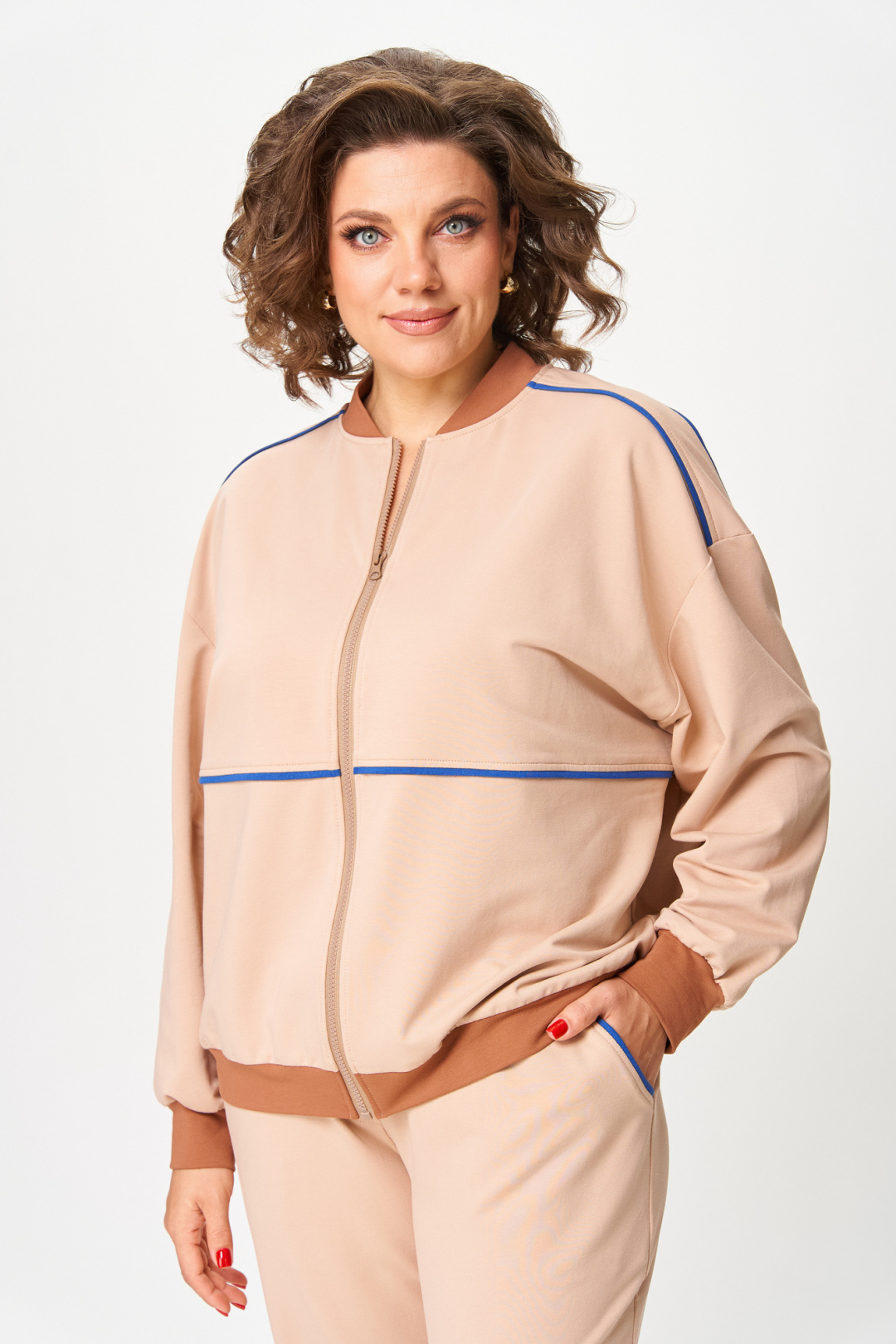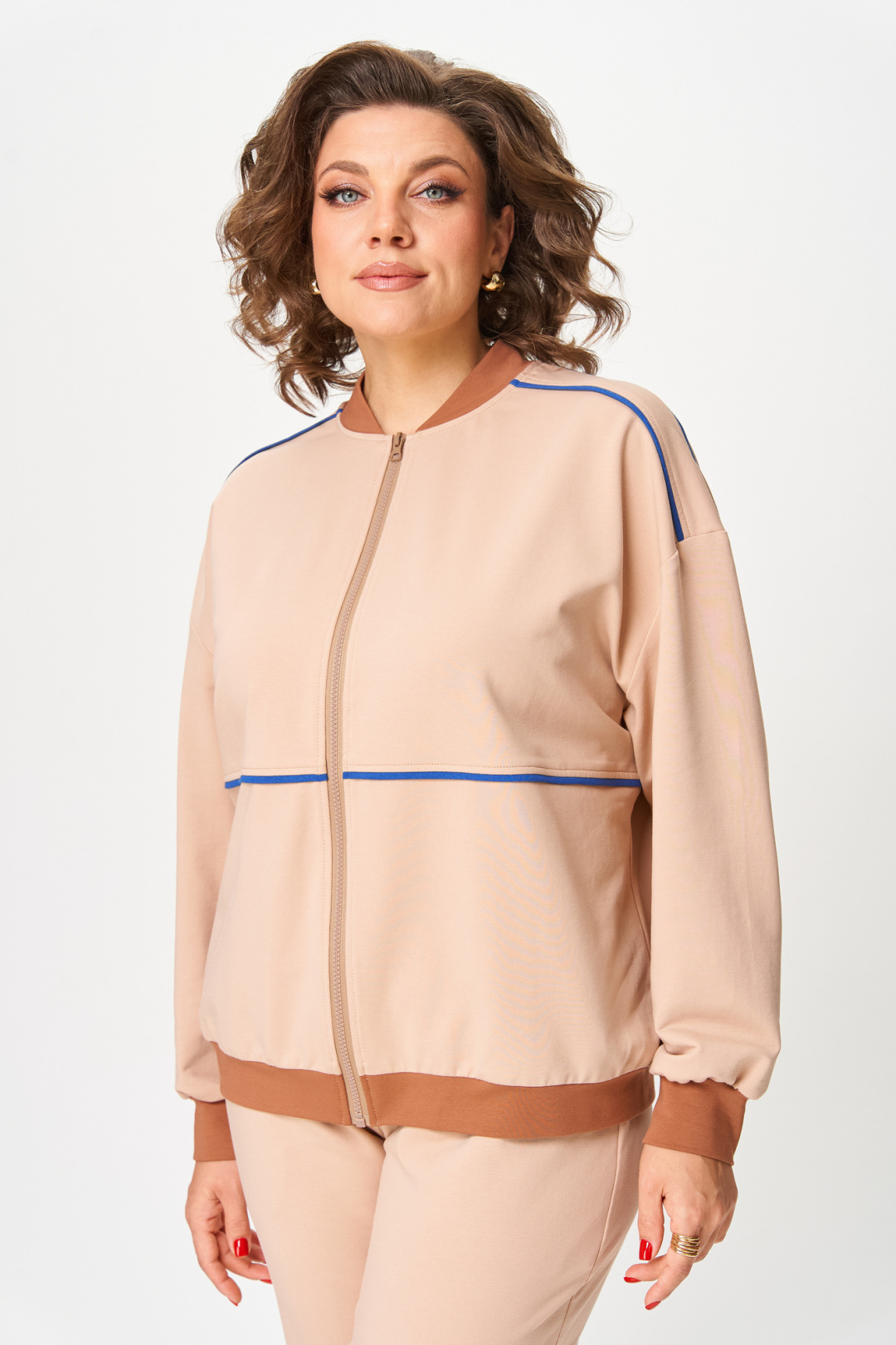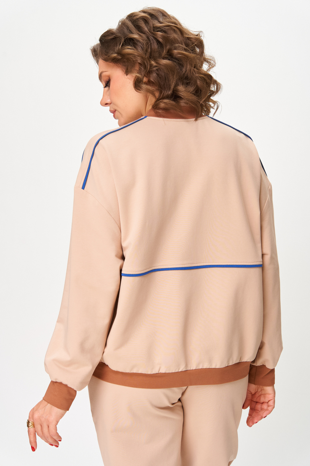Джемпер женский из трикотажной ткани. По переду и спинке джемпера расположены декоративные подрезы с элементами вставок. Спущенное плечо. Низ рукава оформлен манжетой. Низ изделия обработан притачным поясом. Вырез горловины оформлен стойкой. Джемпер застегивается на молнию.