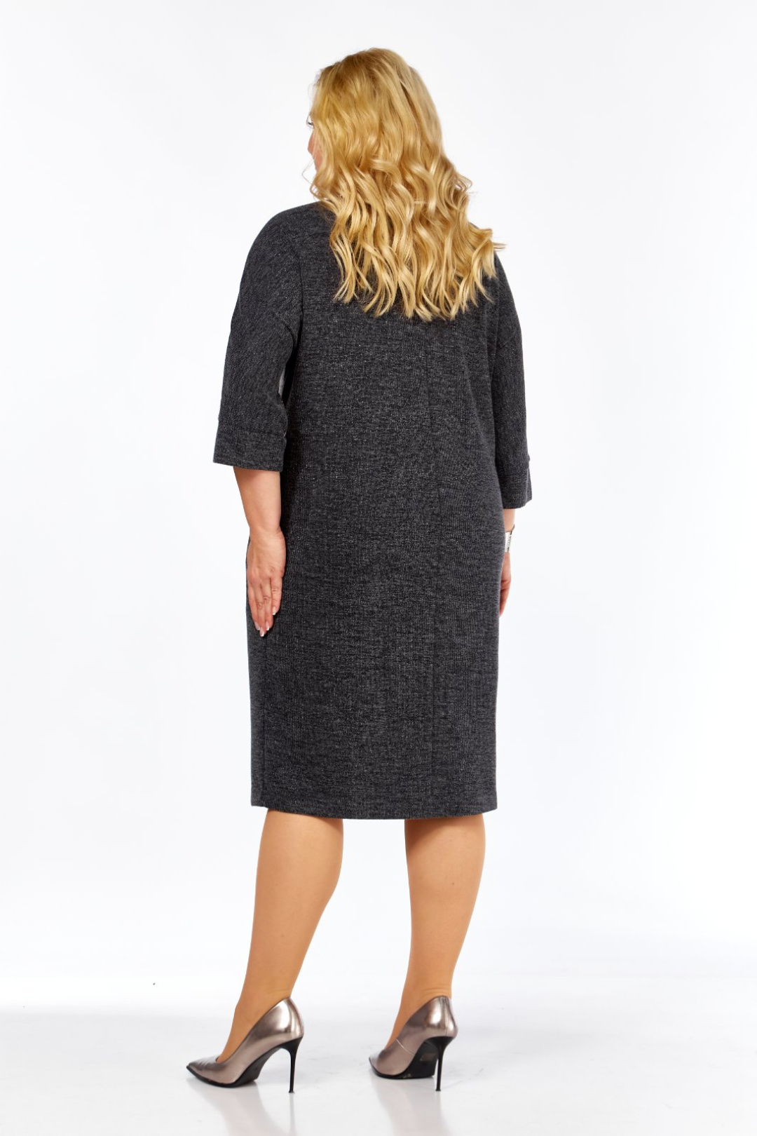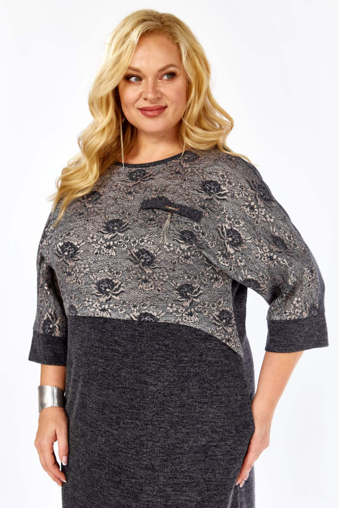 Силуэт полуприлегающий. Рукав цельнокроеный, «летучая мышь». Низ рукава на манжетах. Длина рукава от горловины 52см. Горловина платья закруглённой формы, оформлена отрезной бейкой. Перед состоит из двух частей, изготовленных их разного материала. Верхняя деталь переда выполнена из трикотажного полотна, стилизованного под гипюр. Соединение верхней и нижней частей переда имеет отлетной край. В верхней части переда, слева, расположен клапан, украшенный пришивными элементами. Спинка со средним швом. В боковых швах платья на уровне линии бёдер выполнены потайные карманы. Длина платья по спинке 104 см. 60 р. – ПОГ 63, ПОБ 65