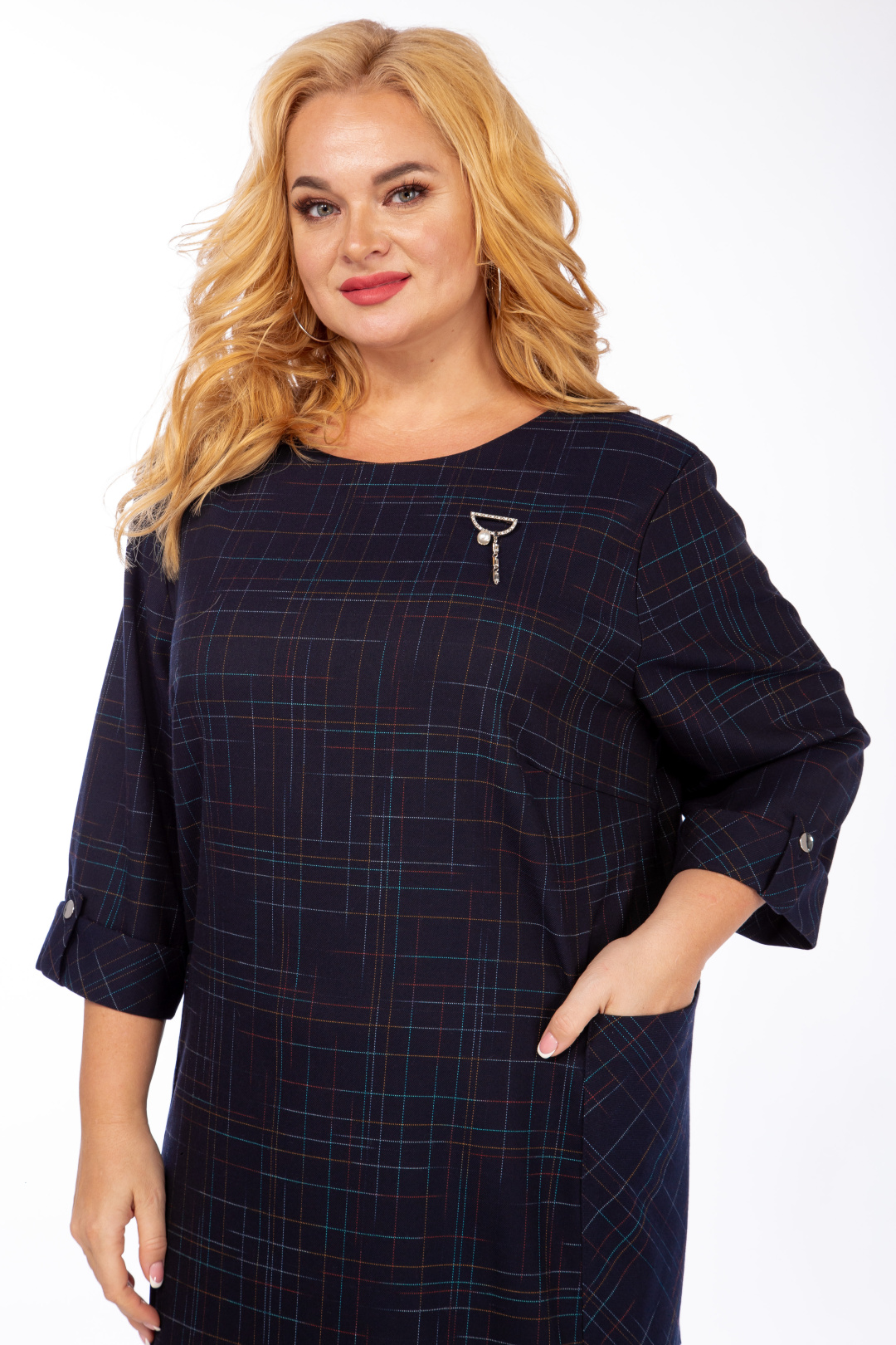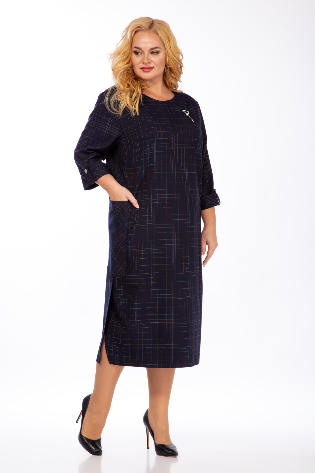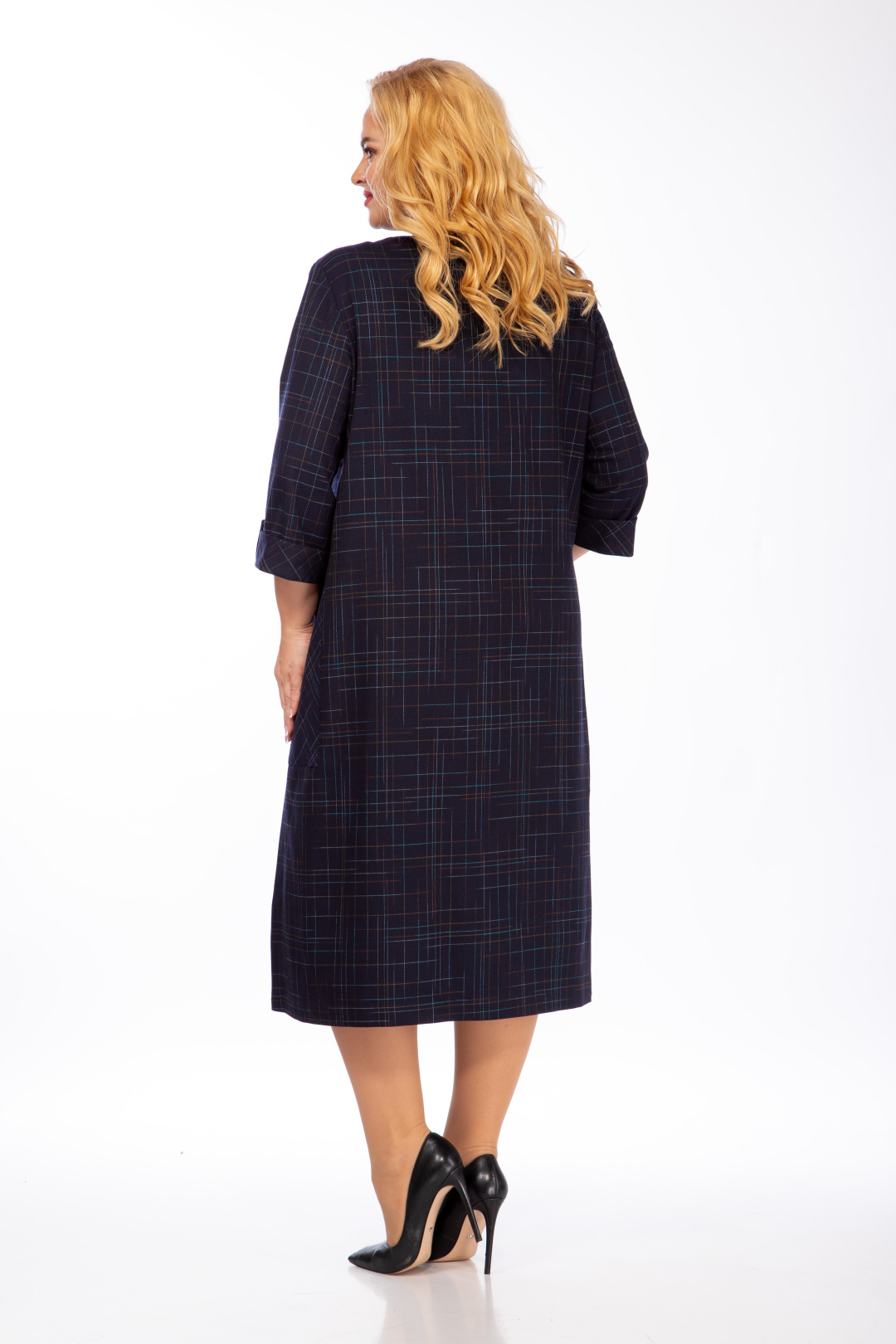 Силуэт полуприлегающий, расширенный к низу. Рукав втачной, одношовный. Внизу рукава выполнены отвороты, закреплённые патой с застёжкой на пуговицу. Длина рукава 45 см. Горловина закруглённая, на обтачке. Перед с нагрудными вытачками. На уровне бёдер по бокам расположены накладные карманы. Внизу боковых швов выполнены шлицы. Длина платья 118 см. Платье выполнено из ткани костюмно-плательной группы.