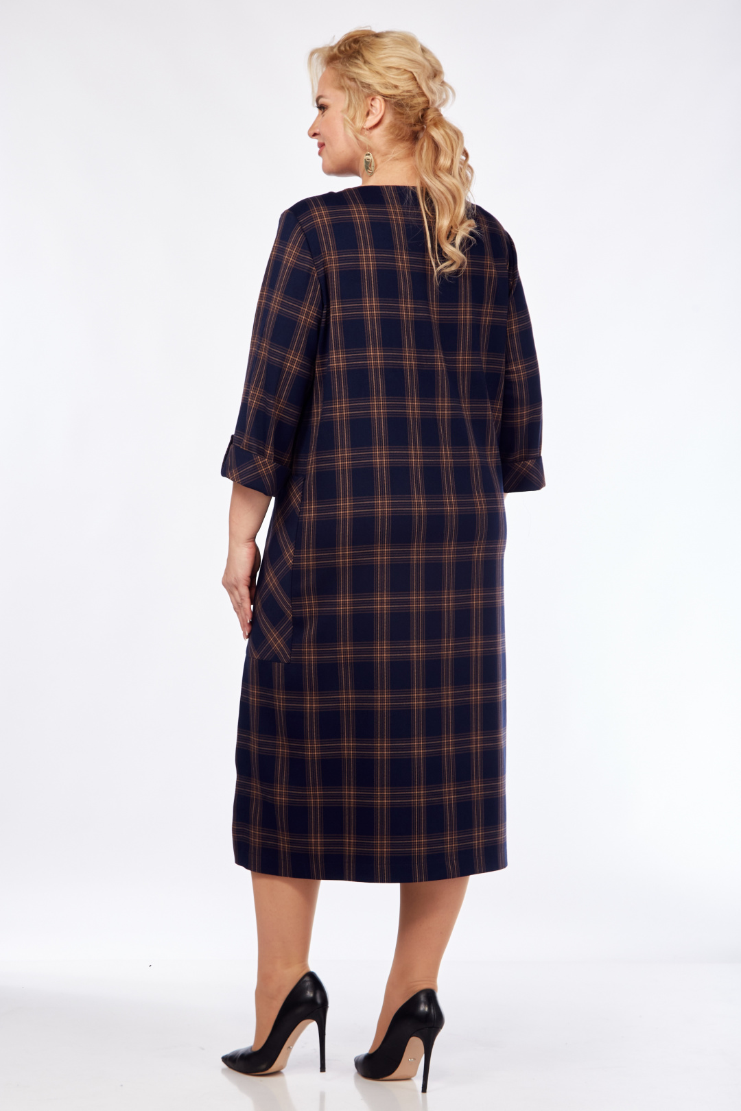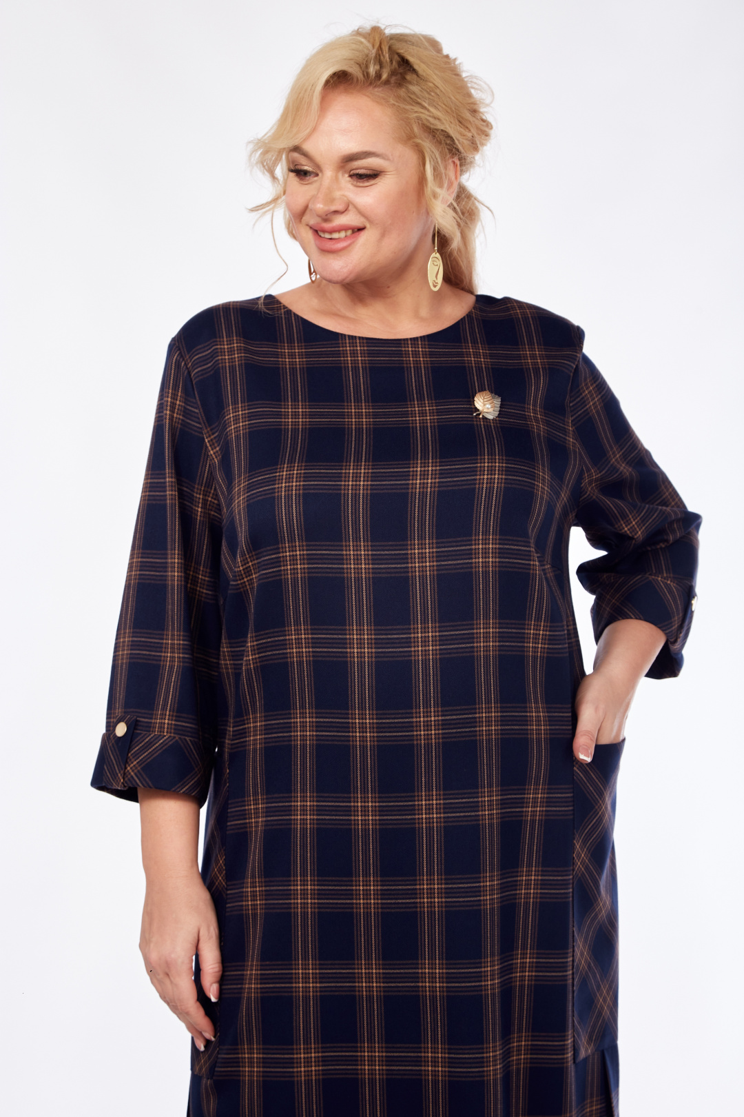 Силуэт полуприлегающий, расширенный к низу. Рукав втачной, одношовный. Внизу рукава выполнены отвороты, закреплённые патой с застёжкой на пуговицу. Длина рукава 45 см. Горловина закруглённая, на обтачке. Перед с нагрудными вытачками. На уровне бёдер по бокам расположены накладные карманы. Внизу боковых швов выполнены шлицы. Длина платья 118 см. Платье выполнено из ткани костюмно-плательной группы.