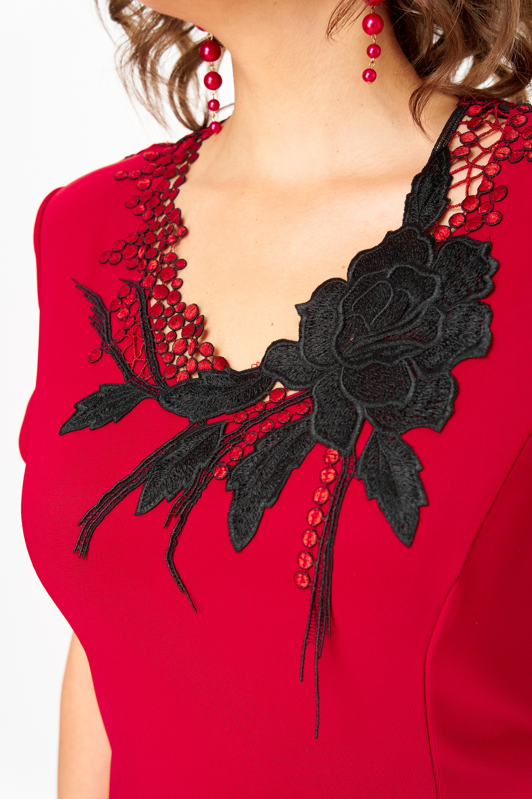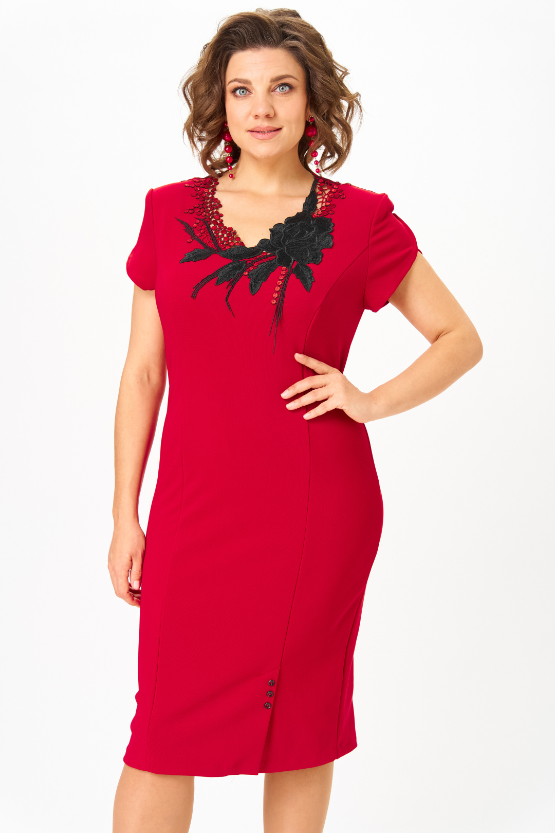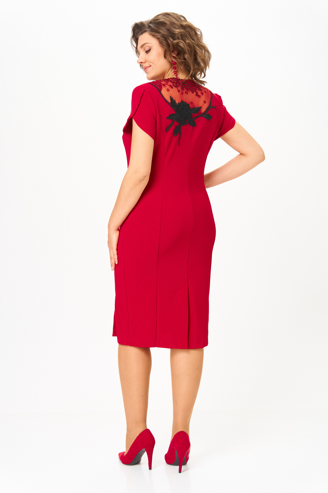 Платье облегающего силуэта. Украшением изделия служит вставка-аппликация, вышитая на сетке. Аппликация расположена спереди и по спинке платья. По передней части рельефы, внизу полочки слева вырез. Рукава короткие фигурные.