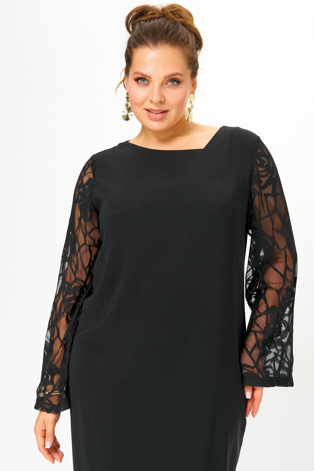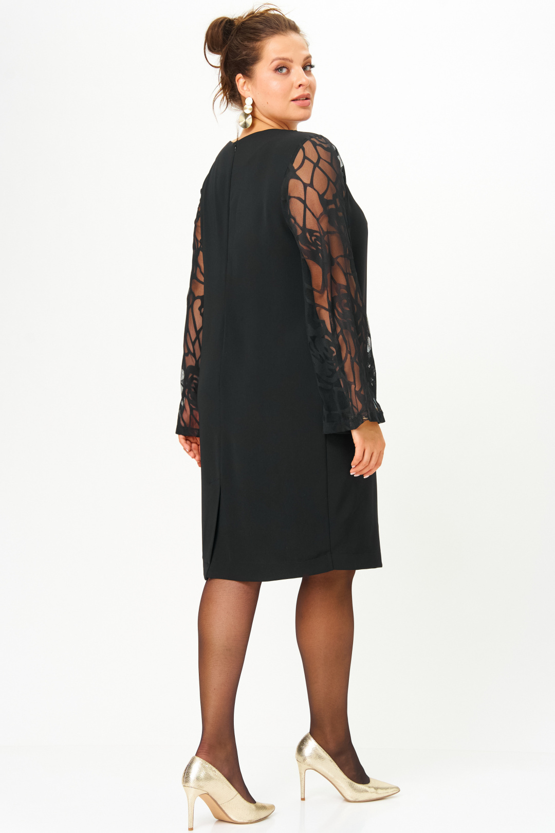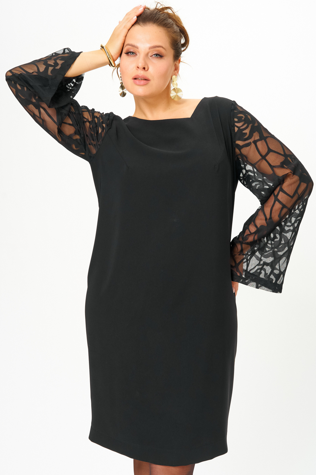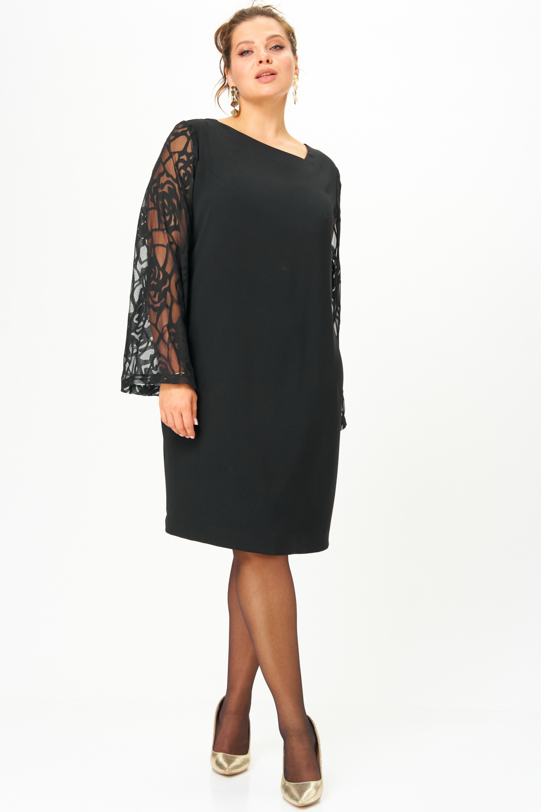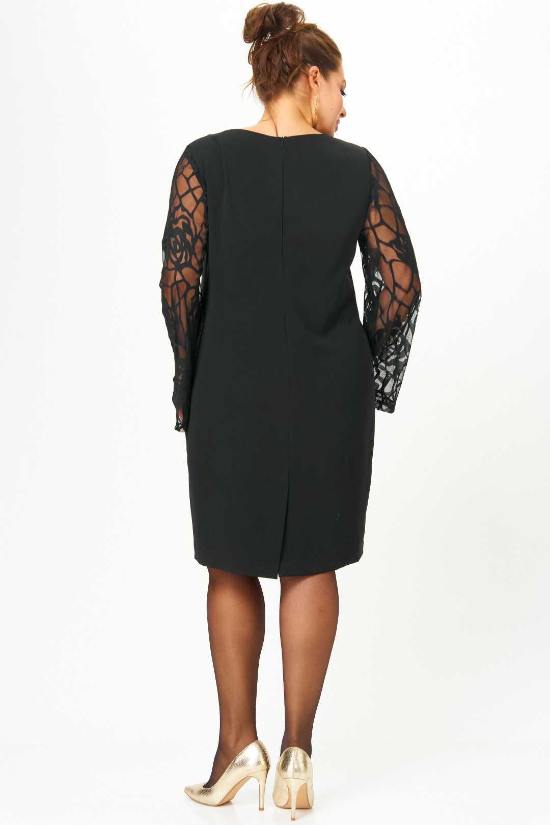Элегантное черное платье идеально подойдет для нарядного выхода. Это изделие отличается полуприлегающим силуэтом и базовой посадкой, что обеспечивает комфорт и подчеркивает фигуру. Особенностью платья является асимметричный вырез горловины, придающий изысканный вид. Рукава длиной 3/4 выполнены из мягкой трикотажной сетки с крупным цветочным узором, добавляющим нежности и романтичности образу. Это платье станет вашим надежным выбором для торжественных событий и вечерних мероприятий.