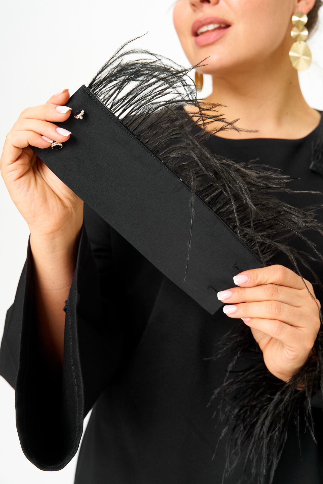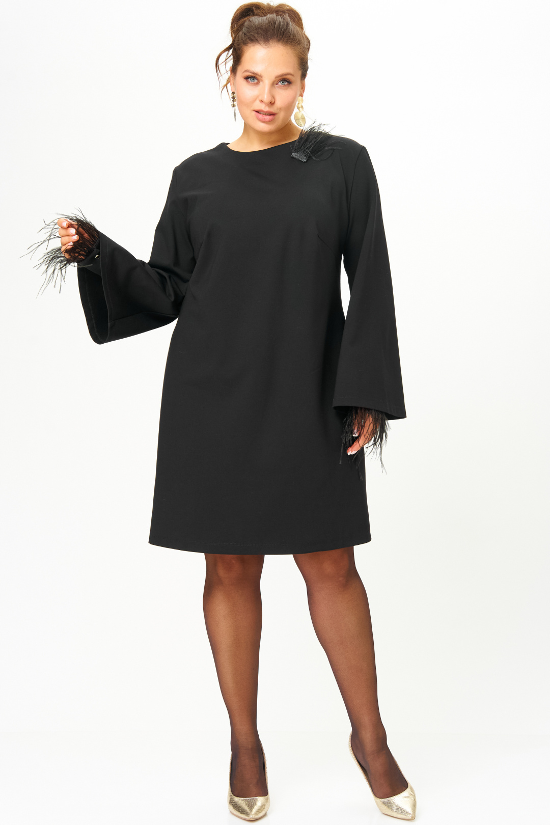 Элегантное черное трикотажное платье А-силуэта - идеальный выбор для создания стильного образа. Модель с длинными рукавами, расширяющимися к низу, дополнена изысканными съемными манжетами из атласной ткани, декорированными "перьями", что добавляет нарядности и романтичности. Платье подходит как для вечеринок, так и для повседневной носки, обеспечивая универсальность и комфорт.