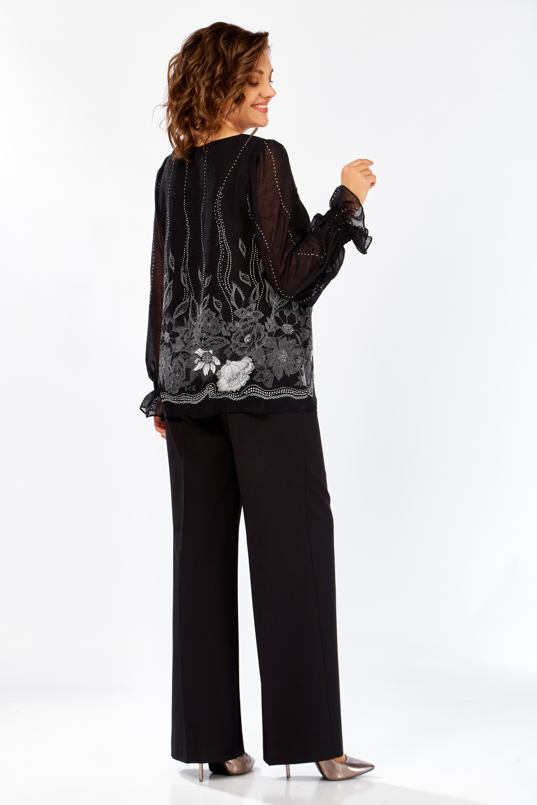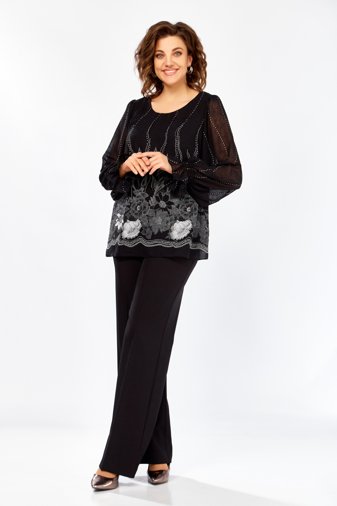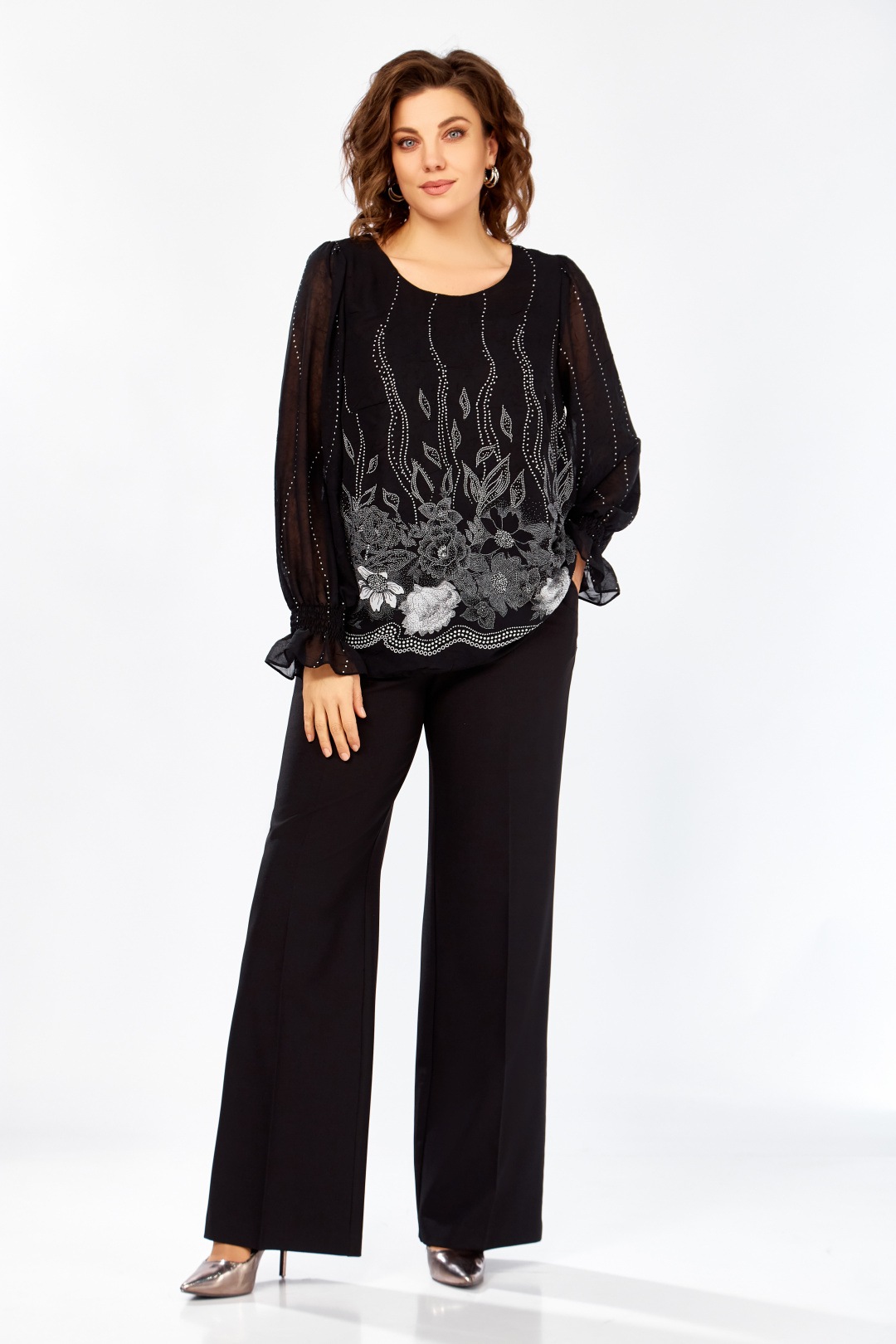 Блузка А-силуэта из нежной шифоновой ткани с лёгким эффектом «жатки», на подкладке из шифона. Полочка с нагрудными выточками, спинка без особенностей. Горловина круглая. Рукав втачной длинный по окату со сборкой, в нижней части собран на эластичную нить, которая внизу образует рюшу высотой 6 см. Длина по спинке в р.52-56 – 64 (+/-2) см? р. 58-62 – 68 (+/-2) см. Длина рукава – 64 см.