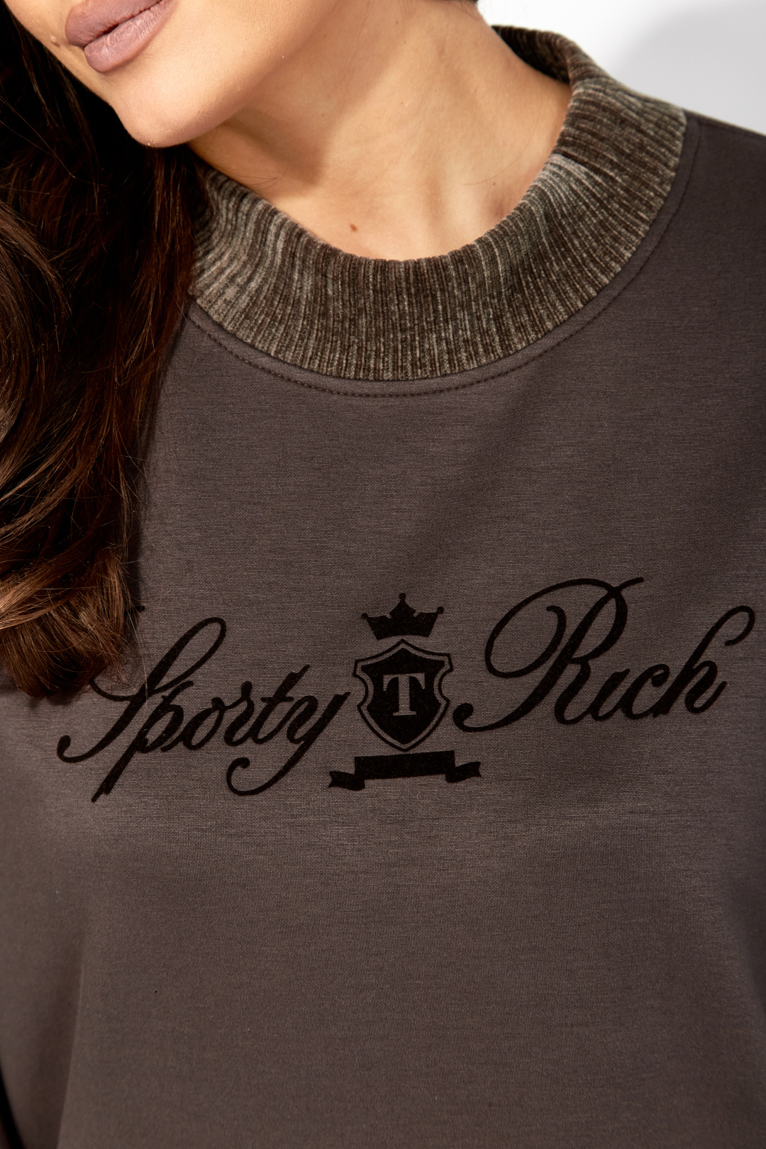 Комплект женский, 2х предметный, состоящий из джемпера и брюк, в сочетании двух видов трикотажного полотна. Джемпер прямого силуэта, с рукавом длинной 3/4. Рукав со спущенной линией плеча. По низу отрезная манжета. Горловина круглой формы, с широкой подрезной бейкой. По низу переда отрезная планка. Перед задекорирован принтом. Манжеты рукавов, бейка горловины и планка низа из отделочного трикотажного полотна. Спинка без особенностей. Брюки прямые. По переду наклонные карманы. Пояс притачной с резинкой и кулисой.