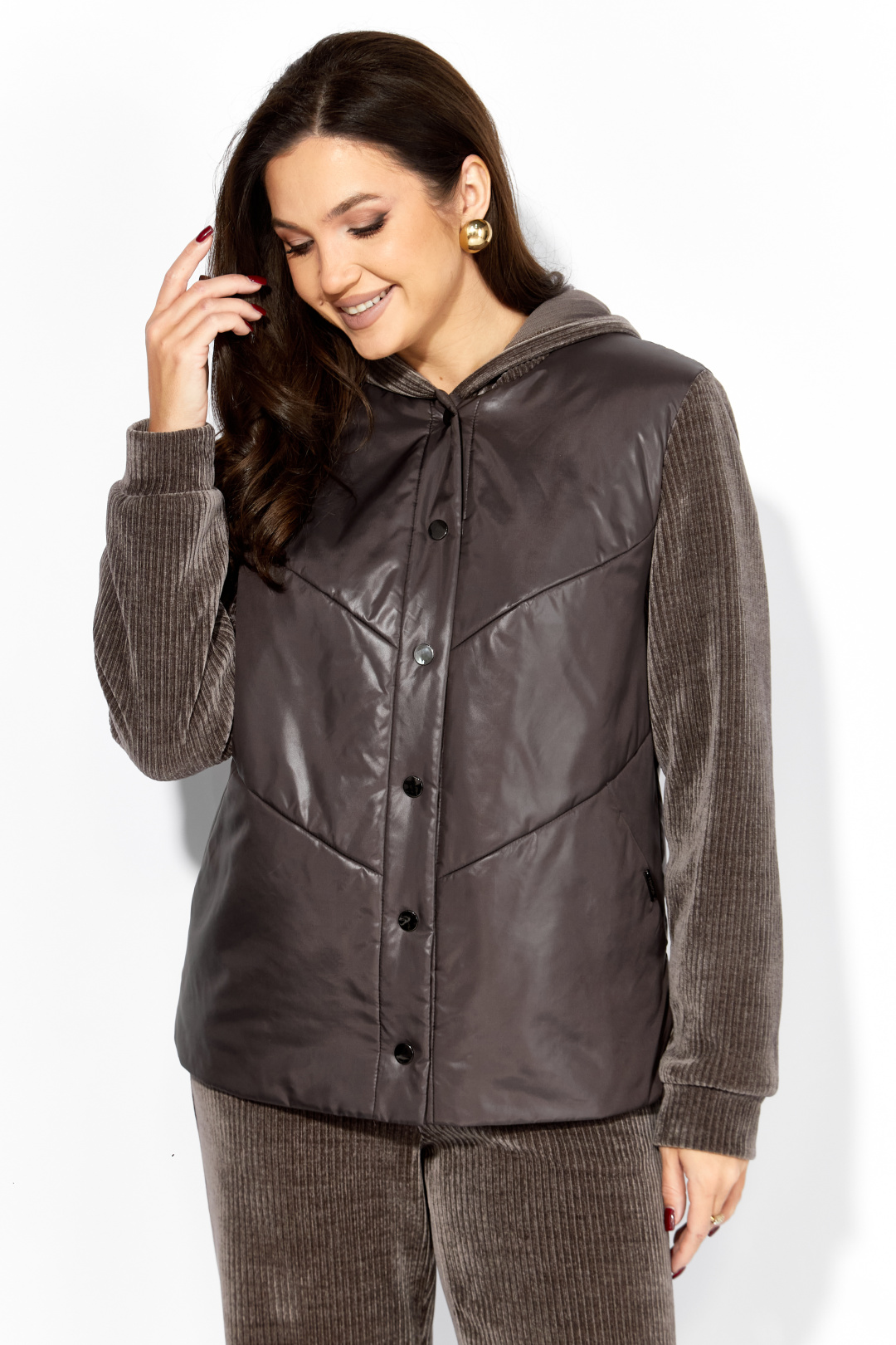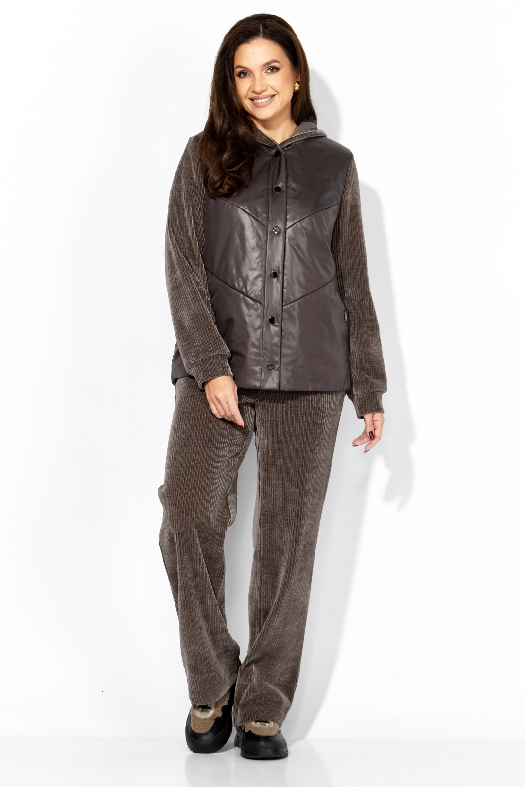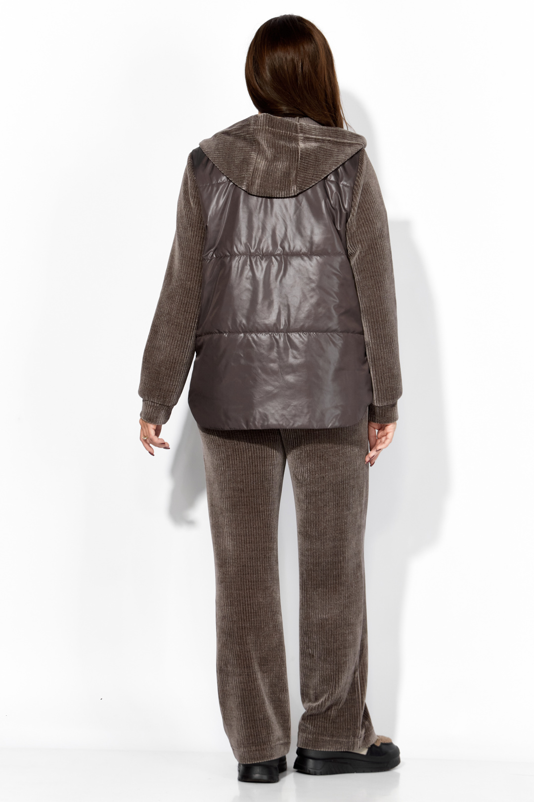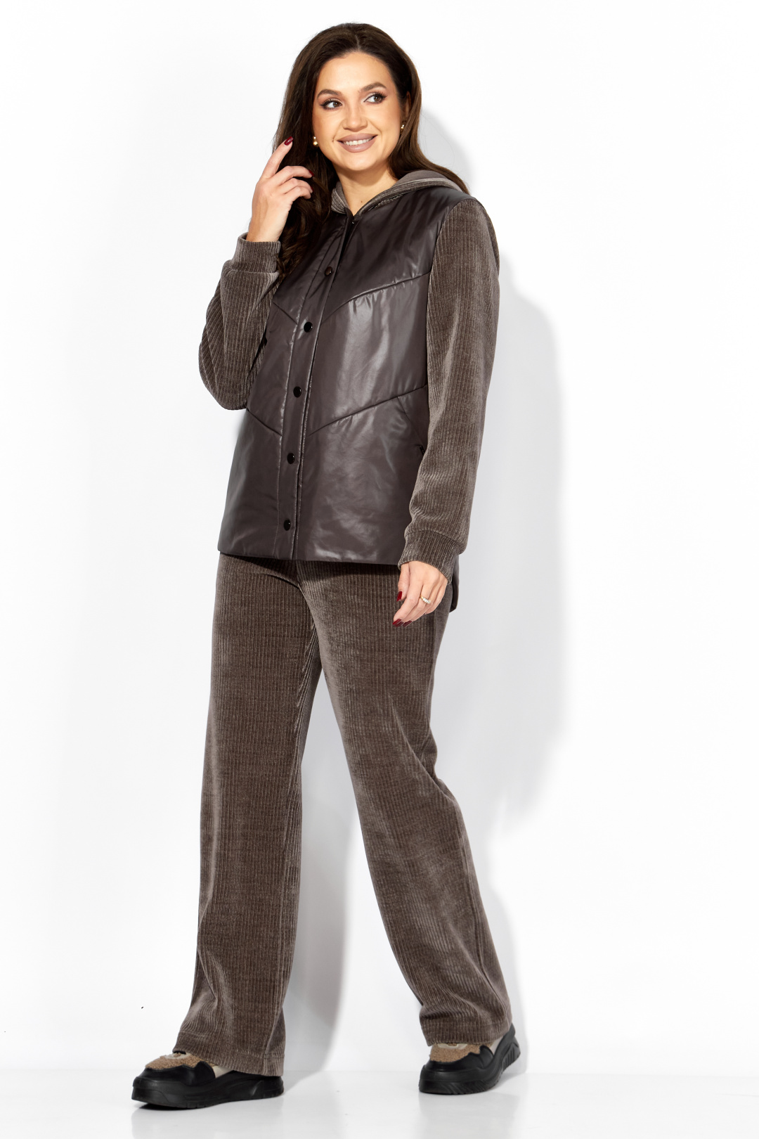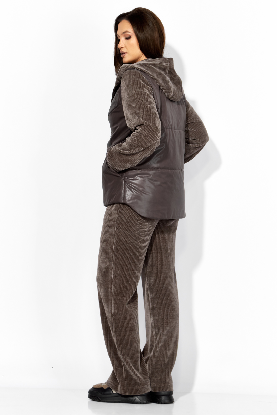 Комплект женский, 2х предметный, состоящий из куртки и брюк, выполнен из двух видов ткани-плащевка на синтепоне и вельвет на трикотажной основе. Куртка прямого силуэта. По переду наклонные рельефы и функциональные карманы. Застежка центральная, с отрезной планкой на кнопки. Рукав длинный, втачной с манжетой по кругу. Горловина оформлена манжетой по низу. Горловина оформлена капюшоном. Спинка с широкой стежкой, чуть удлиненная по низу. Перед спинки на подкладке.