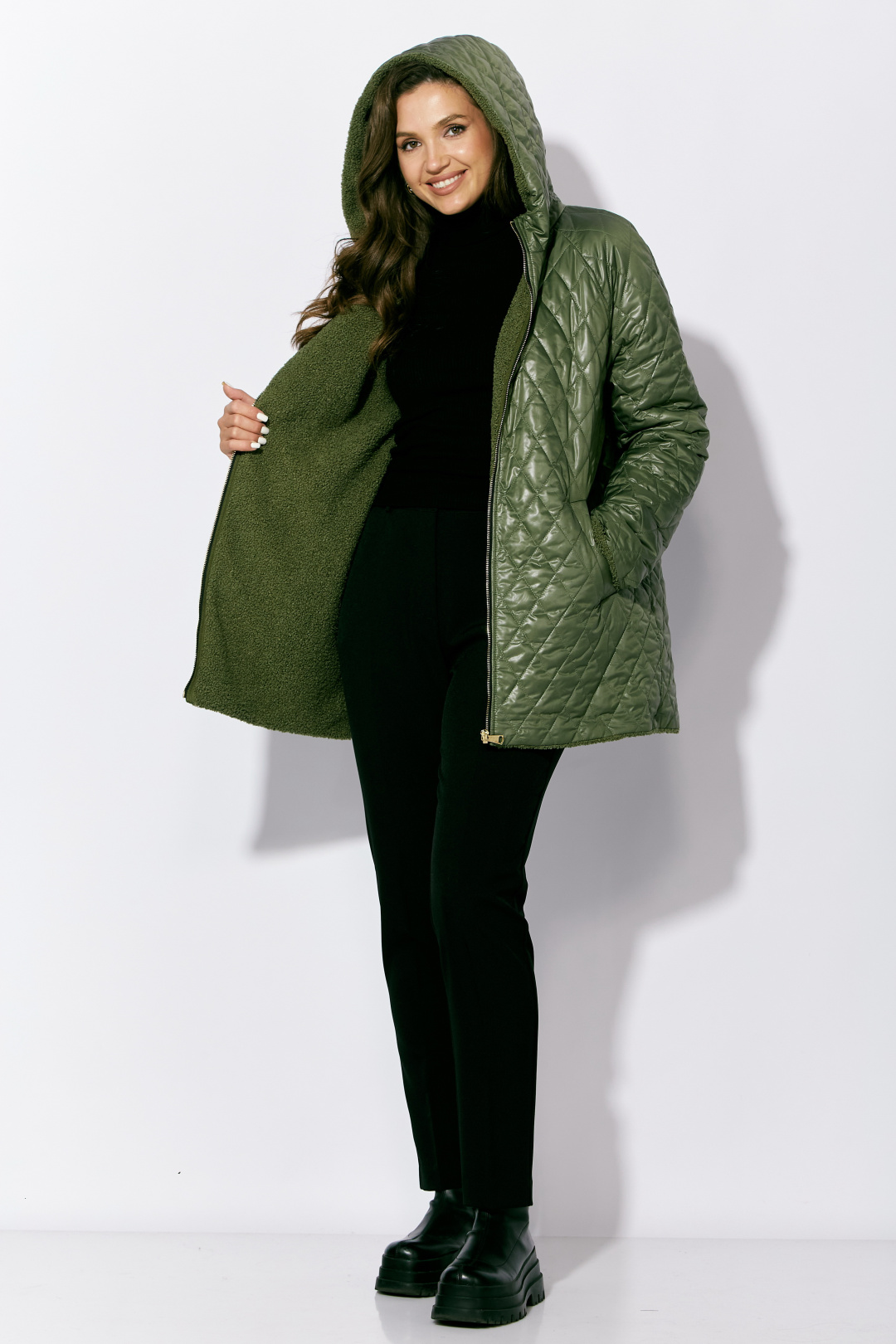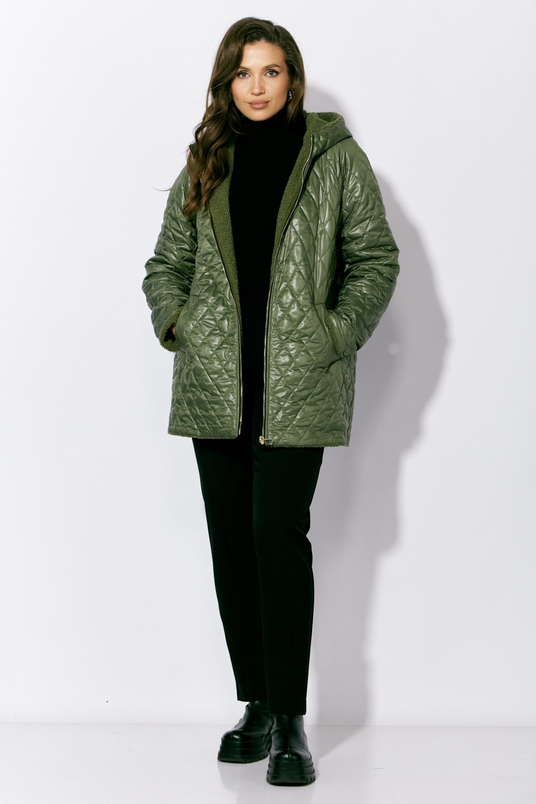 Куртка женская, демисезонная. Верх куртки - плащевка, стеганная на синтепоне. Подкладка - экомех "барашек". Куртка прямого силуэта с длинным рукавом "реглан". Длина рукава может регулироваться отворотом. По переду центральная застежка на "молнию" и прорезные, функциональные карманы. Горловина оформлена капюшоном-стойкой по переду.