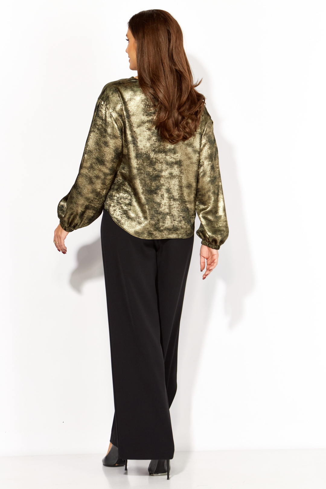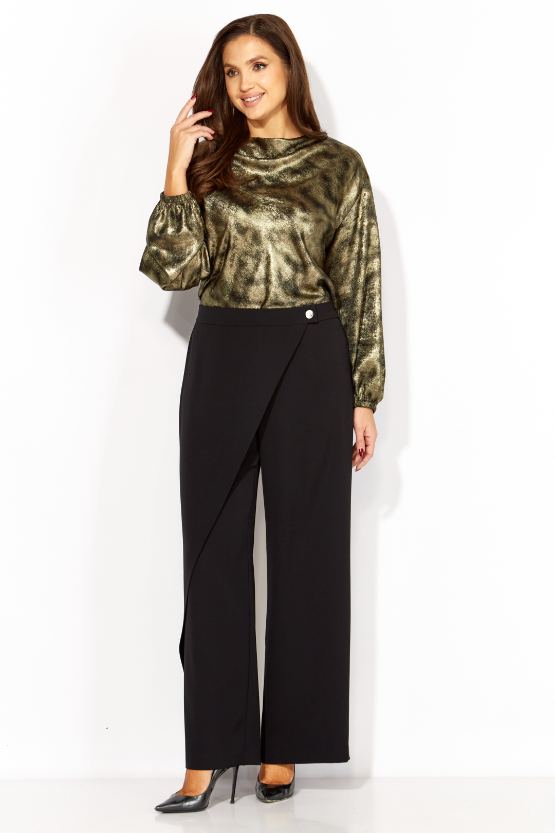 Комплект женский, 2х предметный, состоящий из блузки и брюк. Блузка прямого силуэта с длинным рукавом. Рукав со спущенной линией плеча, мягкой складкой и резинкой по низу. Вырез горловины "лодочка" По переду в области горловины, мягкие складки (качели) Низ блузки ажурной формы. Брюки прямые, из текстильной ткани, с отлетной деталью по переду, закрепленной на отделочную кнопку. застежка брюк спереди на тесьму "молния" и петлю с пуговицей. Пояс отрезной, по переду гладкий, сзади на резинке.