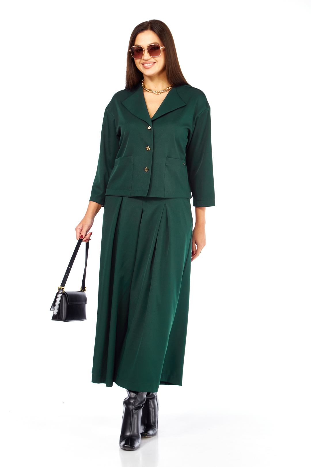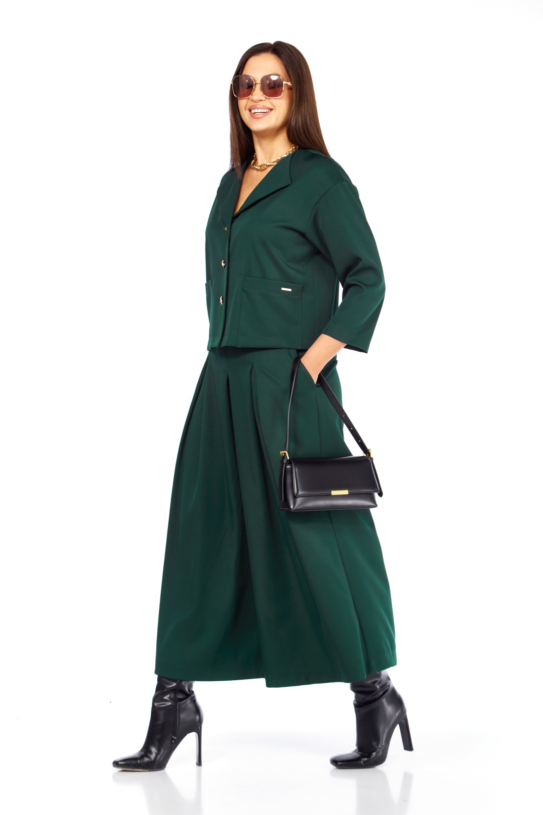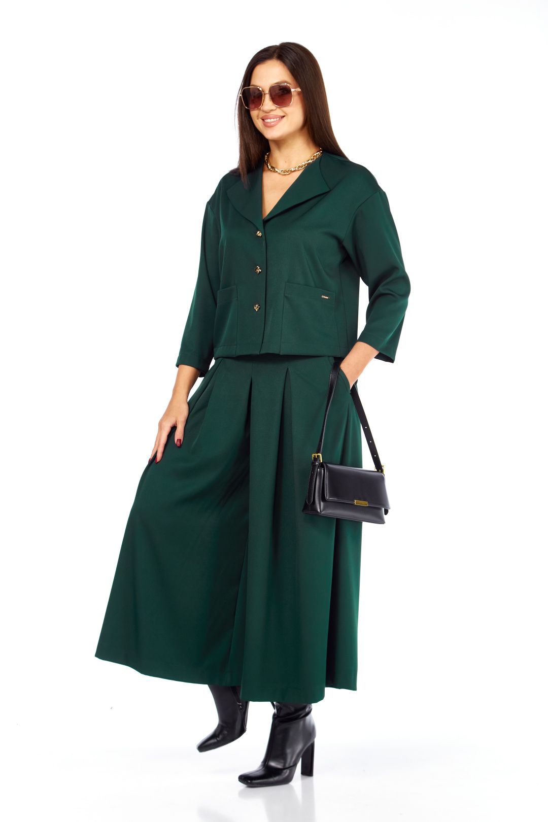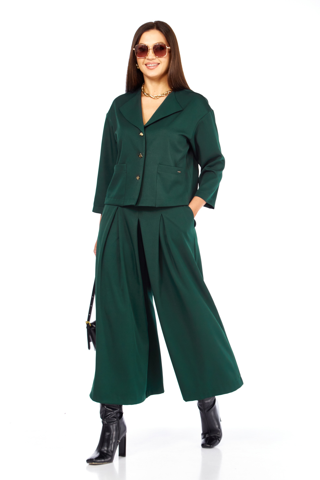 Очень стильный ,элегантный ,модный женский комплект , состоит из юбки-брюк ( кюлоты ) и жакета , с интересным воротником , с дорогой фурнитурой , накладными карманами с лейбой золотистого цвета. Очень интересный фасон кюлот , с хорошей посадкой ,с первого взгляда похожи  на юбку. Длина кюлот- 93 см . пояс со шлевками и на резинке сзади.  Длина жакет р р 46-50 (57 см) , в р 52-54 (59  см).