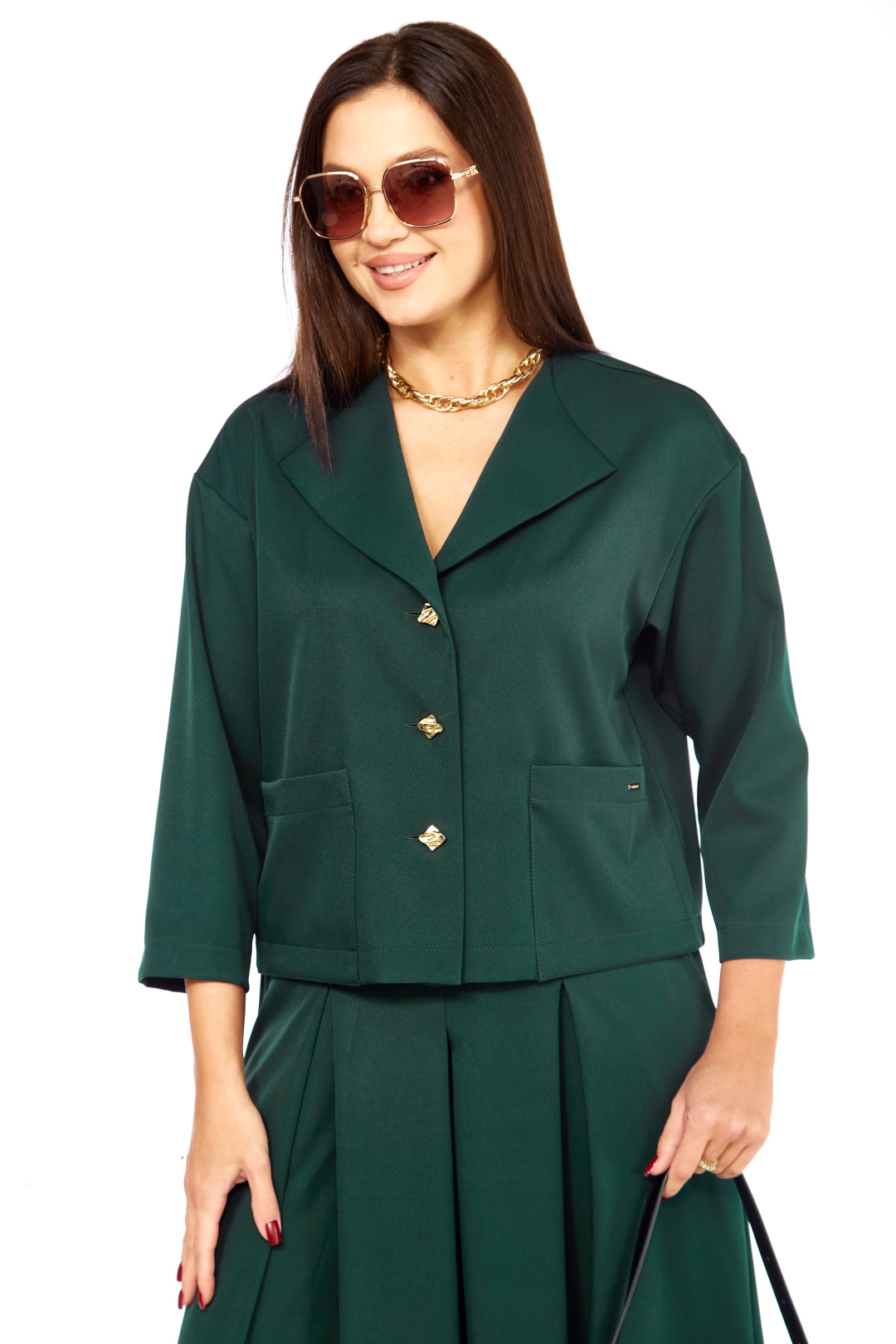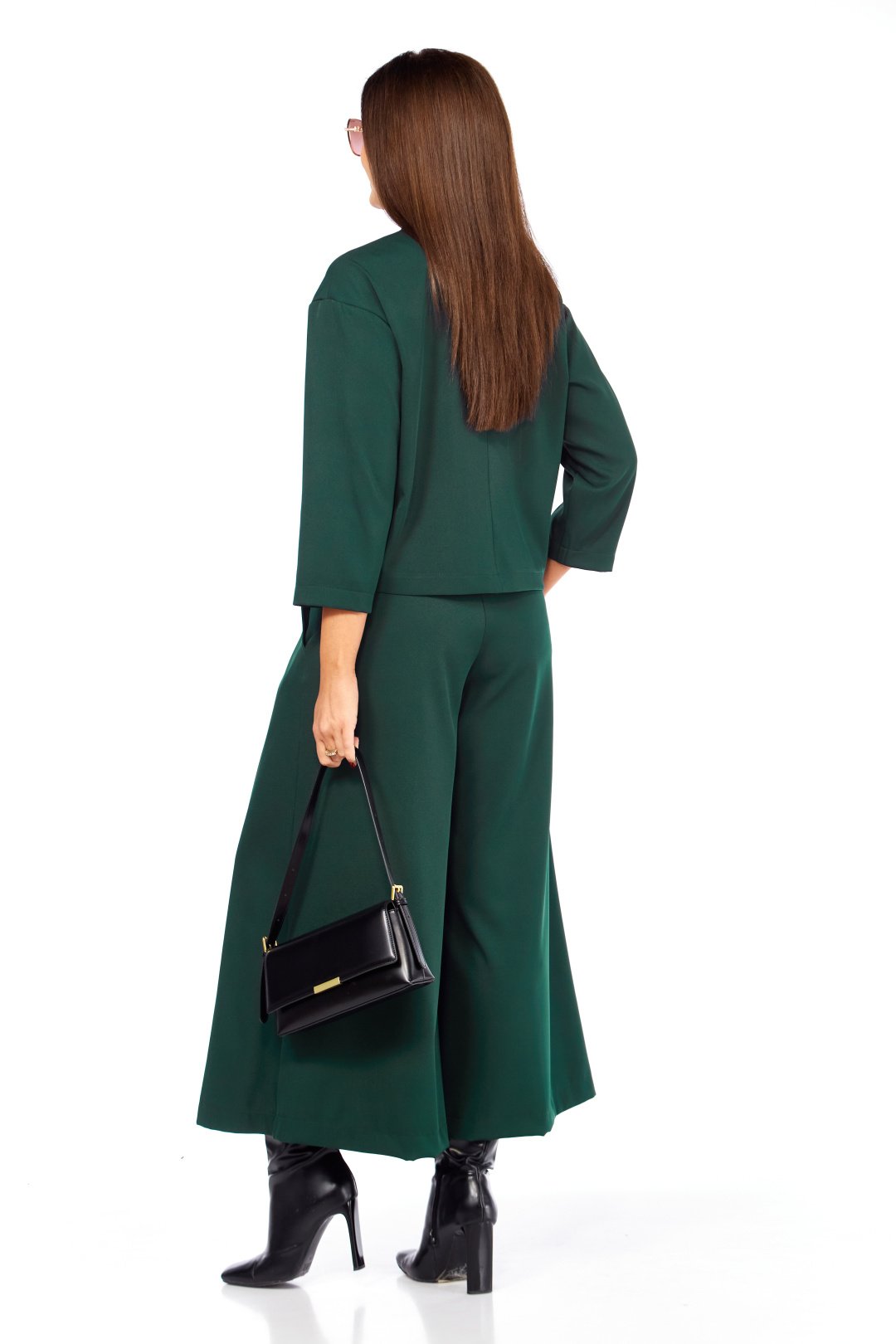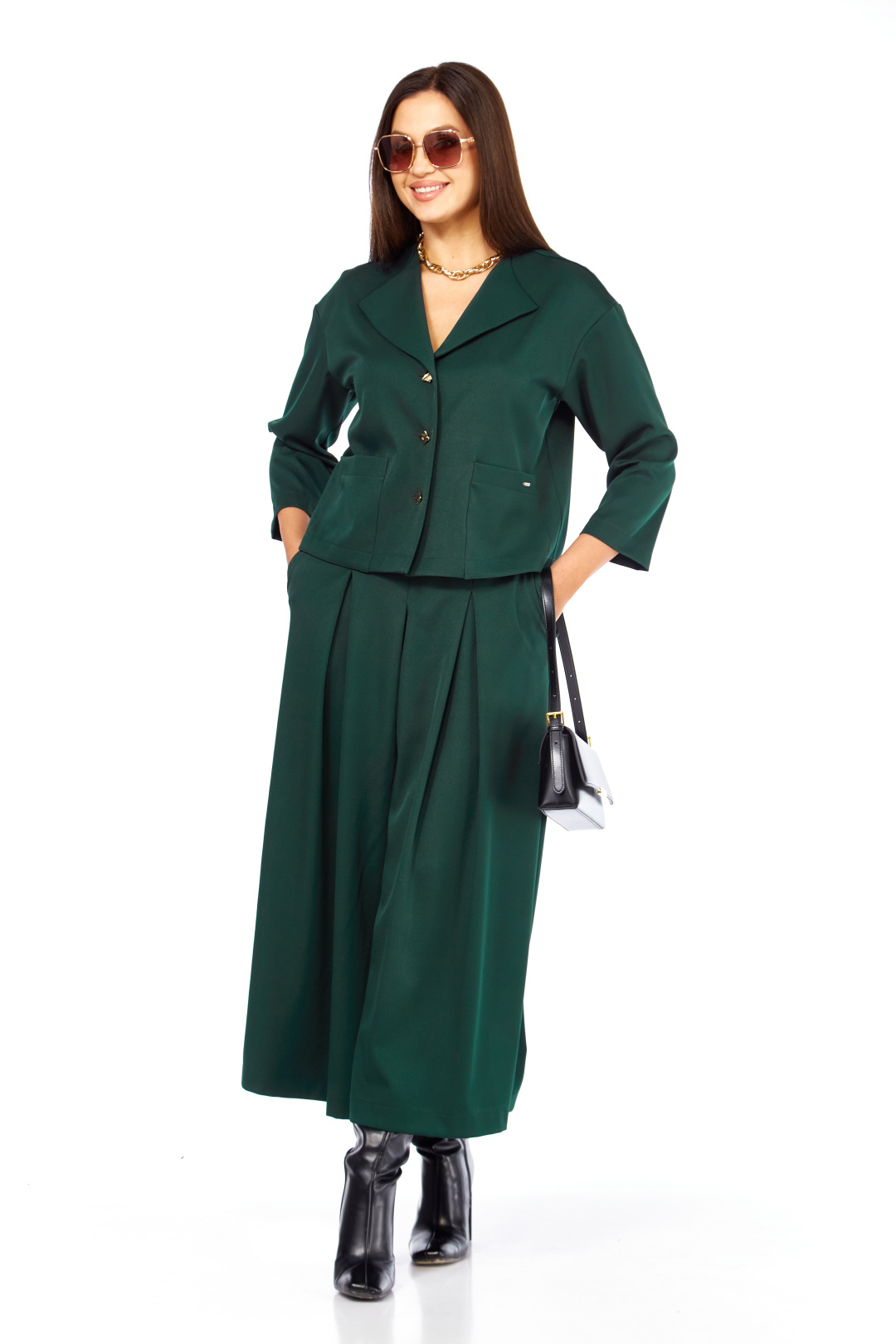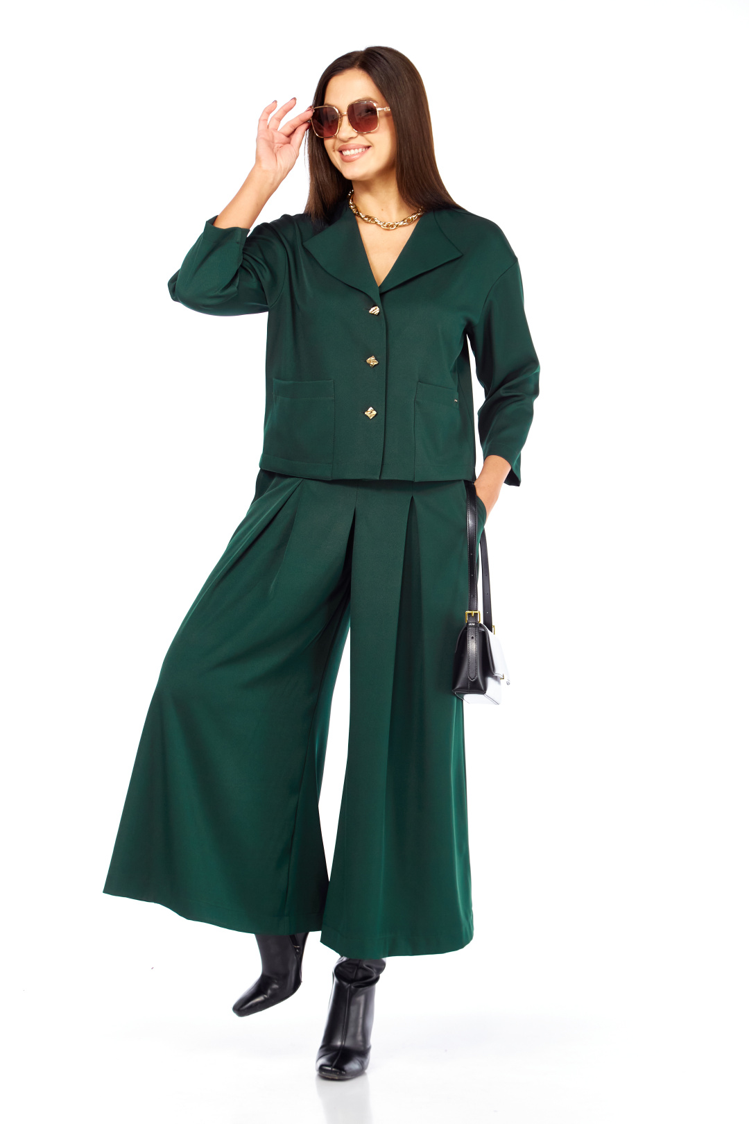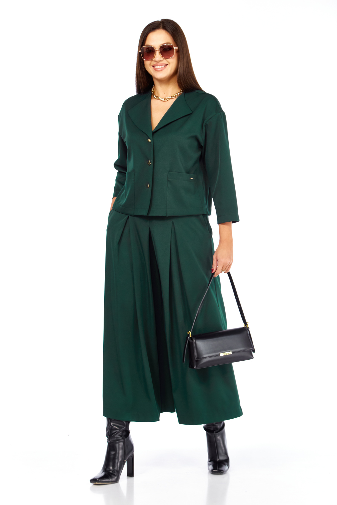 Очень стильный ,элегантный ,модный женский комплект , состоит из юбки-брюк ( кюлоты ) и жакета , с интересным воротником , с дорогой фурнитурой , накладными карманами с лейбой золотистого цвета. Очень интересный фасон кюлот , с хорошей посадкой ,с первого взгляда похожи  на юбку. Длина кюлот- 93 см . пояс со шлевками и на резинке сзади.  Длина жакет р р 46-50 (57 см) , в р 52-54 (59  см).
