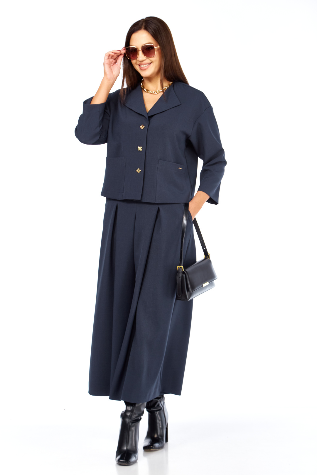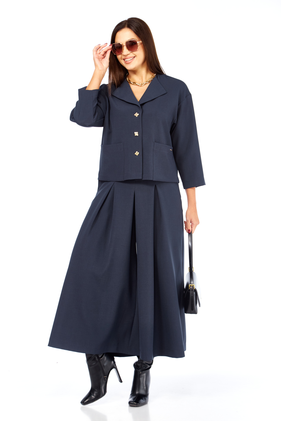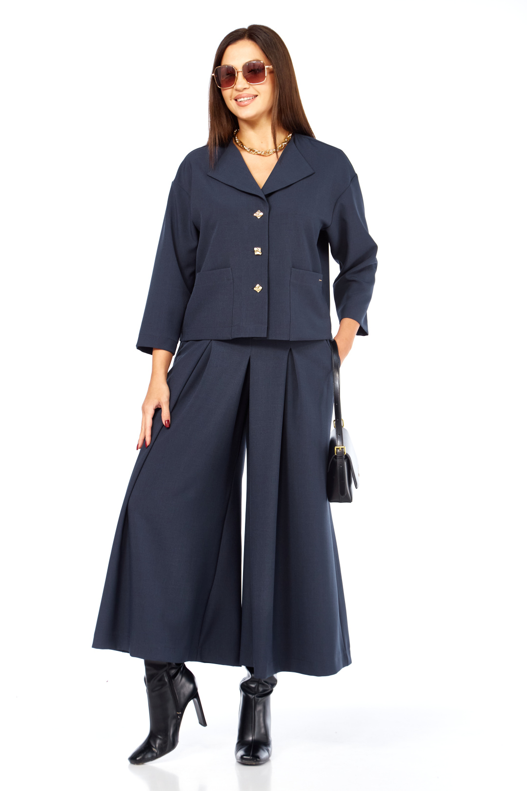 Очень стильный ,элегантный ,модный женский комплект , состоит из юбки-брюк ( кюлоты ) и жакета , с интересным воротником , с дорогой фурнитурой , накладными карманами с лейбой золотистого цвета. Очень интересный фасон кюлот , с хорошей посадкой ,с первого взгляда похожи на юбку. Длина кюлот- 93 см . пояс со шлевками и на резинке сзади. Длина жакет р р 46-50 (57 см) , в р 52-54 (59 см).