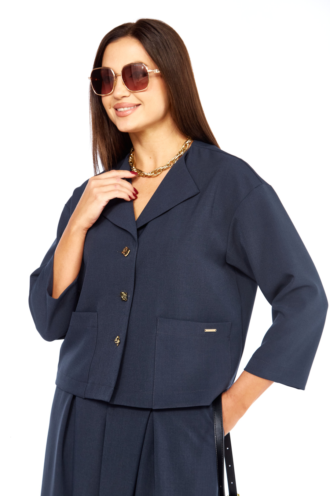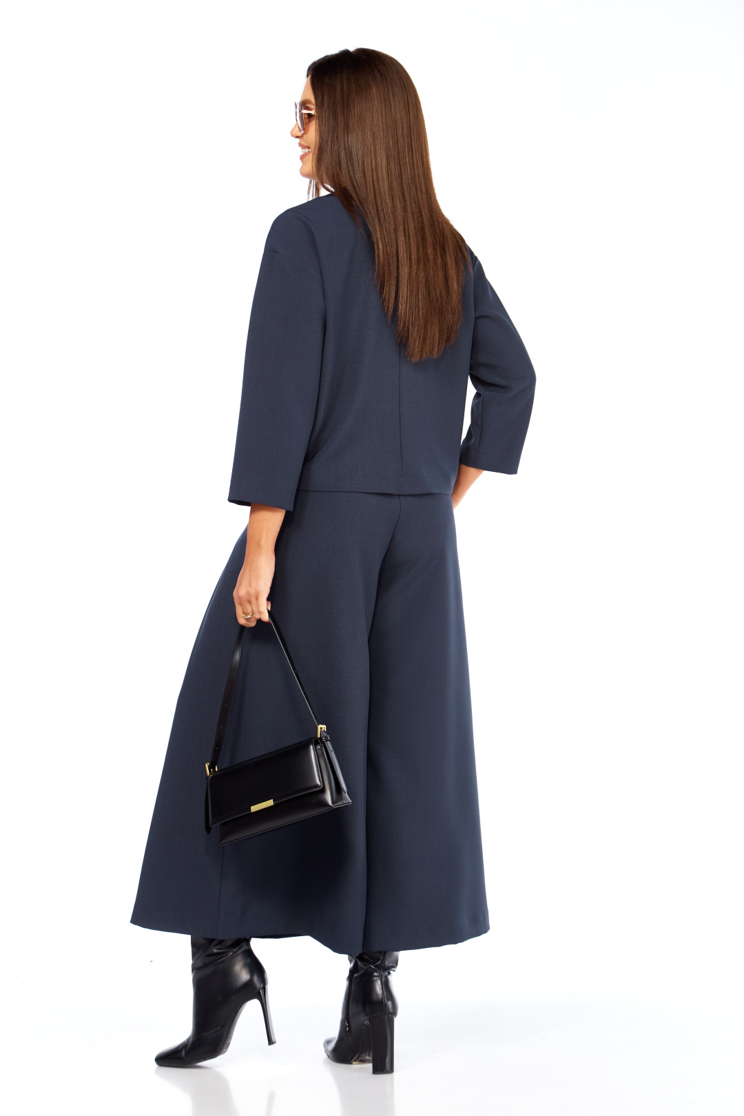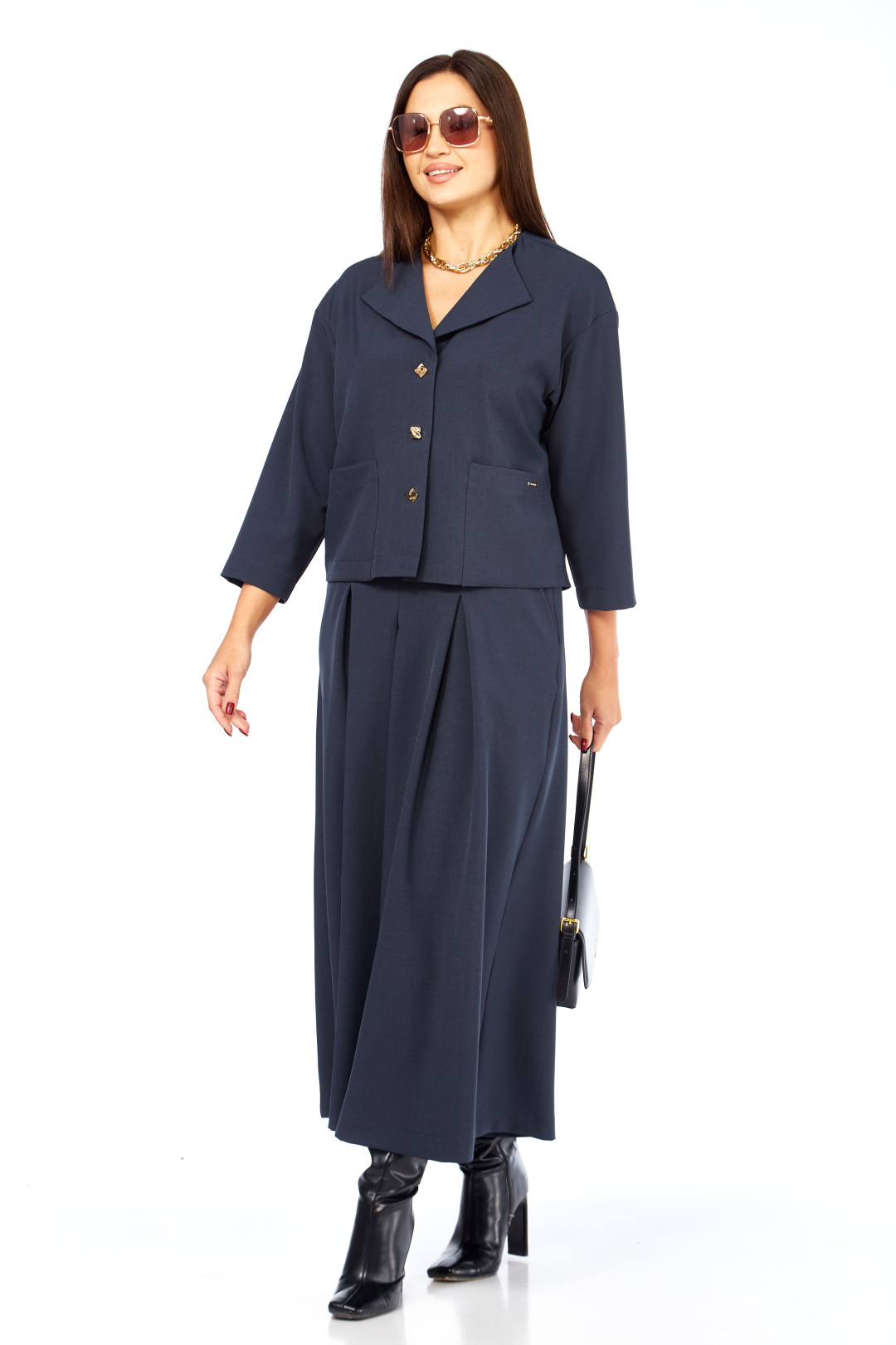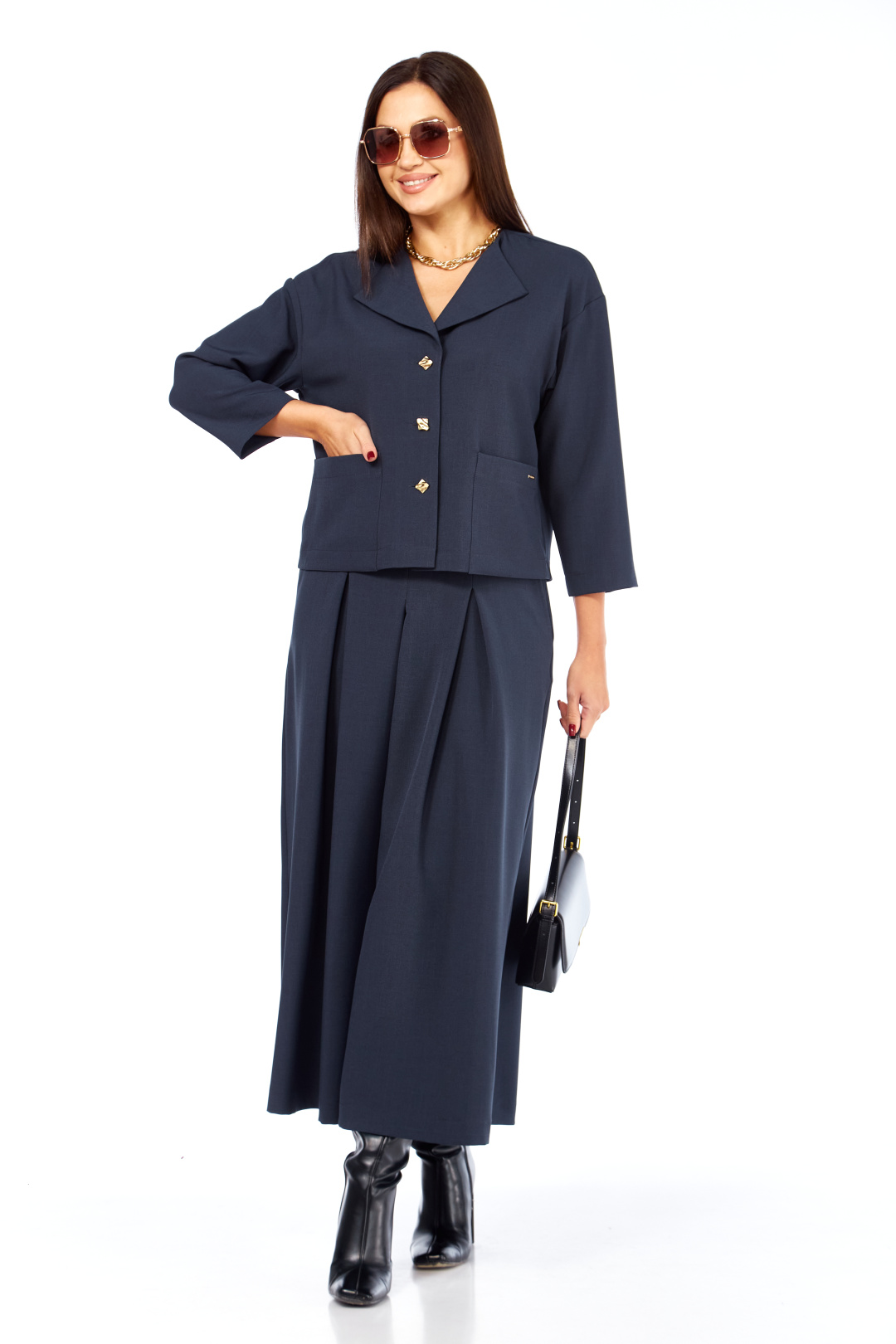 Очень стильный ,элегантный ,модный женский комплект , состоит из юбки-брюк ( кюлоты ) и жакета , с интересным воротником , с дорогой фурнитурой , накладными карманами с лейбой золотистого цвета. Очень интересный фасон кюлот , с хорошей посадкой ,с первого взгляда похожи на юбку. Длина кюлот- 93 см . пояс со шлевками и на резинке сзади. Длина жакет р р 46-50 (57 см) , в р 52-54 (59 см).