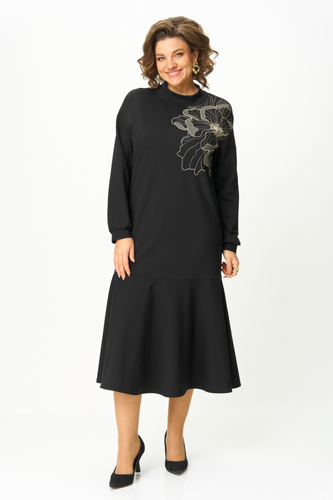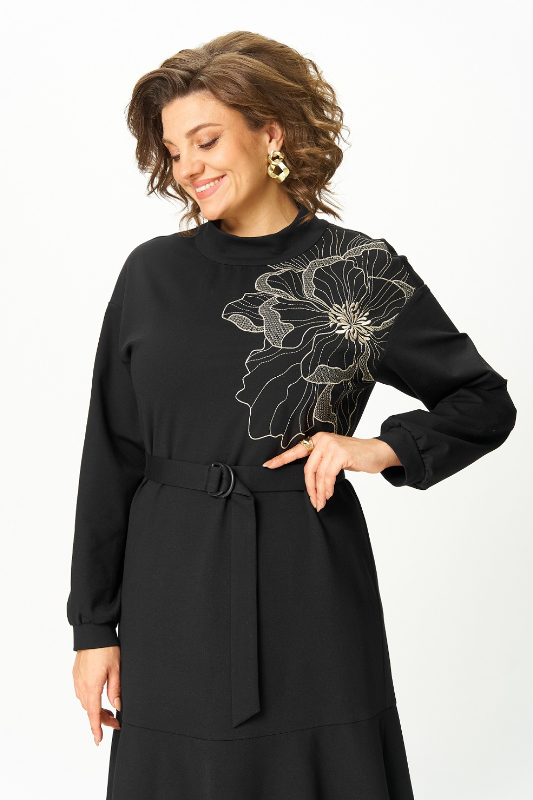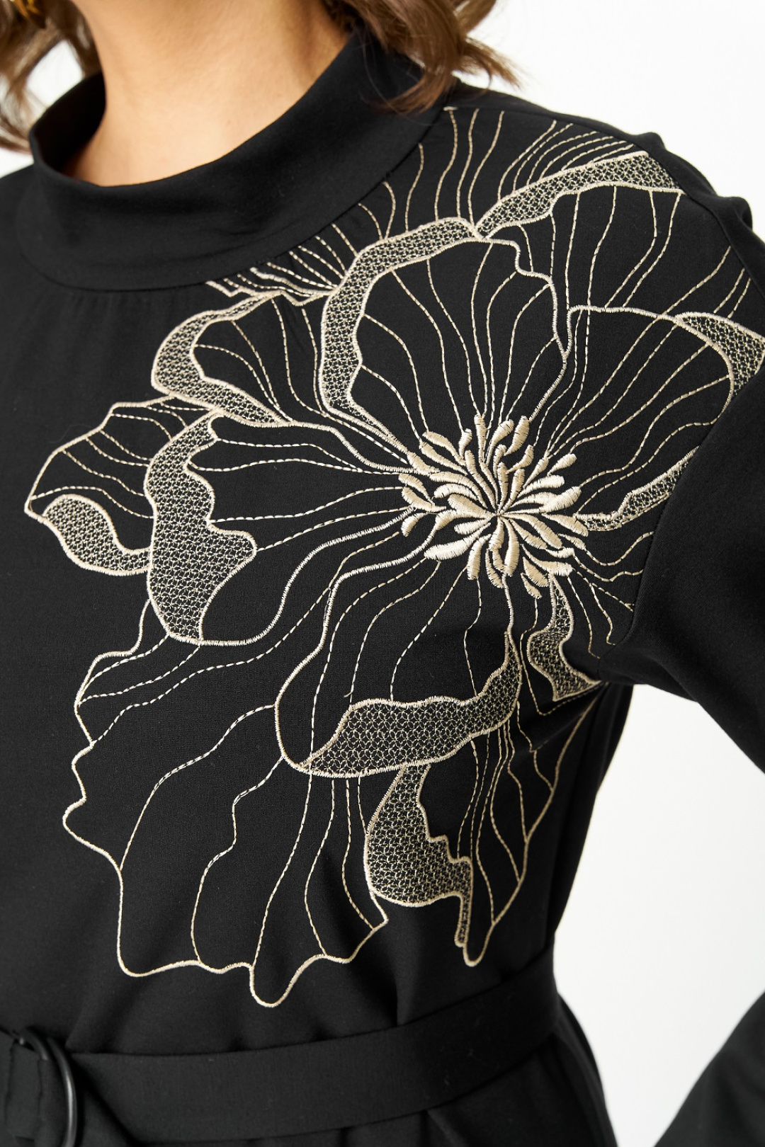 Элегантное черное платье из трикотажного полотна, выполнено в прямом силуэте, которое подчеркнет вашу фигуру с изысканной простотой. Платье дополнено оригинальной деталью — спущенной линией плеча, добавляющей нотку модернизма. Нижняя часть изделия оформлена воланом, придающим изящный объем и динамичность образу. Рукава длиной в 64 см на притачной манжете идут в унисон общему стилю, а круглый вырез горловины и стойка воротника элегантно завершают верхнюю часть платья. За спиной предусмотрен средний шов и удобная застежка на молнию, что обеспечивает отличную посадку. Съемный пояс из основной ткани с пряжкой подчеркивает талию, позволяя варьировать акценты в зависимости от предпочтений. Длина платья по спинке составляет 120 см, что делает его идеальным выбором для различных мероприятий. Дизайн дополняет эффектный белый принт в виде цветка на передней части, придающий образу уникальность и изысканность. Это платье станет прекрасным дополнением к вашему гардеробу, подходя как для офисных встреч, так и для вечерних выходов.