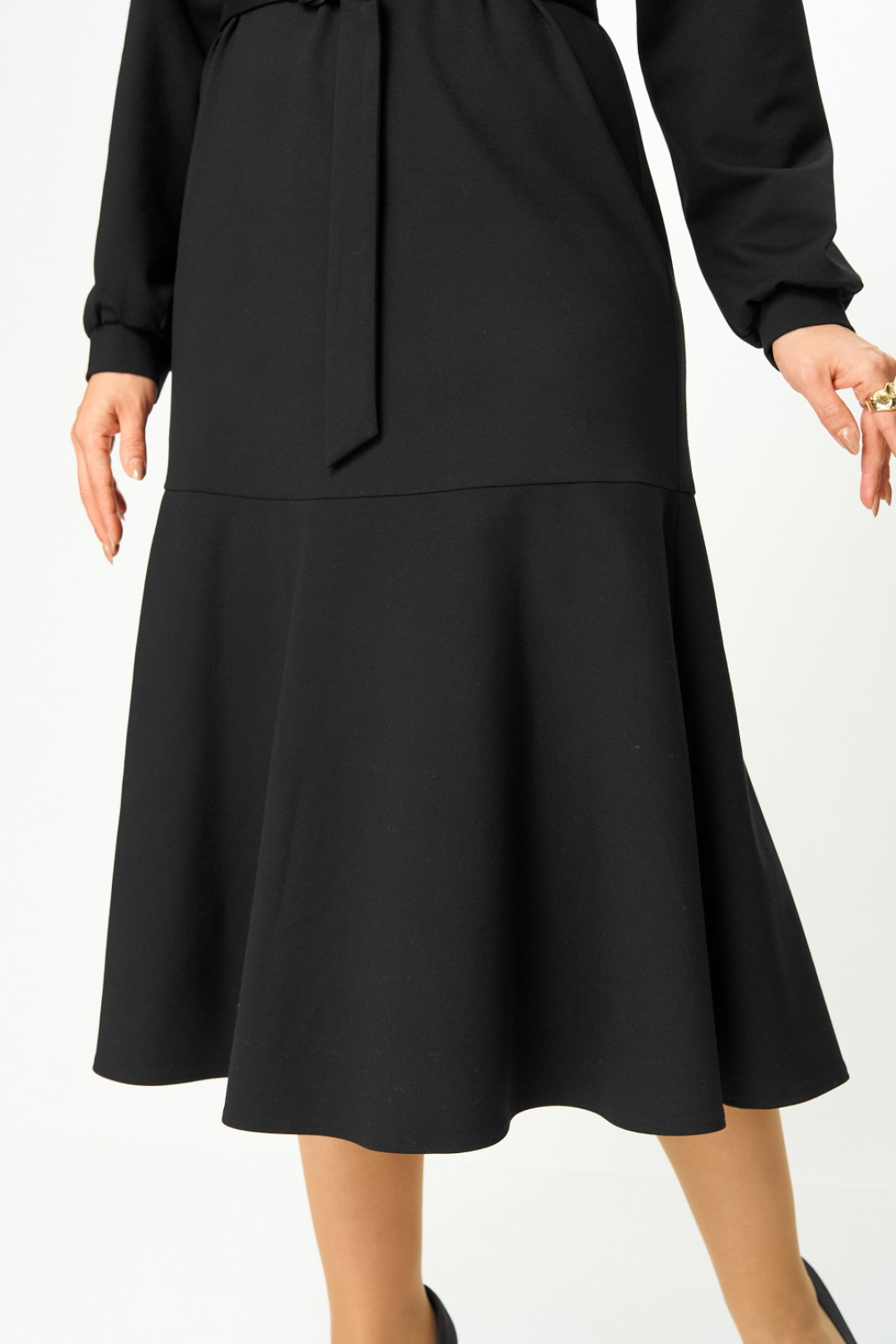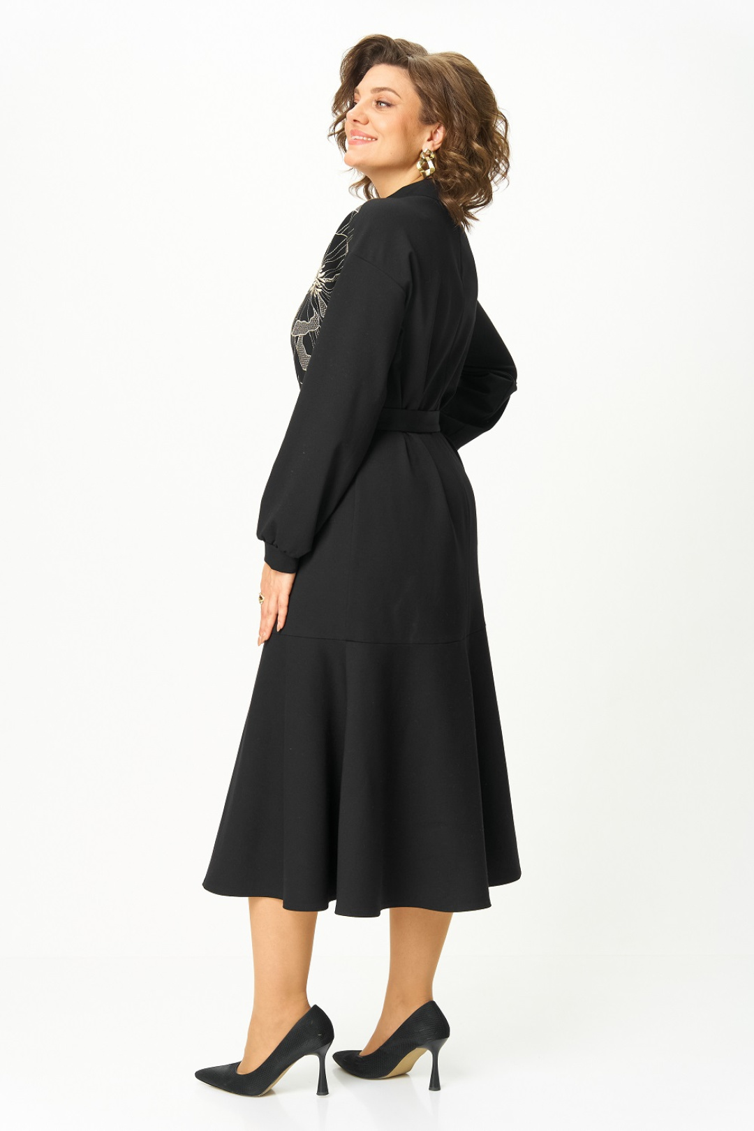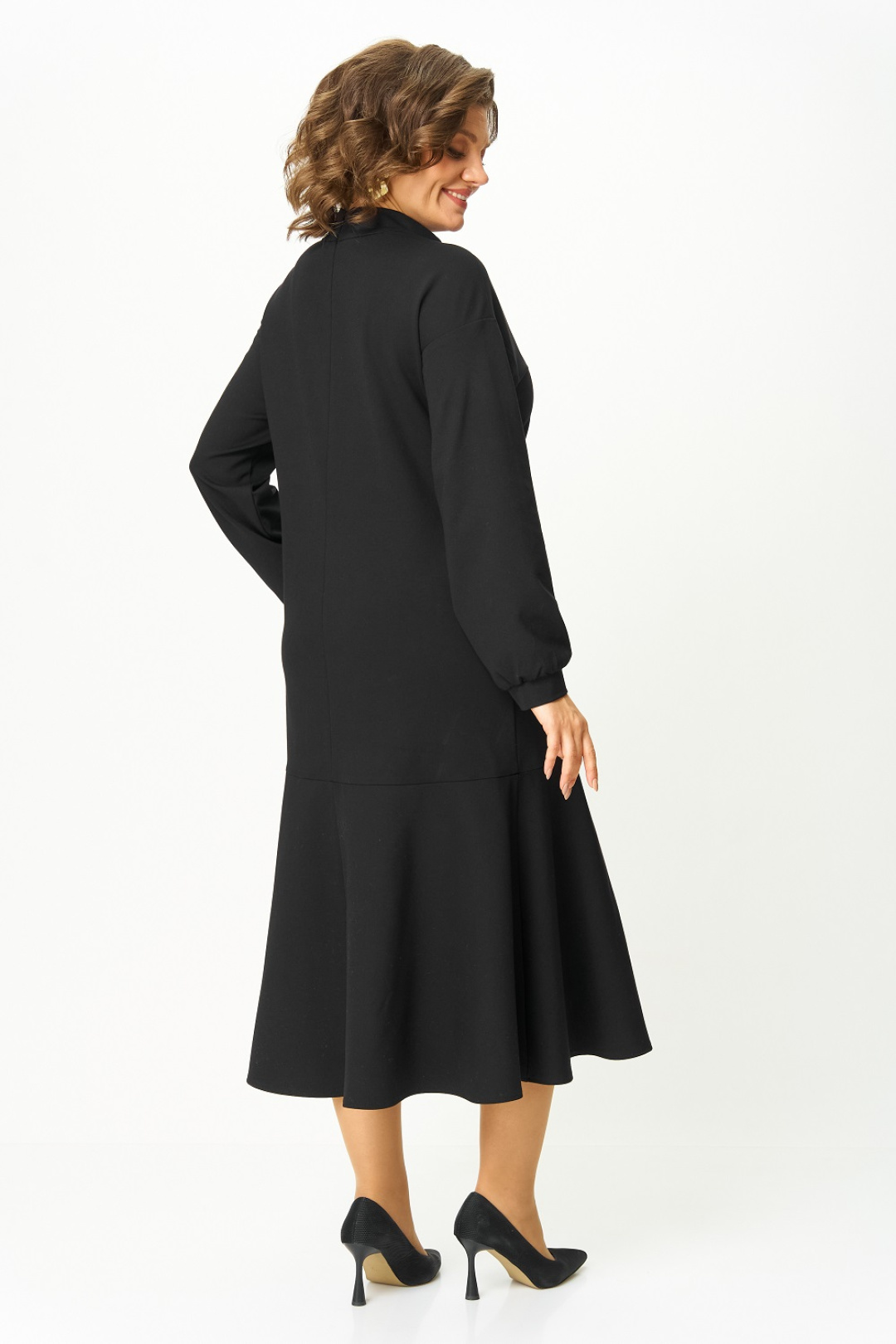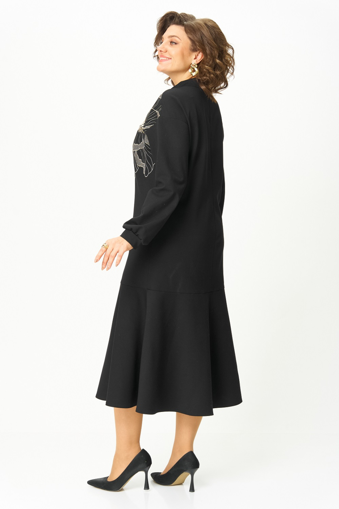Элегантное черное платье из трикотажного полотна, выполнено в прямом силуэте, которое подчеркнет вашу фигуру с изысканной простотой. Платье дополнено оригинальной деталью — спущенной линией плеча, добавляющей нотку модернизма. Нижняя часть изделия оформлена воланом, придающим изящный объем и динамичность образу. Рукава длиной в 64 см на притачной манжете идут в унисон общему стилю, а круглый вырез горловины и стойка воротника элегантно завершают верхнюю часть платья. За спиной предусмотрен средний шов и удобная застежка на молнию, что обеспечивает отличную посадку. Съемный пояс из основной ткани с пряжкой подчеркивает талию, позволяя варьировать акценты в зависимости от предпочтений. Длина платья по спинке составляет 120 см, что делает его идеальным выбором для различных мероприятий. Дизайн дополняет эффектный белый принт в виде цветка на передней части, придающий образу уникальность и изысканность. Это платье станет прекрасным дополнением к вашему гардеробу, подходя как для офисных встреч, так и для вечерних выходов.