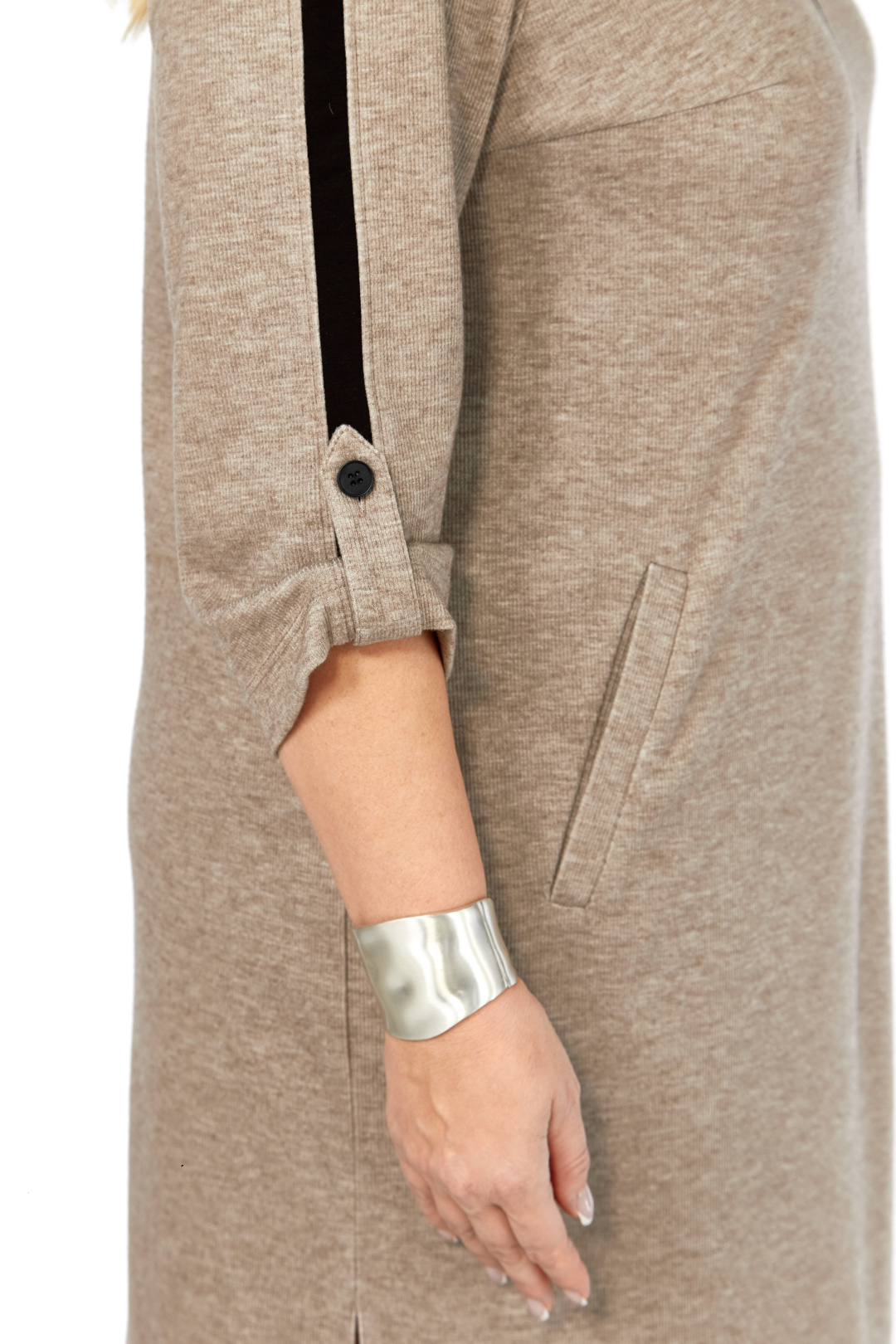 Стильное трикотажное платье с рукавом реглан выдержано в лаконичном дизайне и легко вписывается в базовый гардероб. Модель выполнена из мягкого эластичного трикотажа, комфортно садится по фигуре и обеспечивает свободу движений. Перед с нагрудными вытачками, планками горловины, застёжкой на акцентную молнию. Спинка со средним швом. В боковых швах разрезы. Рукав покроя реглан с вертикальной вставкой из отделочного материала, снизу присобран патой.